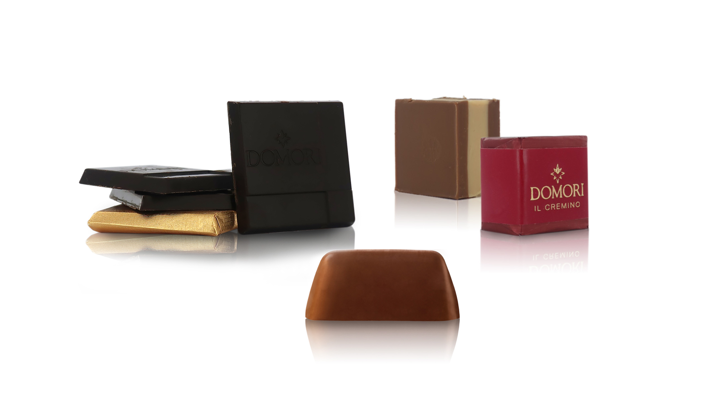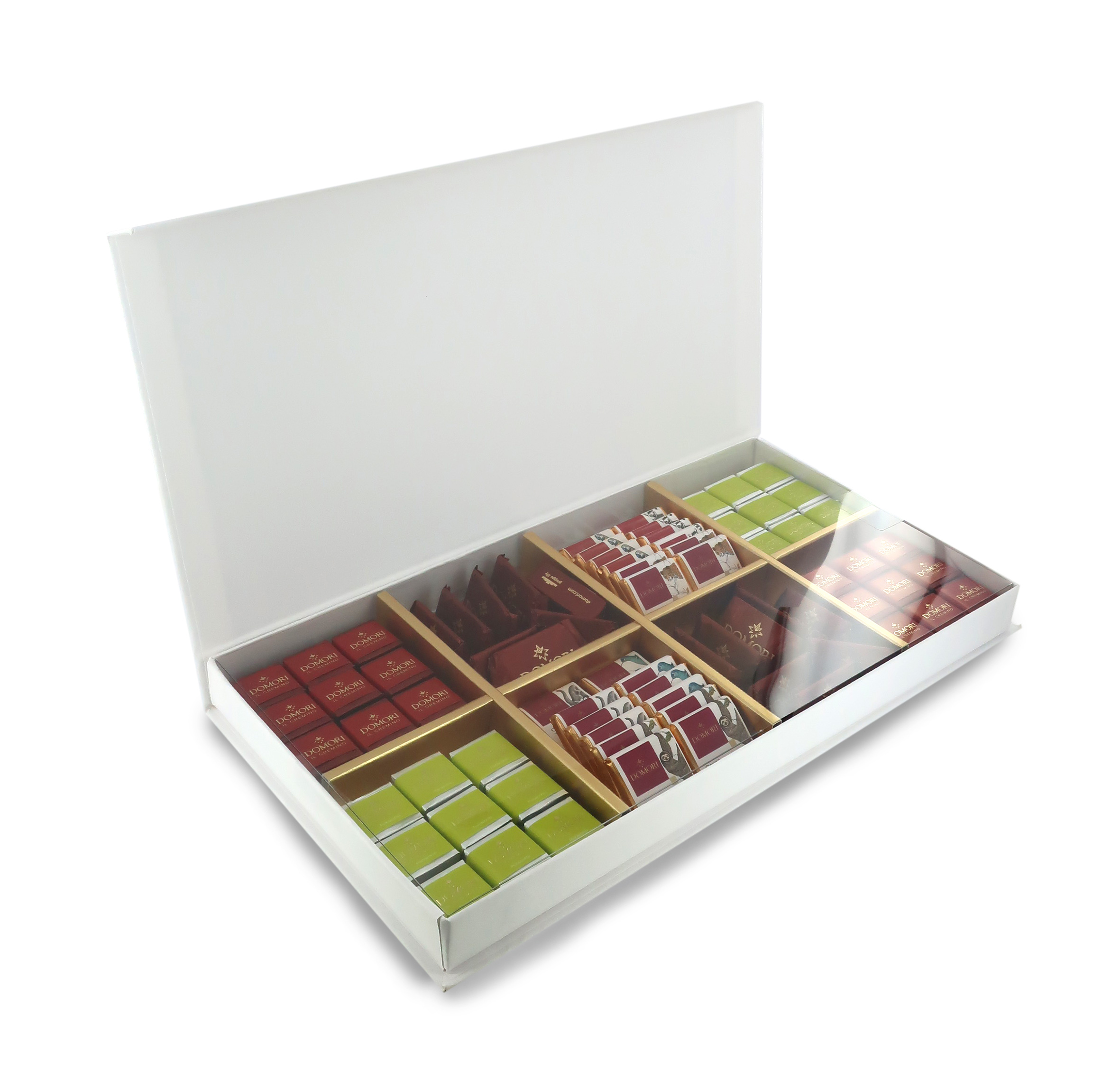 Selezione di cioccolatini gourmet Domori racchiusa in un elegante cofanetto bianco abbellito da una copertina raffinata nei toni del blu navy e dell’oro.