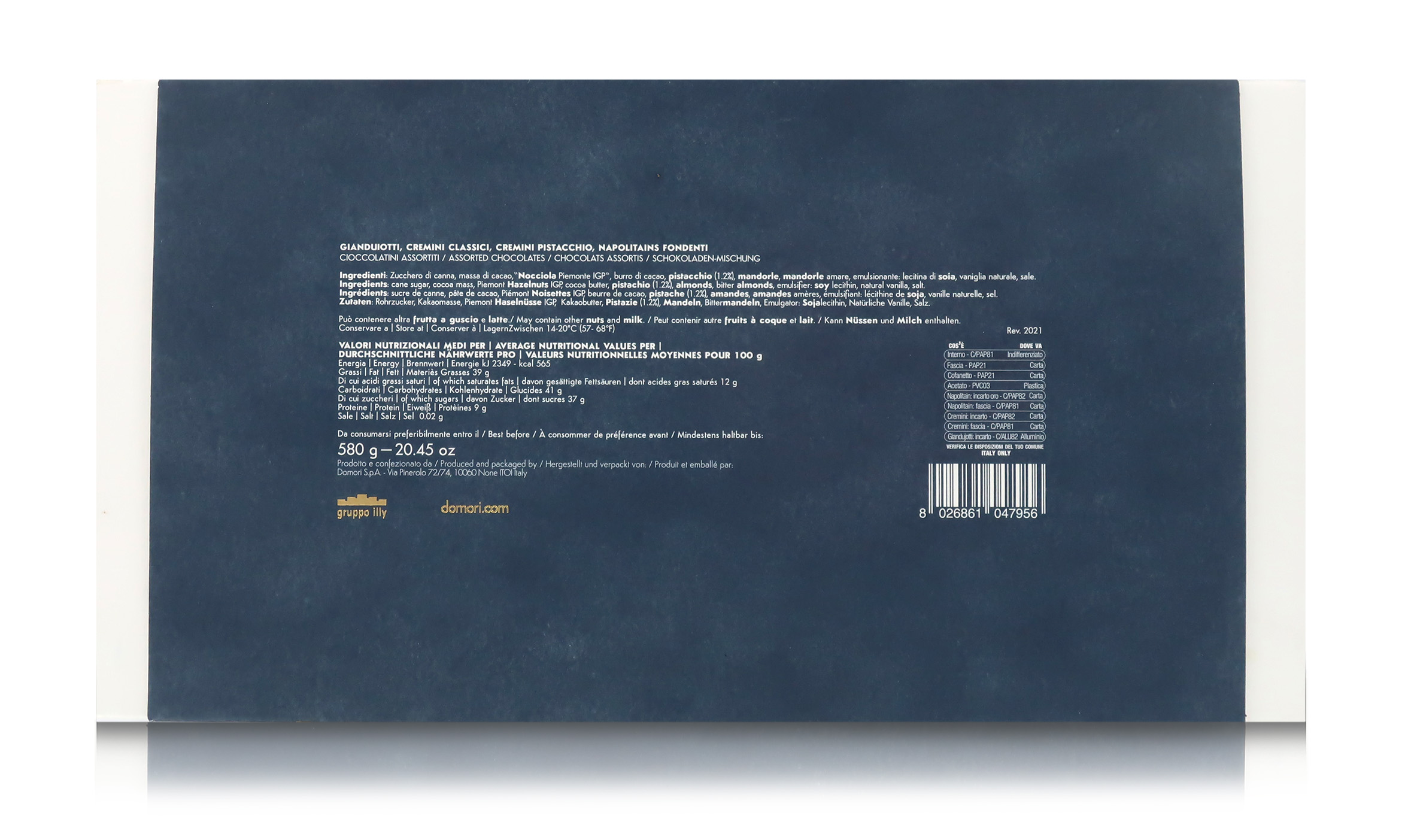 L’assortimento di fine cioccolato include 16 giandujotti classici, 18 cremini pistacchio, 18 cremini classici e 28 napolitains Single Origins, per un totale di 80 cioccolatini pari a 580g / 20.45oz.