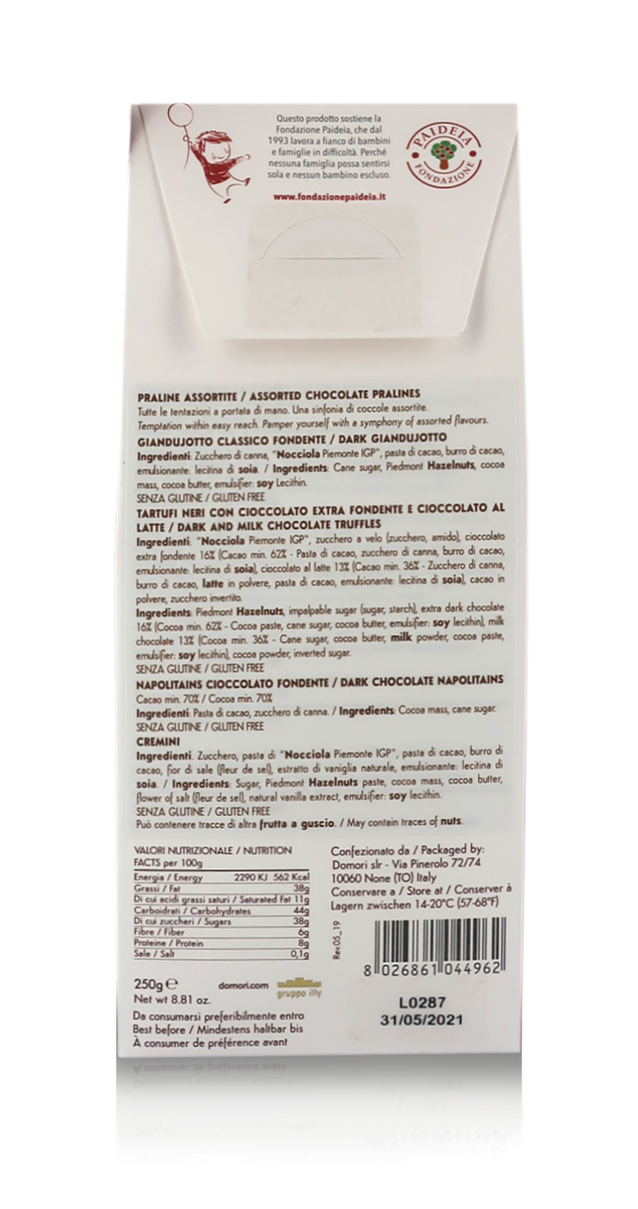 Una tanto pratica quanto raffinata pochette dalla linea moderna include una ricca selezione di classici cioccolatini, in cui il gusto del cacao di grande qualità Domori e il sapore pieno della Nocciola Piemonte IGP sono protagonisti. L'assortimento, che prevede che ogni cioccolatino sia incartato singolarmente, è destinato ad accontentare tutti i palati, anche quelli più sopraffini. Questa selezione di cioccolatini è particolarmente indicata come idea regalo per un amico estimatore di cioccolato, o per organizzare una serata di degustazione di cioccolato gourmet coi vostri amici. Questa selezione di cioccolatini si caratterizza per il rispetto della tradizione; infatti, non mancano i giandujotti e nemmeno i cremini classici, in più i tartufi neri e i napolitains... per chi non riesce a rinunciare alla tradizionale eleganza del gusto! Confezione da 250g di cioccolato sfuso misto; la selezione consta di: