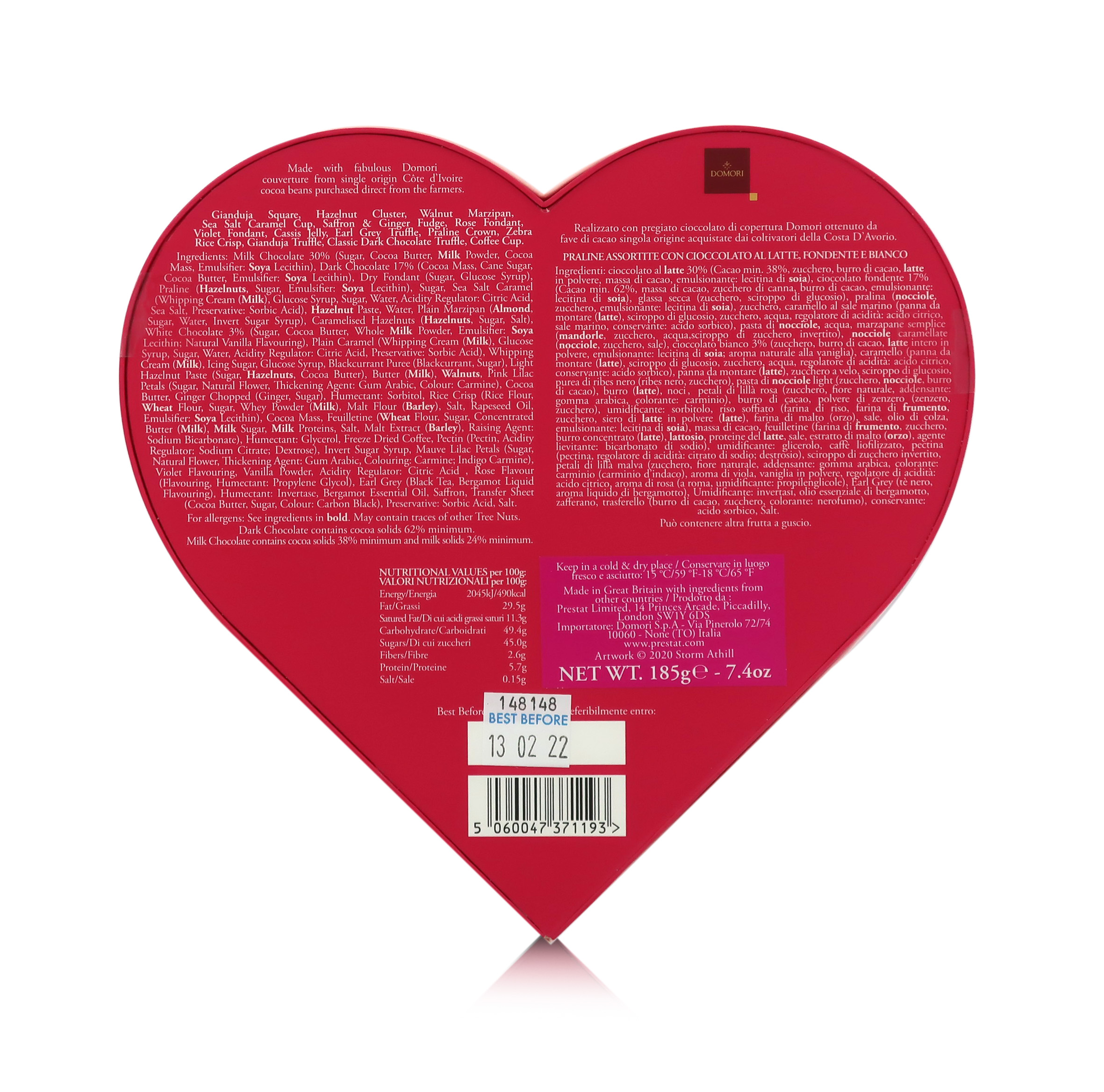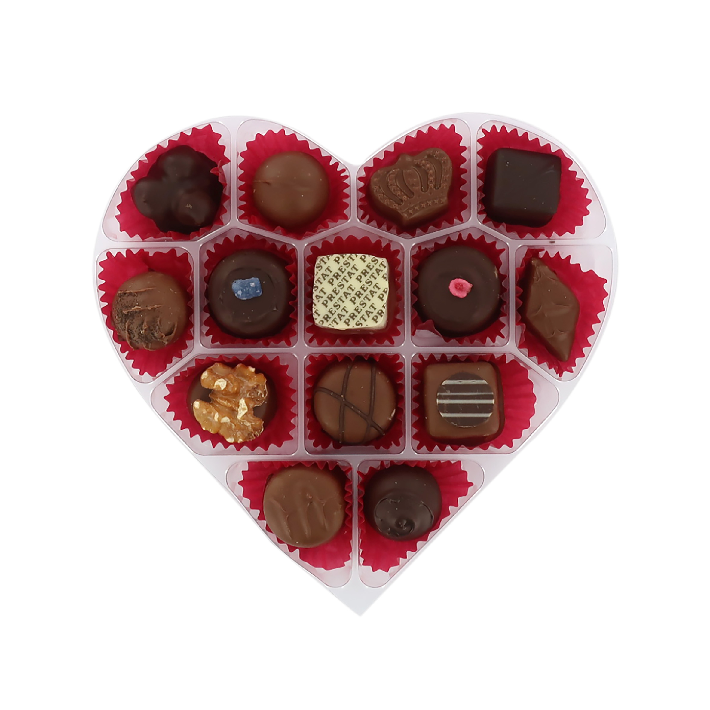 La scatola di San Valentino di Prestat contiene un assortimento irresistibile in cui il cioccolato fondente, al latte e bianco, proposti in varie declinazioni, sono protagonisti.