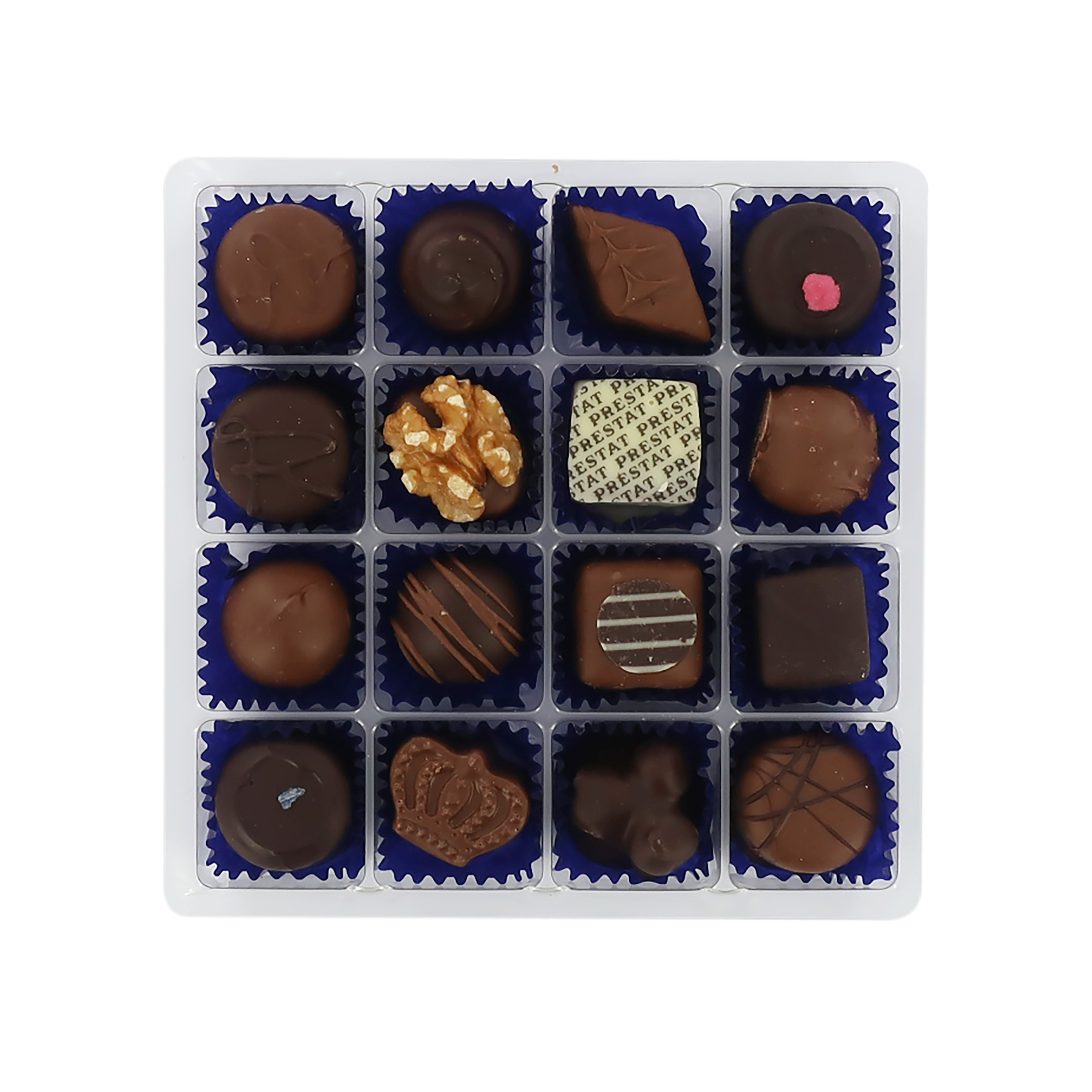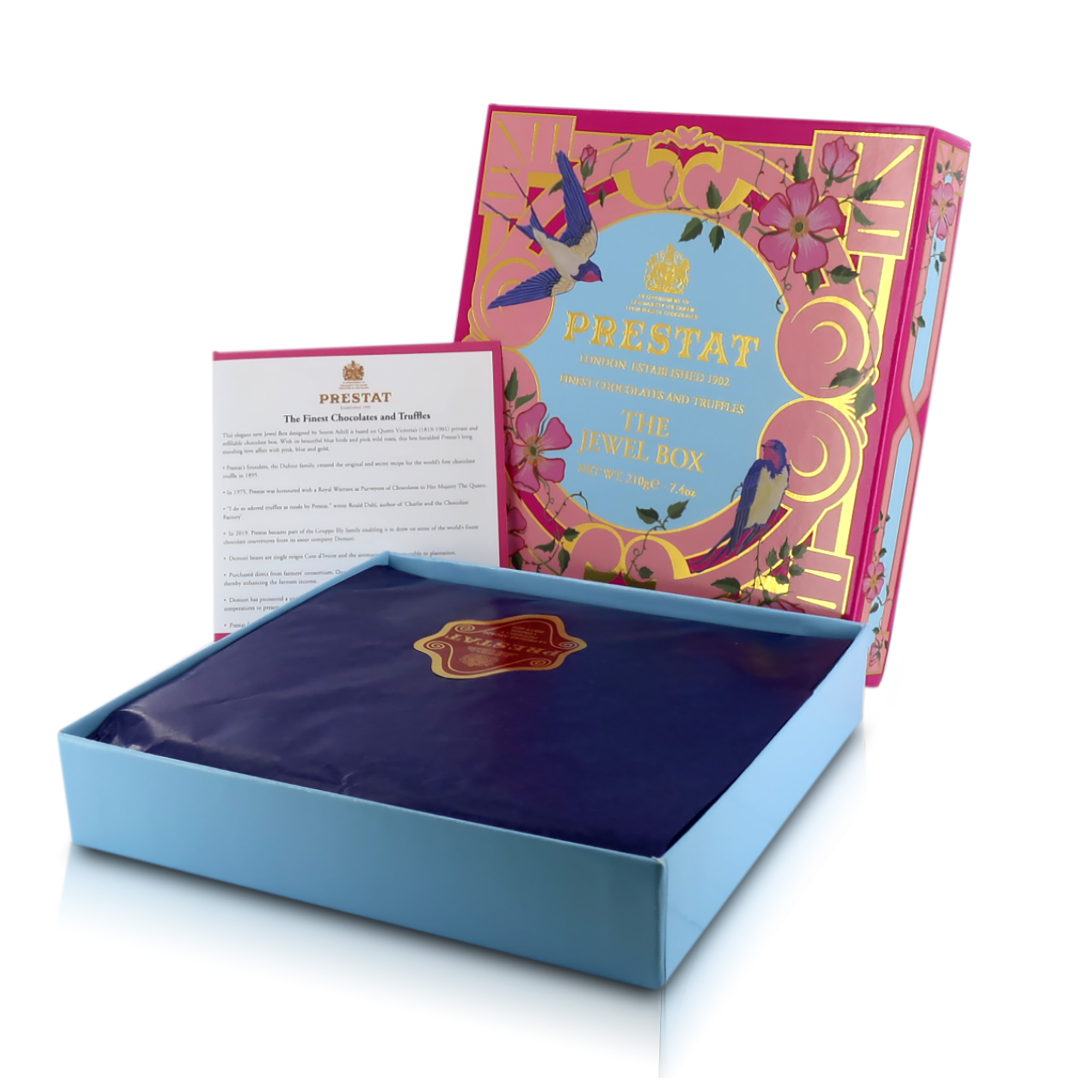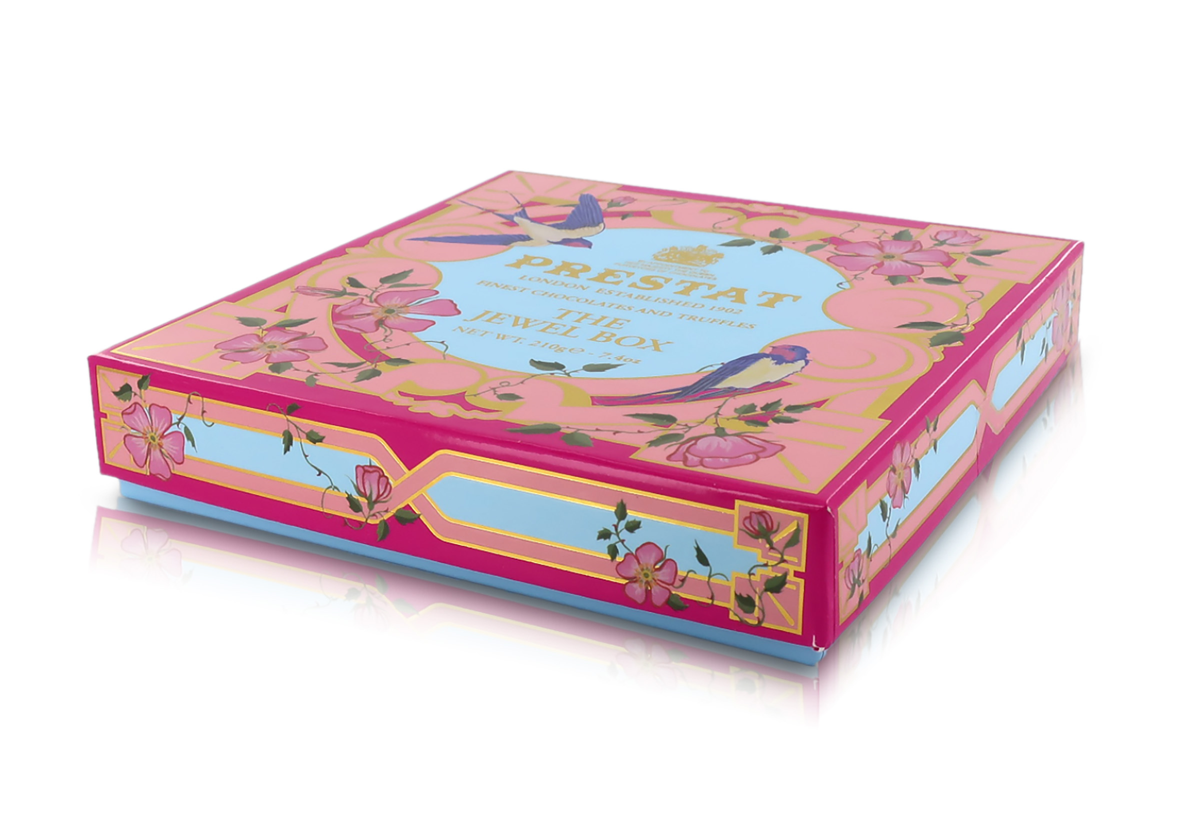La Jewel Box è tra i pezzi forti dello sfarzoso assortimento Prestat. Questa confezione particolare è ispirata alla scatola di cioccolatini personale della Regina Vittoria, regolarmente rifocillata dai collaboratori delle Cucine Reali. La finissima selezione comprende 16 praline, tra cui fondant alla rosa, alla viola e al lampone, praline con marzapane e noci, ganache, gelatine e tartufi.