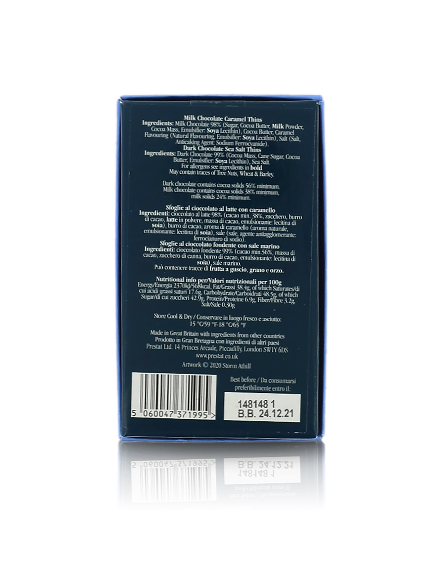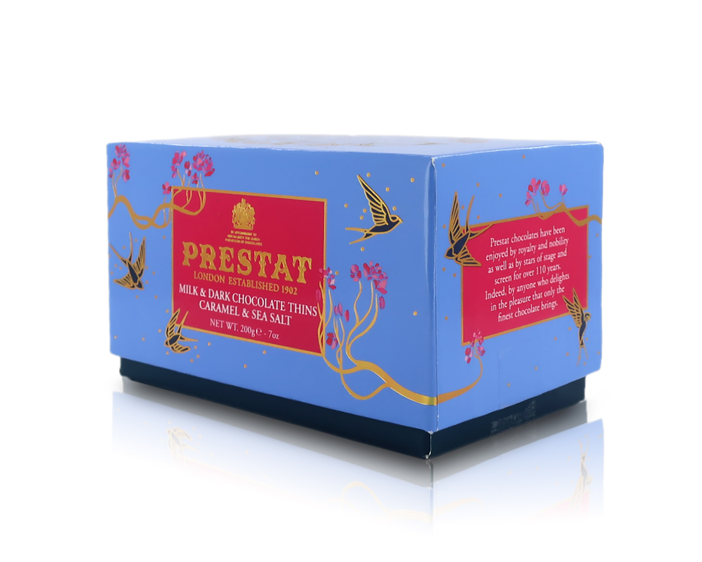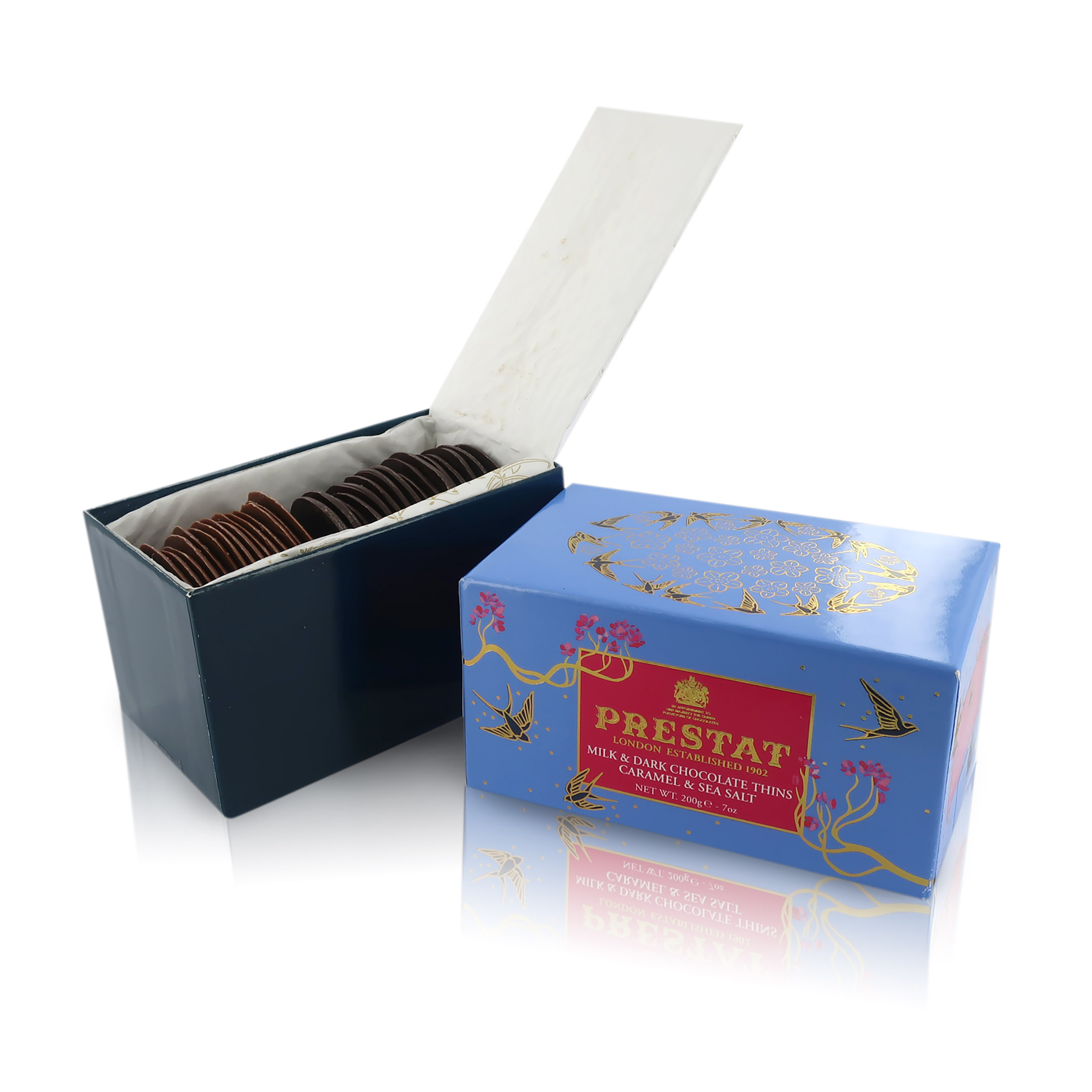 Il bellissimo cofanetto rettangolare di color azzurro e rosso acceso custodisce delle sottili sfoglie di cioccolato assortito, al latte o fondente, delicate nell'aspetto ma piene di gusto. Il sapore del fine cioccolato al latte e fondente è ben esaltato dalla sapidità donata dal sale marino che caratterizza queste dolci creazioni. La variante al cioccolato al latte è ulteriormente arricchita da goloso caramello. Una commistione di sapori contrastanti ma ben bilanciati, che ben convivono in queste sottili sfoglie di cioccolato, apprezzate dalla Casa Reale Inglese e dalla nobiltà tanto quanto dalle stelle del mondo dello spettacolo.