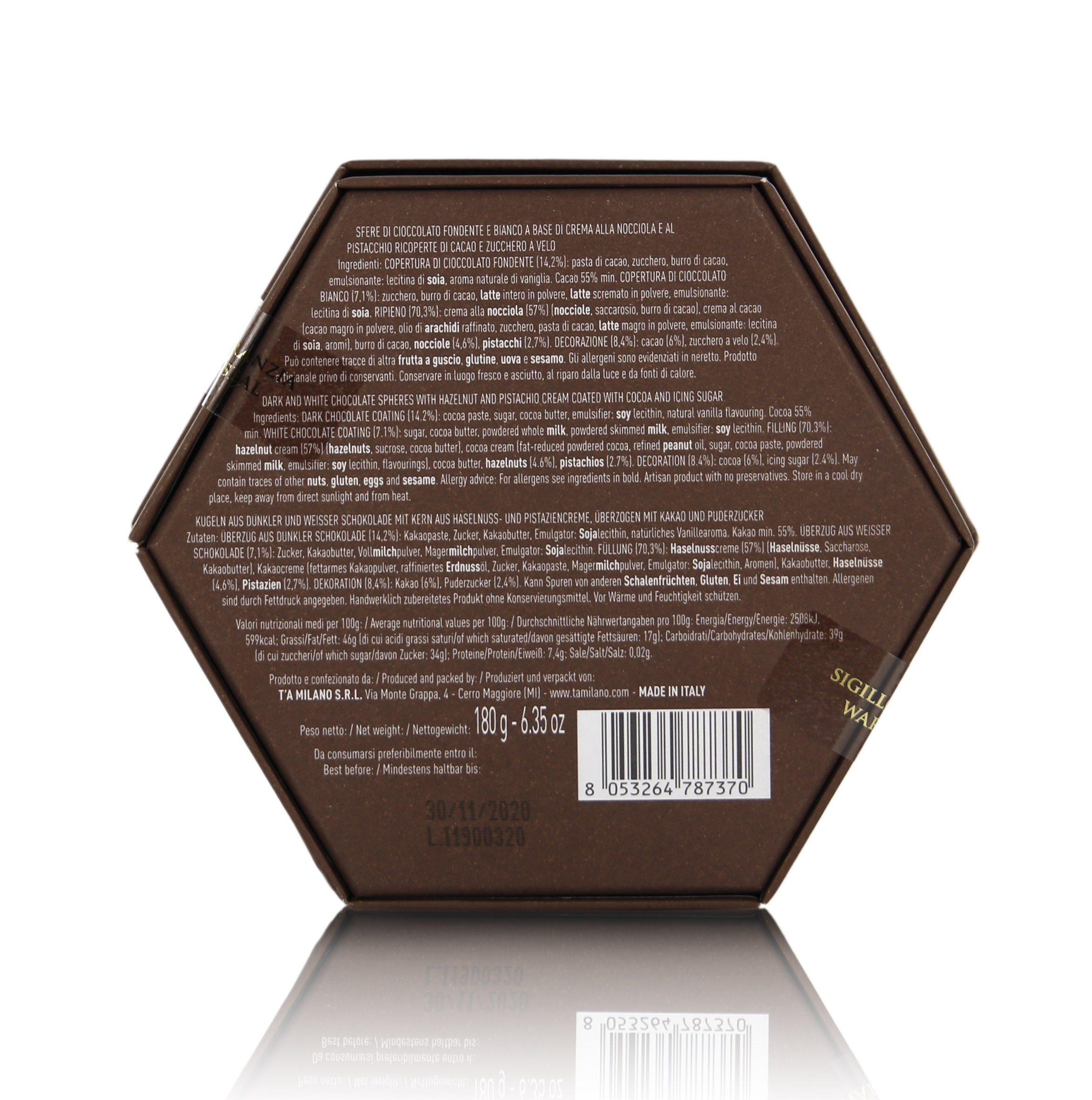 Una elegante confezione esagonale racchiude 21 tartufini in 3 gusti: 7 al cioccolato fondente, 7 al cioccolato fondente al pistacchio e 7 al cioccolato bianco. Per mantenerne l'integrità e fare in modo che risaltino in tutta la loro bellezza, i tartufi sono riposti in appositi alloggiamenti sagomati e disposti su tre livelli. La variante al pistacchio vanta un ripieno cremoso a base di nocciola aromatizzato al pistacchio, mentre quelli al cioccolato bianco offrono cuore cremoso alla nocciola. I tartufini sono realizzati con cioccolato artigianale. I tartufini col cioccolato fondente sono ricoperti di cacao in polvere, mentre quelli col cioccolato bianco sono rivestiti da uno soffice strato di zucchero a velo. Sono perfetti da offrire ai vostri ospiti insieme al caffè o come piccolo regalo per gli amanti dei dolci.