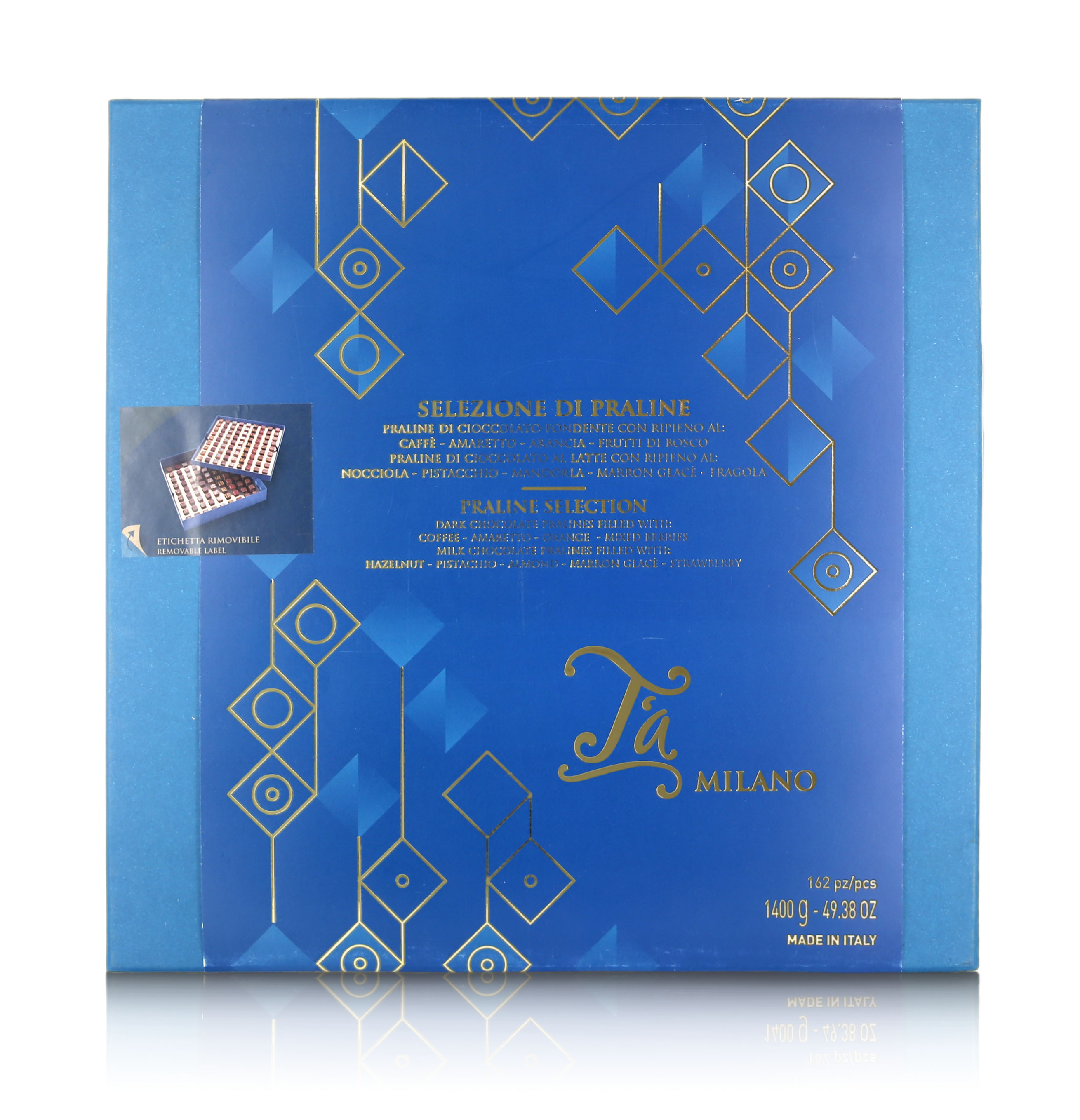 Una confezione colorata racchiude dolci tesori creati artigianalmente: 162 praline al cioccolato al latte e al fondente, con ripieni dai diversi gusti e con decori eseguiti a regola d'arte. Sono tanto belle da vedere quanto buone da gustare. Grazie ai loro gusti, queste praline di cioccolato offrono un viaggio tra le eccellenze italiane: nocciola, pistacchio, mandorla, fragola, marron glacé, caffè, arancia, frutti di bosco e amaretto. Sono una idea regalo perfetta, dall'effetto "wow" garantito.
