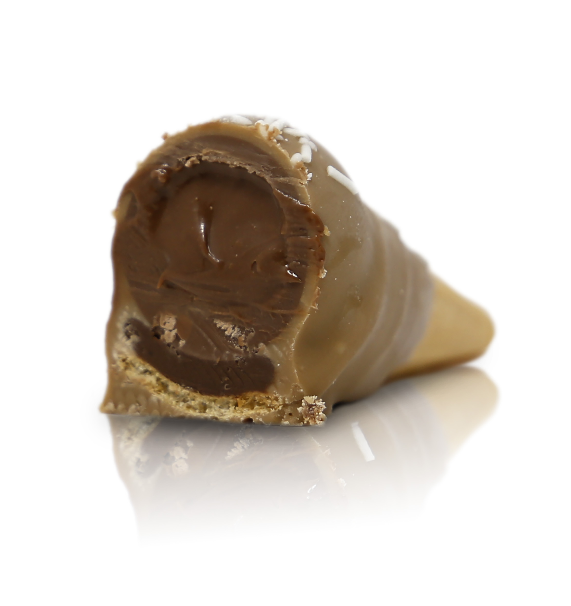 I mini coni al frutto della passione reinterpretano in chiave golosa il formato "cono gelato", riproponendolo sotto forma di veloce e pratico snack a base di deliziose creme e cioccolato. Su una cialda croccante, ripiena di crema alla nocciola, trova posto una deliziosa sfera al frutto della passione ricoperta da un generoso strato di particolarissimo cioccolato biondo e codette di zucchero. Incartati singolarmente, i mini coni al frutto della passione renderanno le vostre pause ancora più gustose.