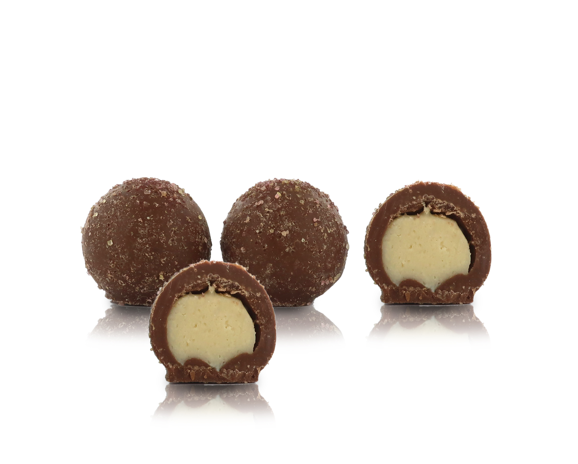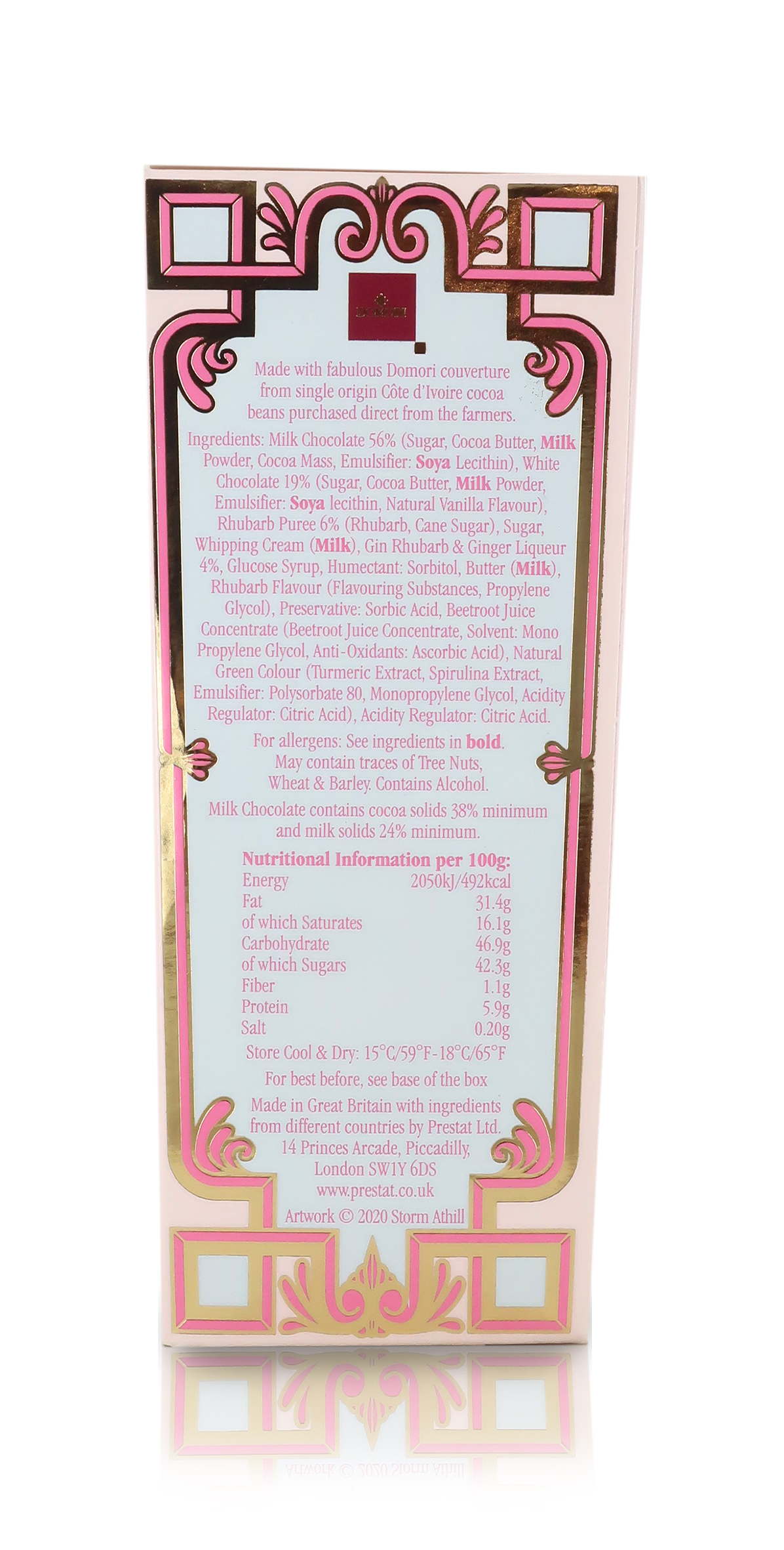 Iconici tartufi di cioccolato Prestat al gin, rabarbaro e zenzero in elegante scatola regalo di cartoncino leggero e dalla forma insolita, nei colori rosa pastello, verde e azzurro, da 175g. Una morbida ganache alcolica aromatizzata al gin di Edimburgo, rabarbaro e zenzero, ispirata alla tipica crostata con crema e rabarbaro, è avvolta da uno strato di fine cioccolato al latte Domori ottenuto da cacao Single Origin (cacao min. 38%). Perfetta come idea regalo da sola o in un cesto natalizio con altre specialità dolci.