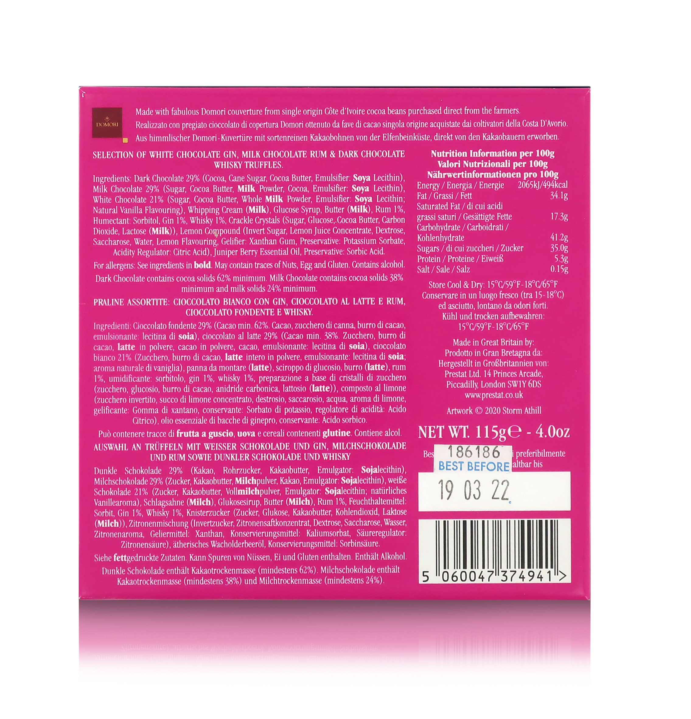 Scatola di tartufi di cioccolato ripieni con ganache alcolica in vari gusti. La selezione di tartufi Prestat, la cui copertura è realizzata con finissimo cioccolato Domori Single Origin, offre i seguenti abbinamenti: cioccolato bianco e gin, cioccolato al latte e rum, cioccolato fondente e whisky. L’elegante cofanetto color blu scuro sarà un regalo perfetto per gli estimatori del cioccolato e degli alcolici, tanto per Natale quanto durante il resto dell’anno.