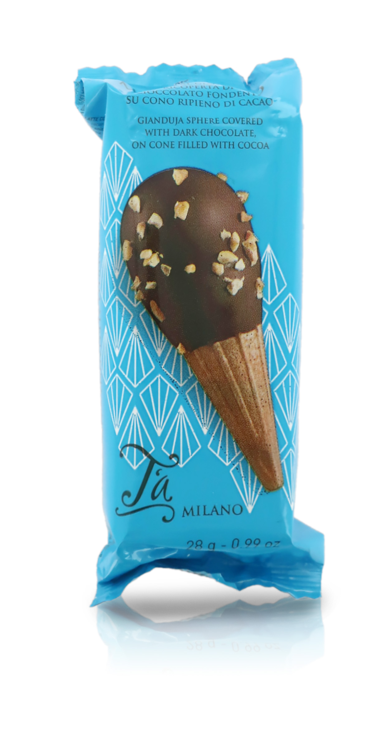 I mini coni al gianduia reinterpretano in chiave più golosa l'iconico cono gelato. Su una cialda croccante, ripiena di crema al cacao, trova posto una sfera di cioccolato al gianduia, con generosa copertura al cioccolato fondente. Incartati singolarmente, rappresentano uno sfizioso snack dolce.