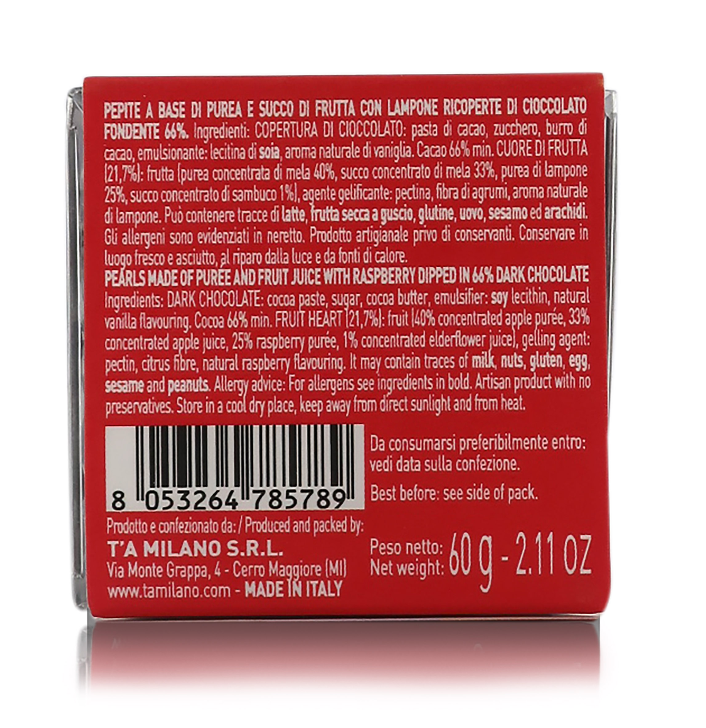 Ingredienti: copertura di cioccolato [pasta di cacao, zucchero, burro di cacao, emulsionante: lecitina di SOIA, aroma naturale di vaniglia. Cacao: 66% min.], cuore di frutta 21,7% [frutta (purea concentrata di mela 40%, succo concentrato di mela 33%, purea di lampone 25%, succo concentrato di sambuco 1%), agente gelificante: pectina, fibra di agrumi, aroma naturale di lampone]. Può contenere tracce di LATTE, FRUTTA SECCA A GUSCIO, GLUTINE, UOVO, SESAMO e ARACHIDI. Allergeni in maiuscolo. Prodotto artigianale privo di conservanti.