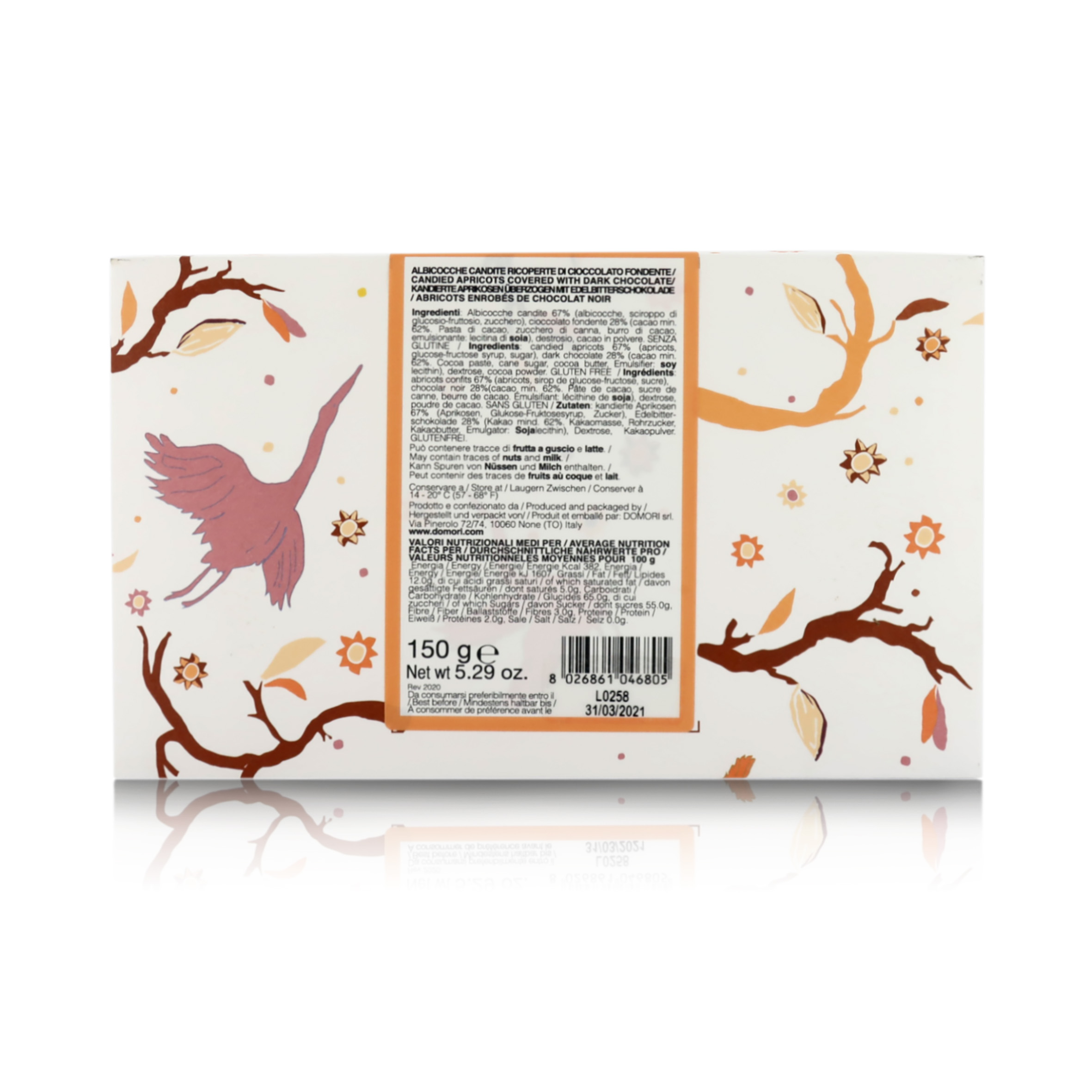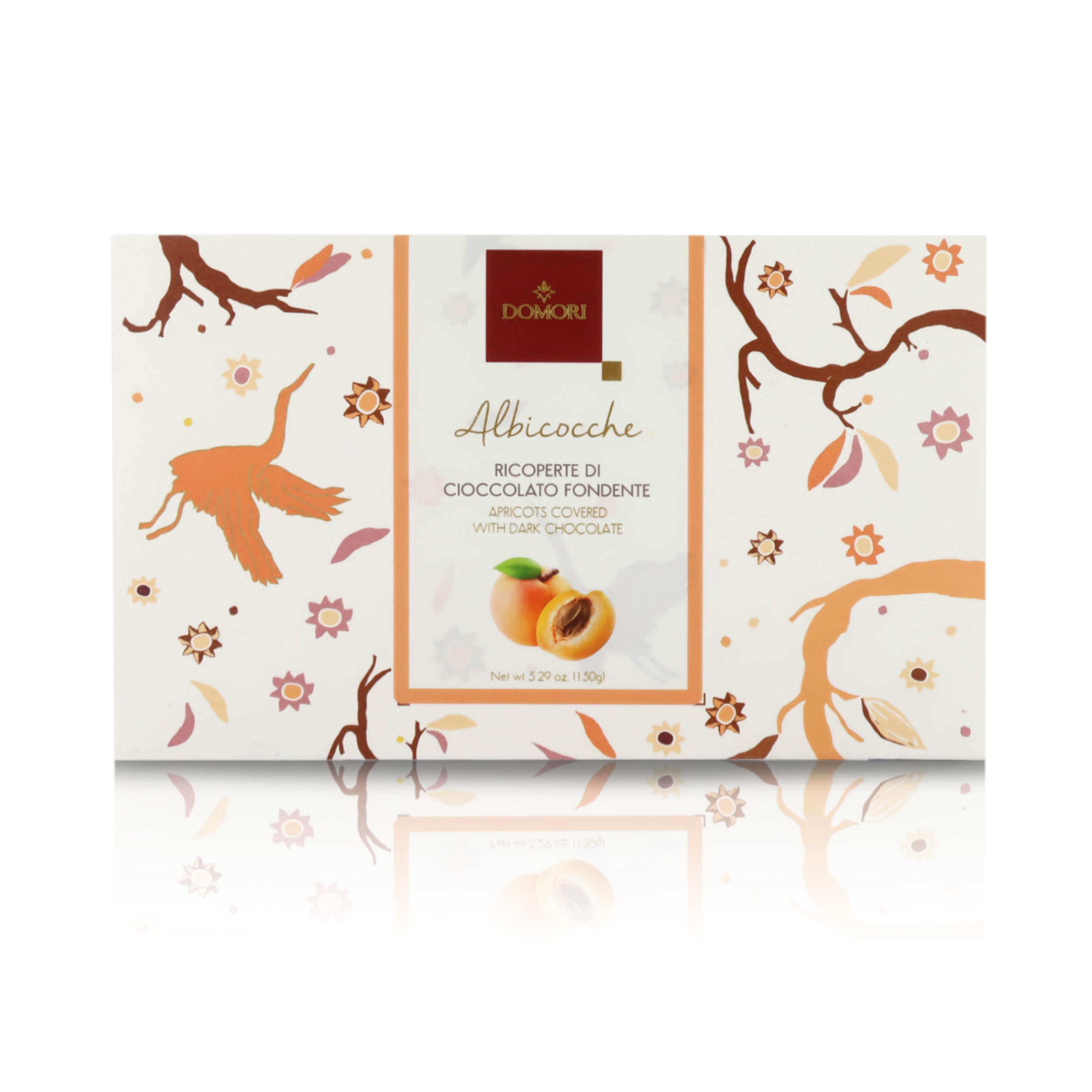 L'innovazione Domori ha portato la casa cioccolatiera a proporre un accostamento molto inusuale: mezzene di dolci albicocche sapientemente candite da Agrimontana incontrano l'aroma intenso del cioccolato fondente di alta qualità di varietà Arriba (Ecuador). I pezzi di albicocca ricoperti di cioccolato sono lo snack gourmet ideale per le vostre dolci pause.