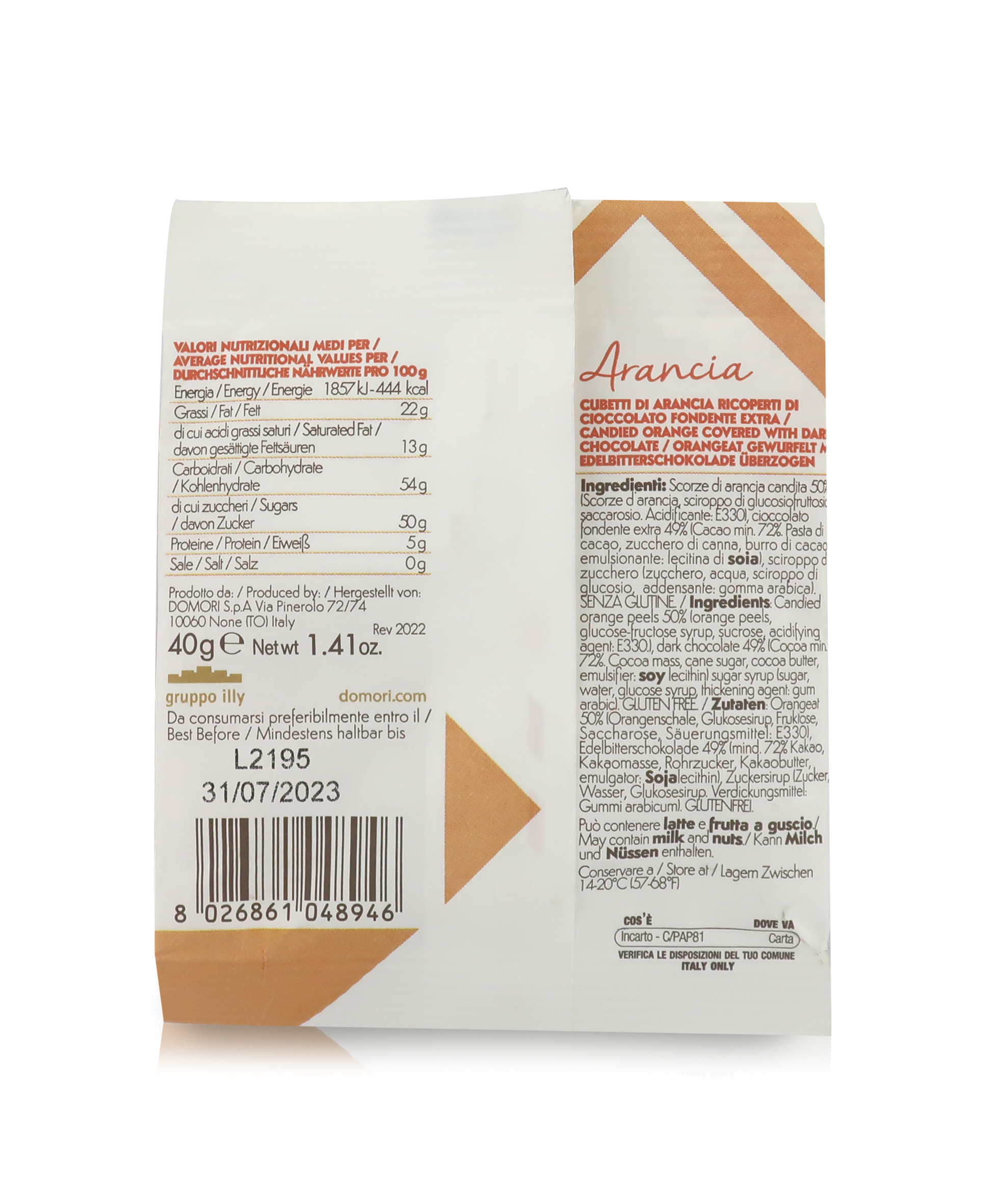 Ingredienti: cubetti di arancia candita (50% scorze d'arancia, sciroppo di glucosio-fruttosio, saccarosio, acidificante: E330), copertura di cioccolato fondente 72% (granella di cacao, zucchero di canna, burro di cacao, - emulsionante: lecitina di SOIA), destrosio, cacao in polvere, sciroppo di glucosio. Addensante: gomma arabica. SENZA GLUTINE.