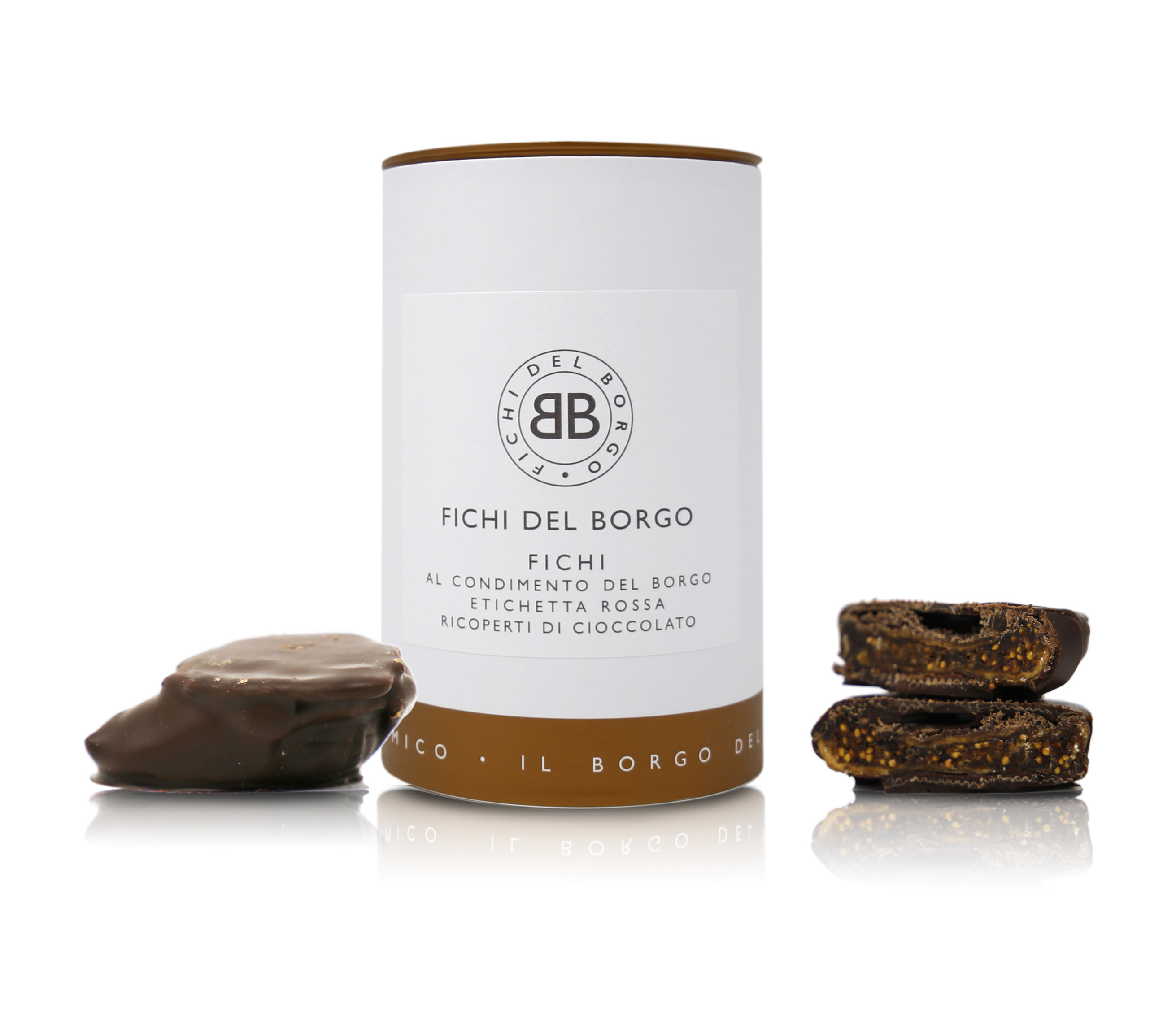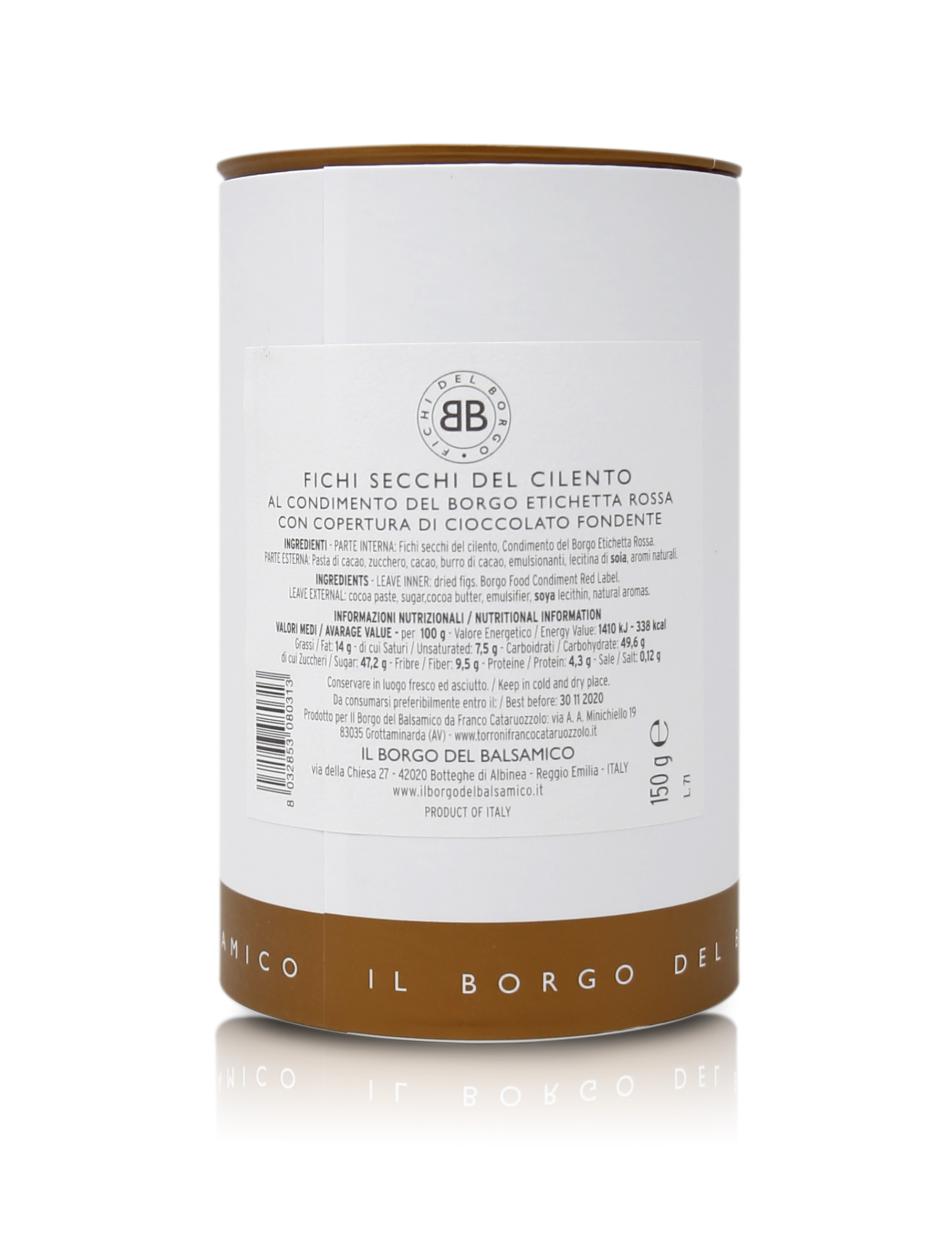 Fichi al Balsamico ricoperti di cioccolato fondente, 150 grammi. Confezionati in elegante scatola regalo, ottima per i fan della frutta secca ricoperta di cioccolato. Il gusto del balsamico dona a questi insoliti fichi secchi una nota gourmet.