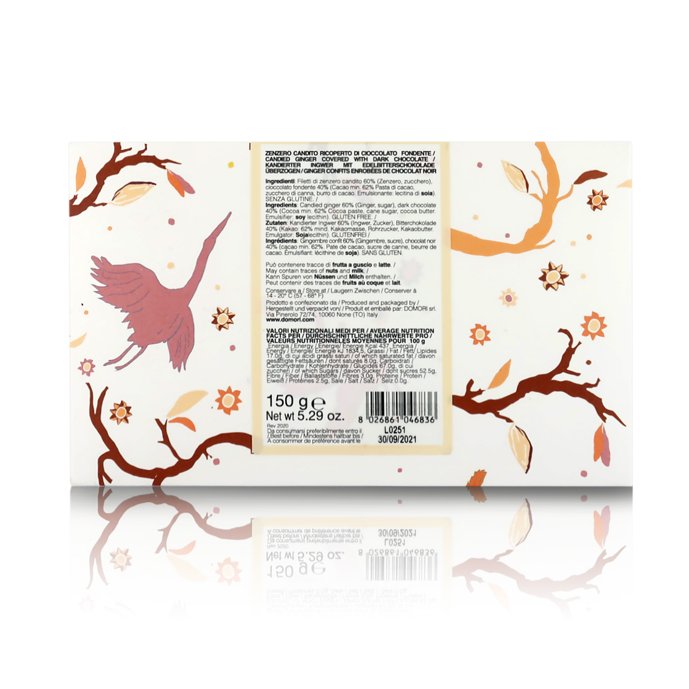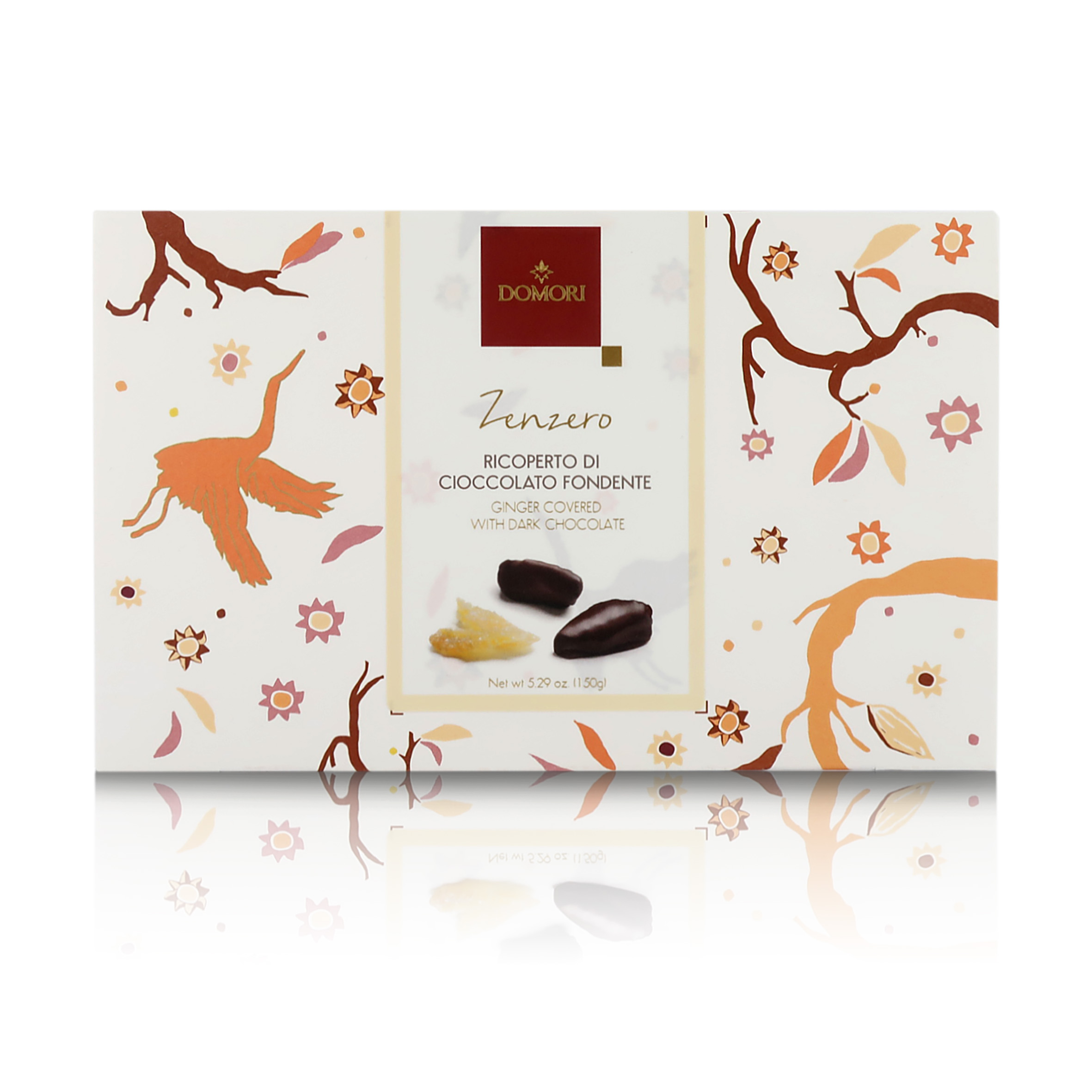 L'innovazione Domori ha portato la casa cioccolatiera a proporre un accostamento molto inusuale: la piccantezza di filetti di zenzero sapientemente selezionati e canditi da Agrimontana incontrano l'aroma intenso del cioccolato fondente di alta qualità di varietà Arriba (Ecuador). I filetti di zenzero candito ricoperti di cioccolato sono lo snack gourmet ideale per le vostre dolci pause.