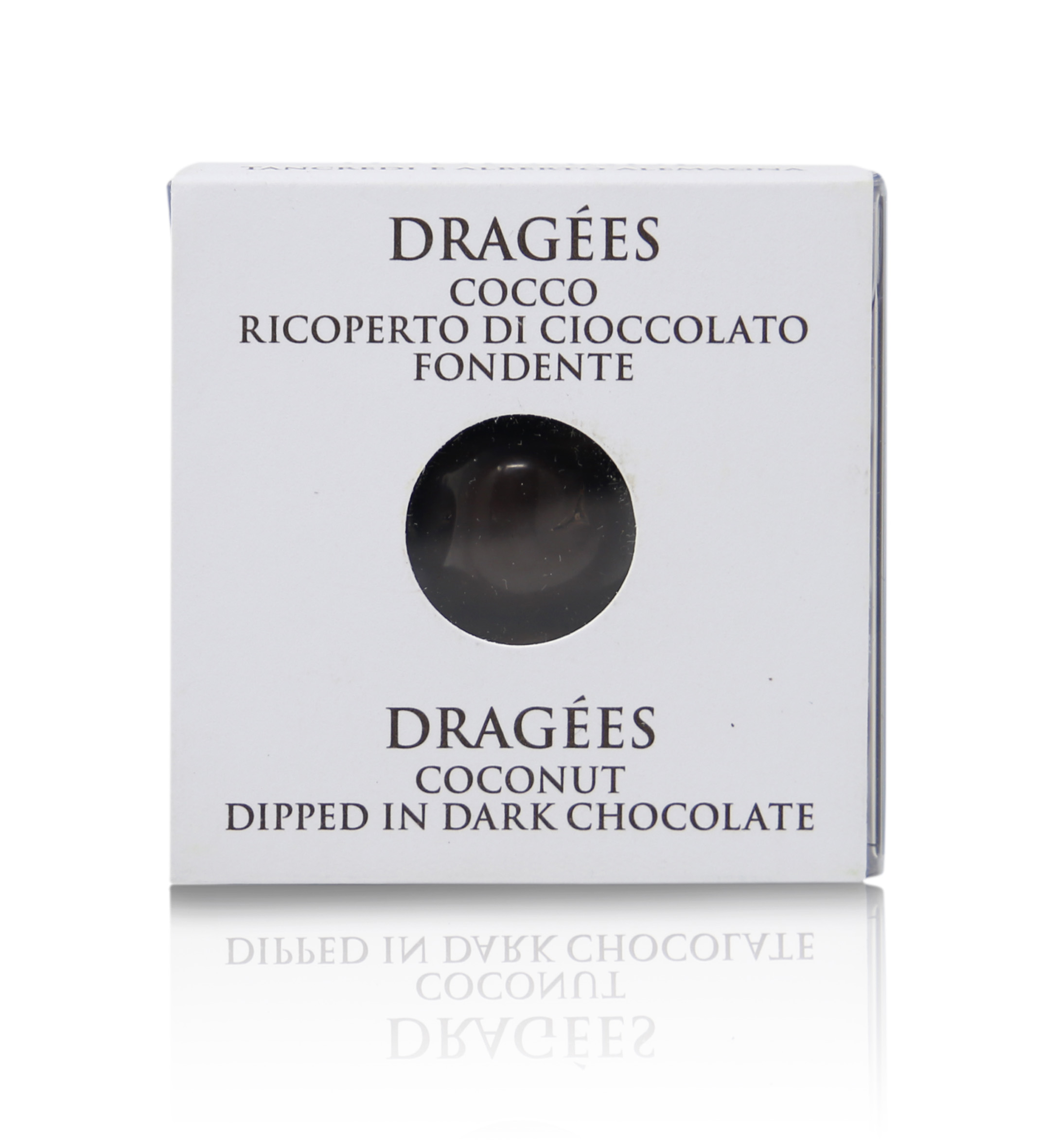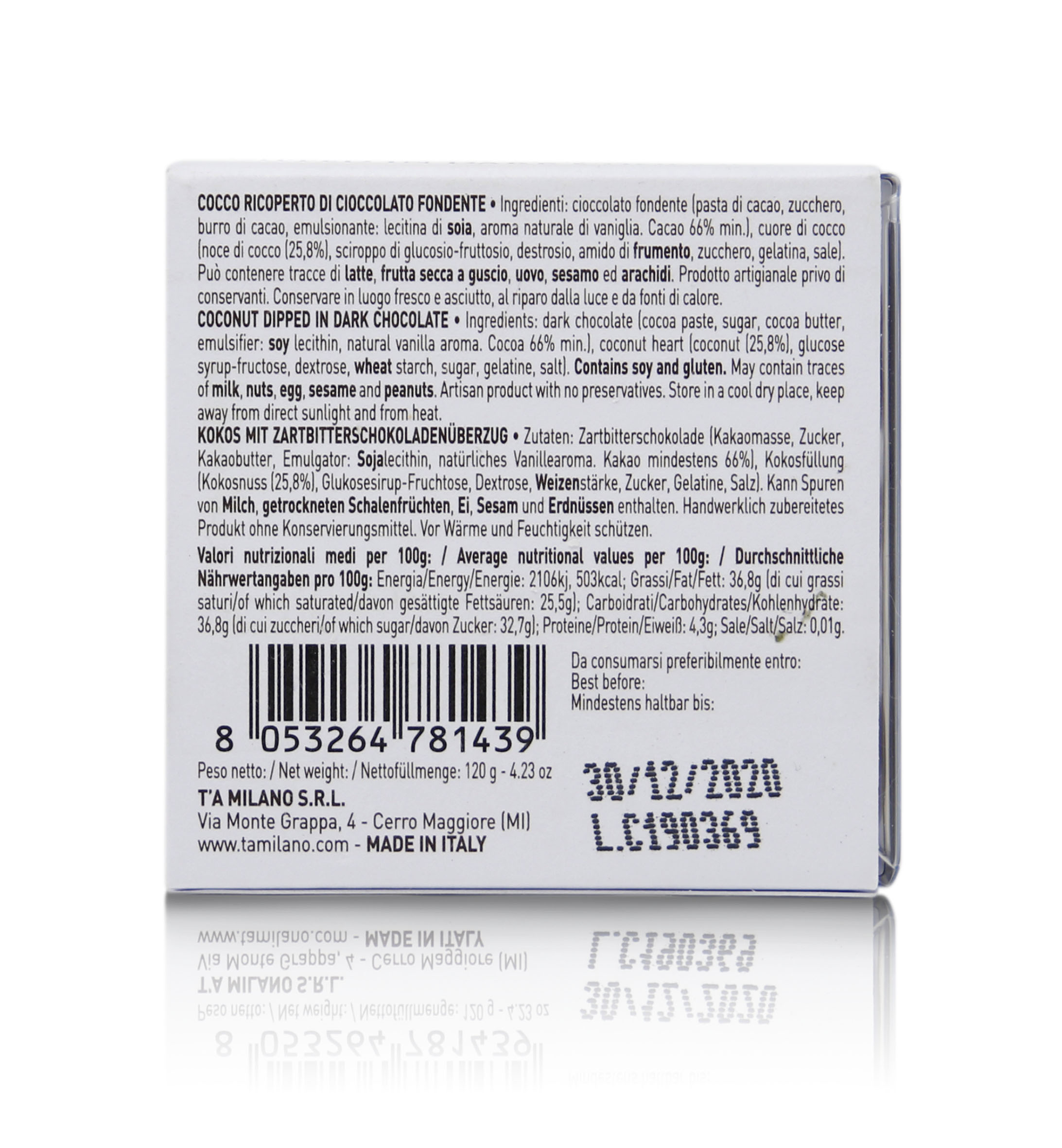 Una moderna confezione a forma di cubo, grazie ad alcuni lati trasparenti, lascia intravedere questi deliziosi pezzetti di cocco disidratato ricoperti di cioccolato fondente (cacao: 66% minimo). I Dragées al cocco di T'a Milano, creati con cioccolato artigianale, sono perfetti da offrire ai vostri ospiti insieme al caffè o come piccolo regalo per gli amanti della piccola pasticceria.