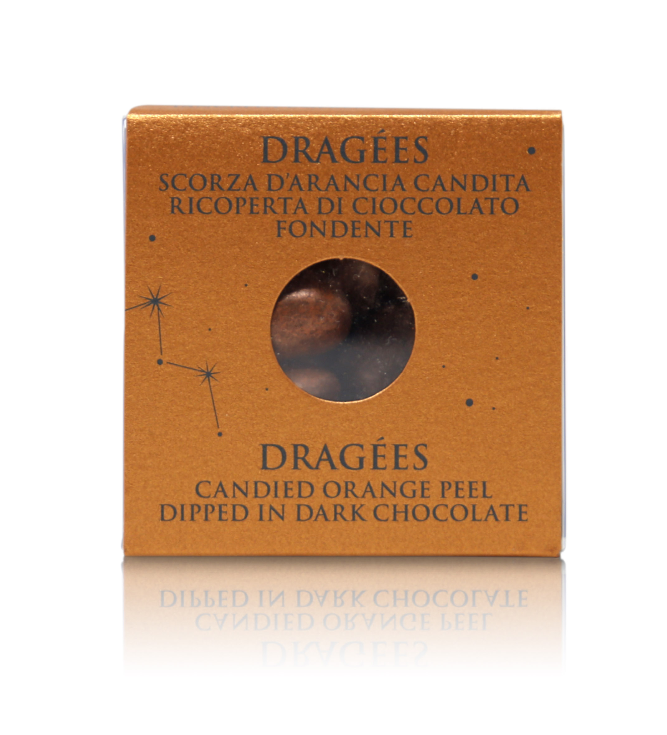 Una moderna confezione a forma di cubo, grazie ad alcuni lati trasparenti, lascia intravedere queste deliziose pepite di scorza d'arancia candita ricoperta di cioccolato fondente color rame (cacao: 66% minimo). I Dragées della Linea Stardust di T'a Milano si contraddistinguono per il loro aspetto super elegante dato dalla loro insolita colorazione. Perfetti da offrire ai vostri ospiti insieme al caffè o come piccolo regalo per gli amanti dei dolci.