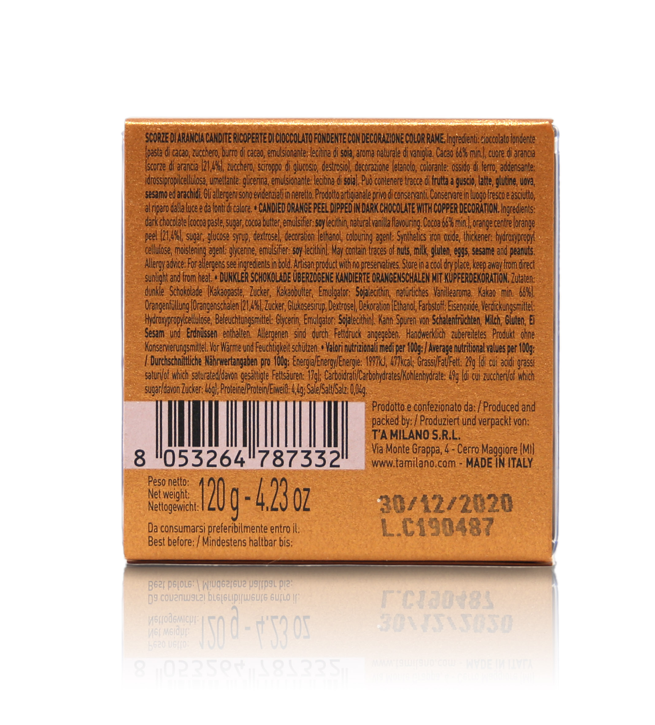 T'a Milano Dragées con scorza d'arancia candita ricoperta di cioccolato fondente 66% color rame, Linea Stardust - 120g