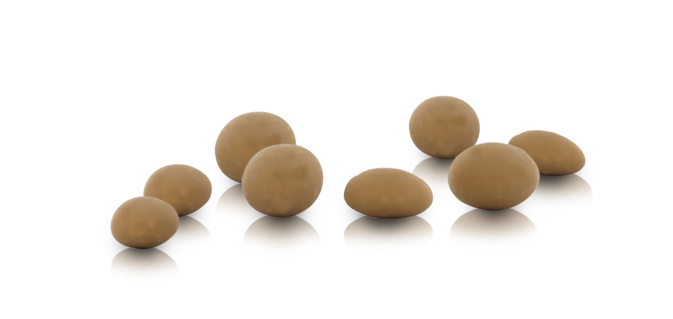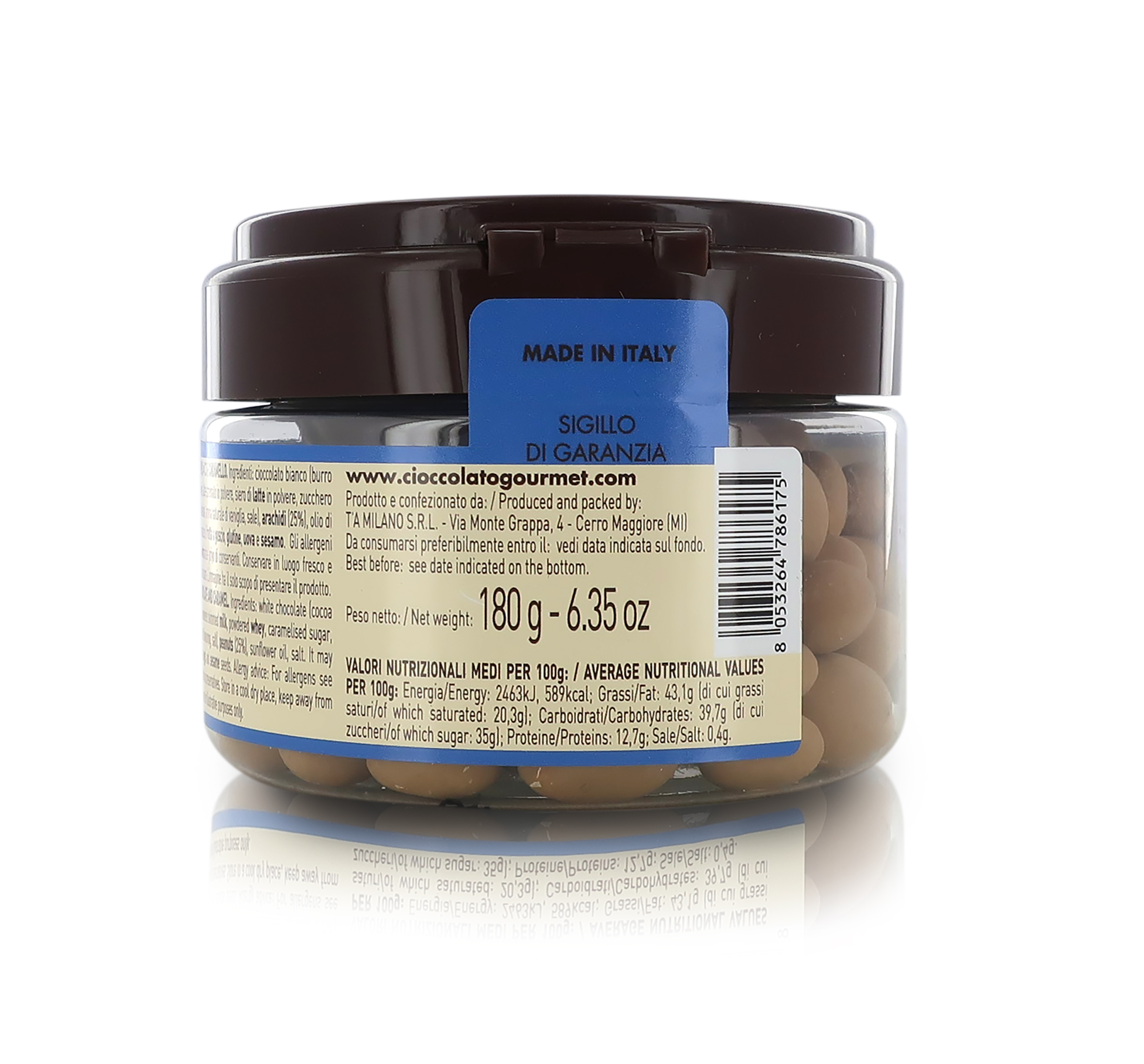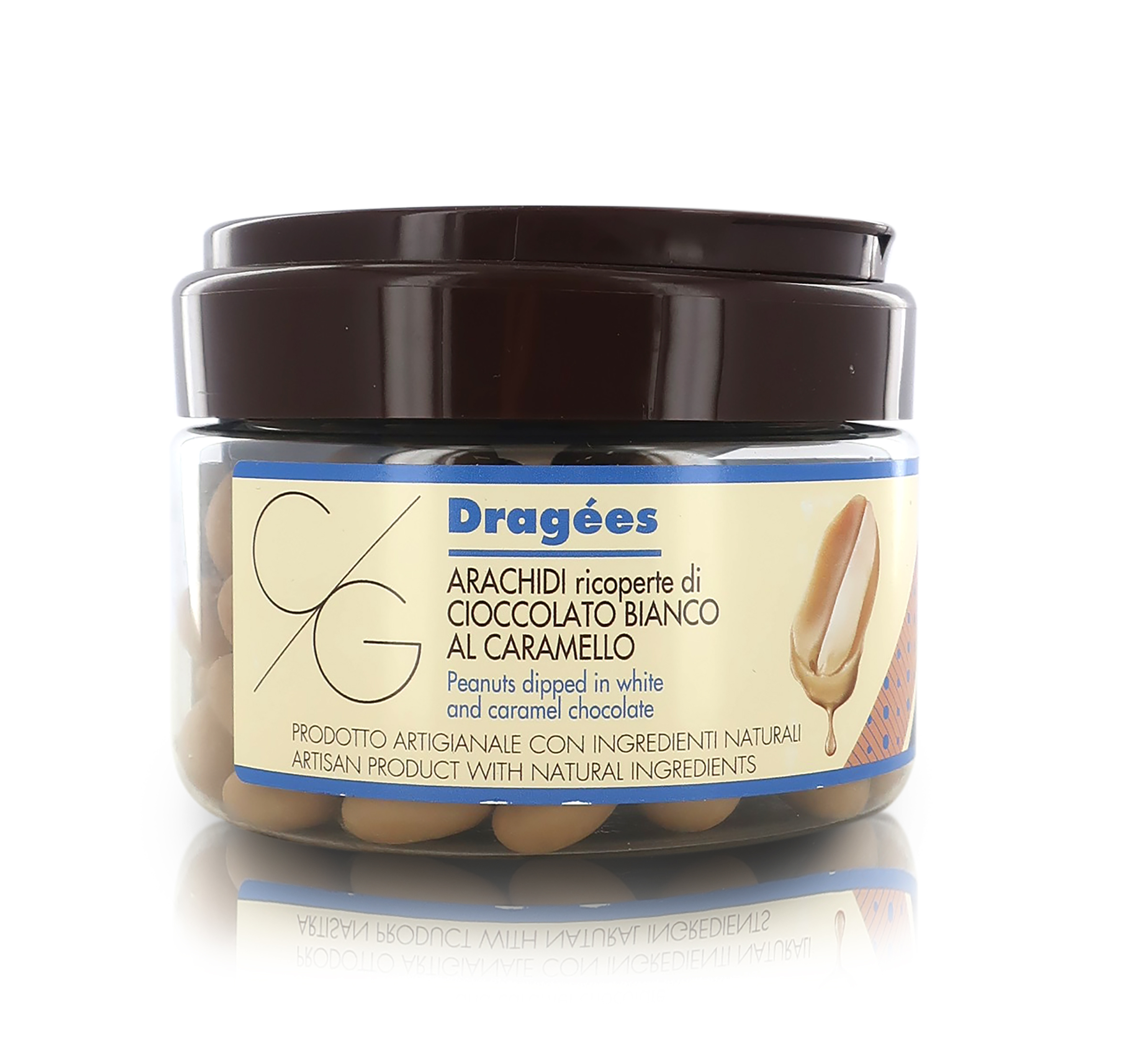Dragées realizzati con arachidi e una copertura di cioccolato bianco al caramello, in barattolo da 180g.