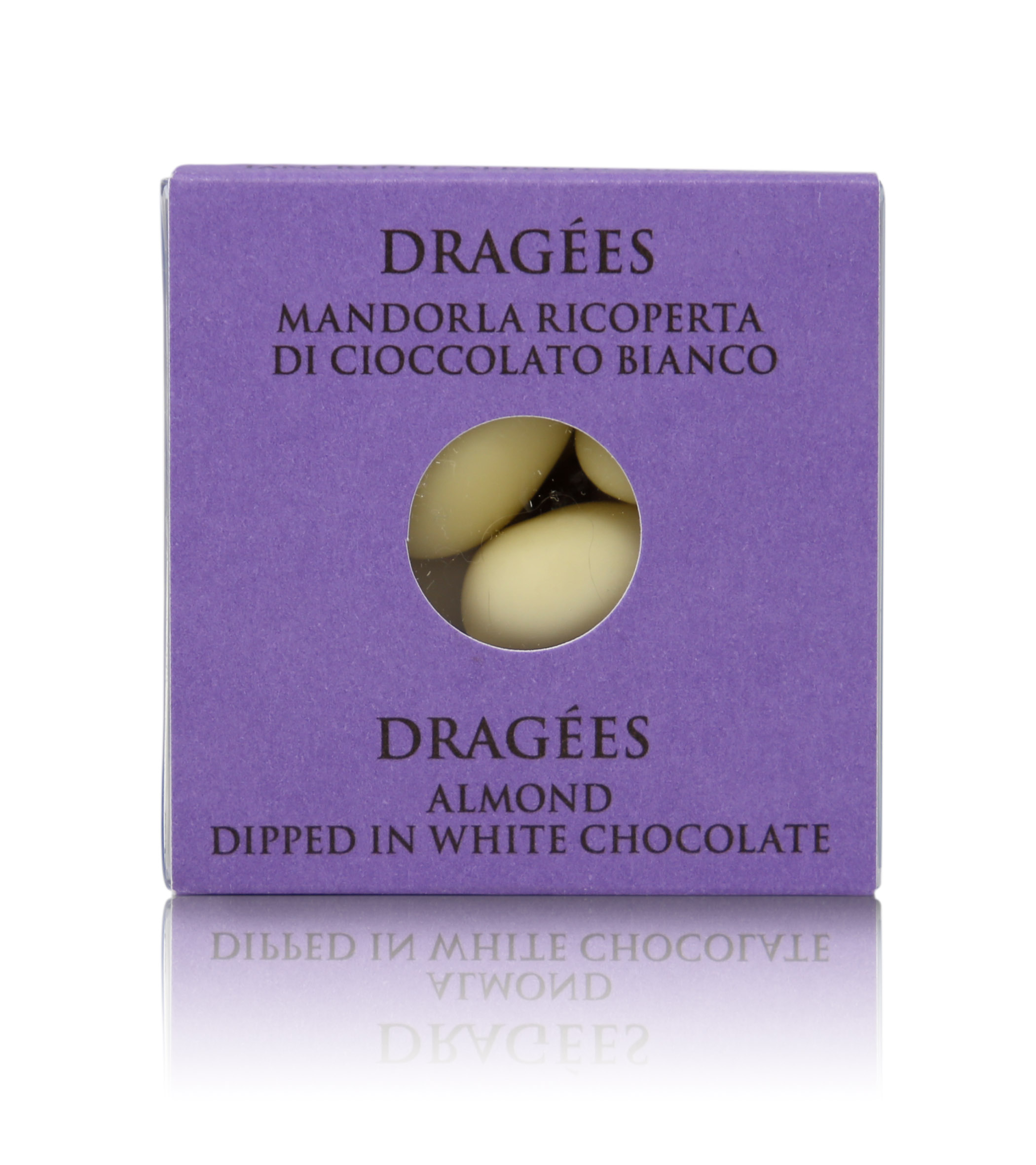 Una moderna confezione a forma di cubo, grazie ad alcuni lati trasparenti, lascia intravedere queste deliziose mandorle ricoperte di cioccolato bianco (cacao: 34% minimo). I Dragées classici alla frutta secca di T'a Milano sono perfetti da offrire ai vostri ospiti insieme al caffè o come piccolo regalo per gli amanti della piccola pasticceria.