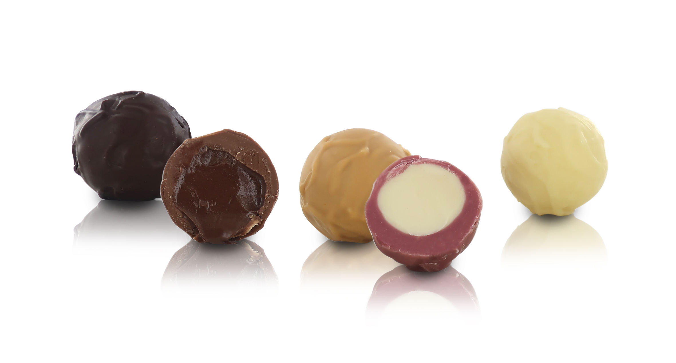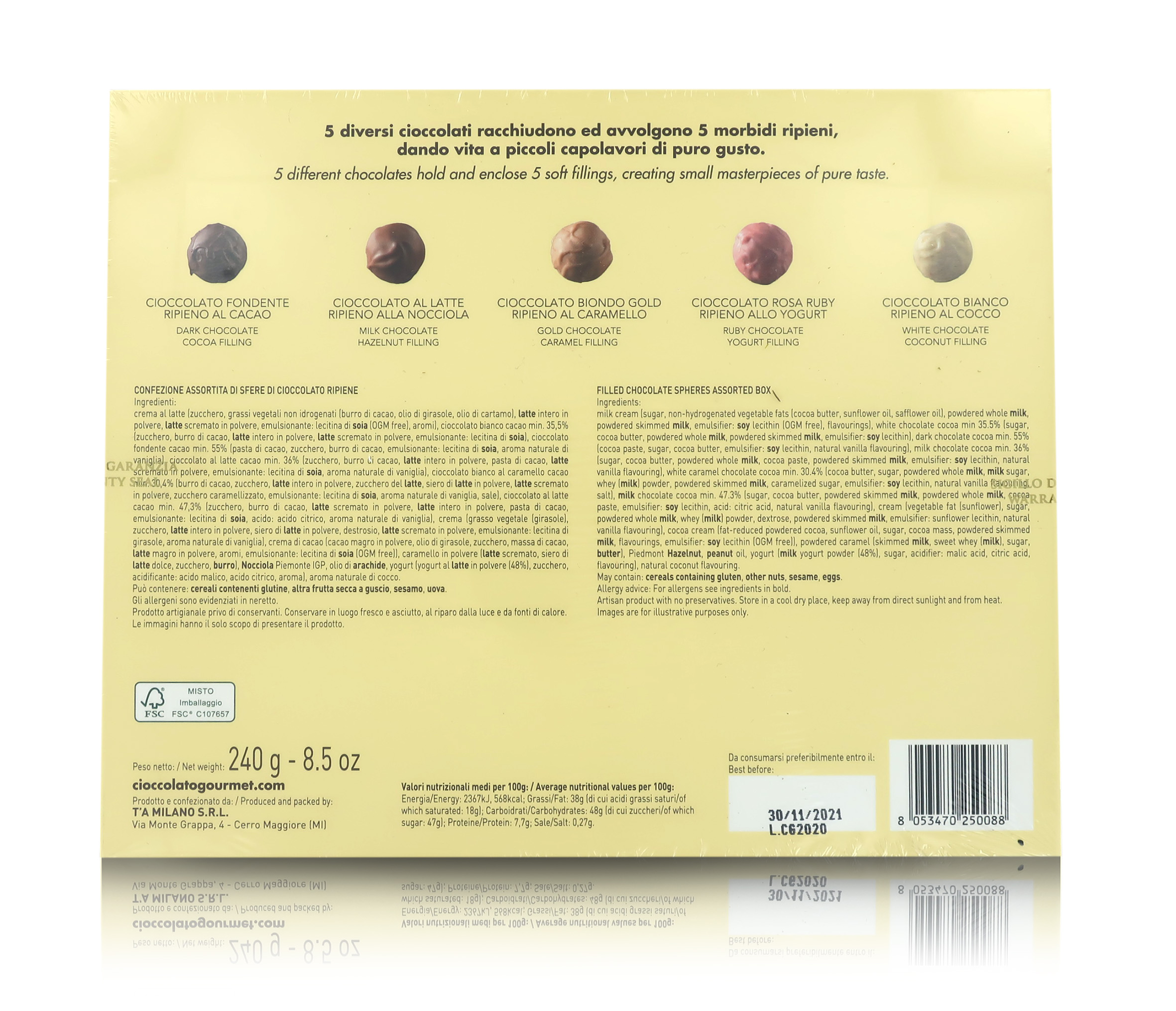 20 sfere artigianali con morbido ripieno, in scatola regalo di design. Gusti presenti: (a) cioccolato fondente con ripieno al cacao, (b) cioccolato al latte con ripieno alla nocciola, (c) cioccolato biondo gold con ripieno al caramello, (d) cioccolato rosa Ruby con ripieno allo yogurt, (e) cioccolato bianco con ripieno al cocco.
