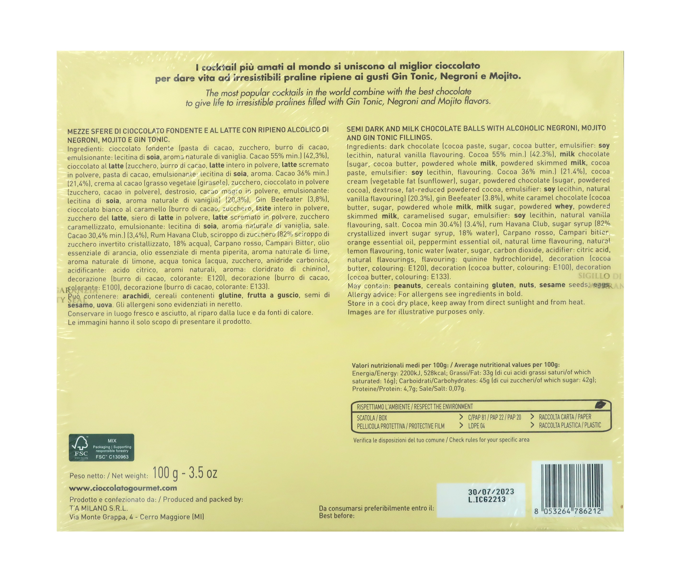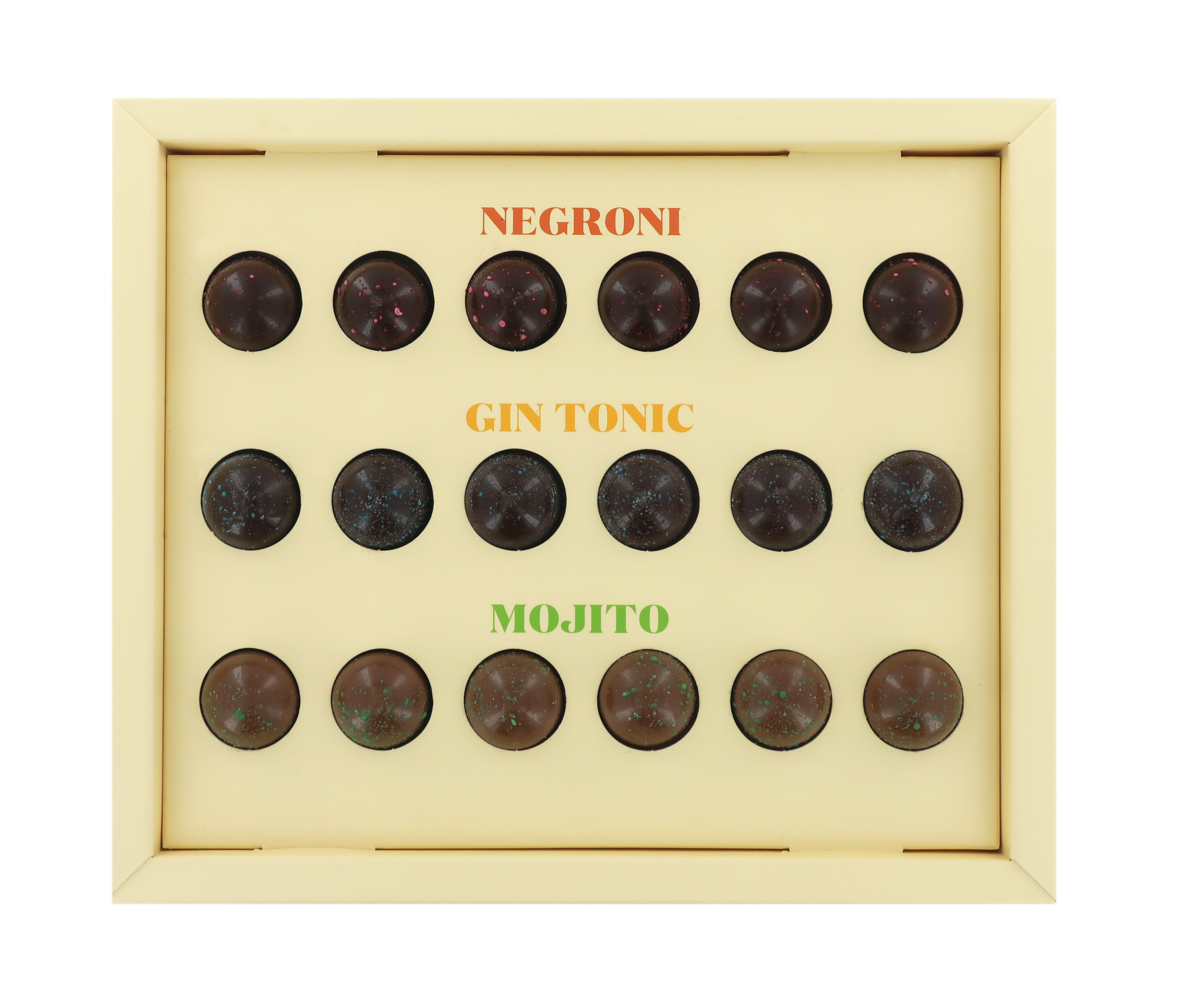 18 praline artigianali con cuore dal morbido ripieno alcolico, in elegante scatola di design. La confezione include praline di cioccolato fondente con ripieno al gin tonic e Negroni, a cui si aggiungono praline di cioccolato al latte con ripieno al mojito. Apprezzerete il fine cioccolato al latte e fondente in questi 3 particolari accostamenti, tutti da assaggiare!