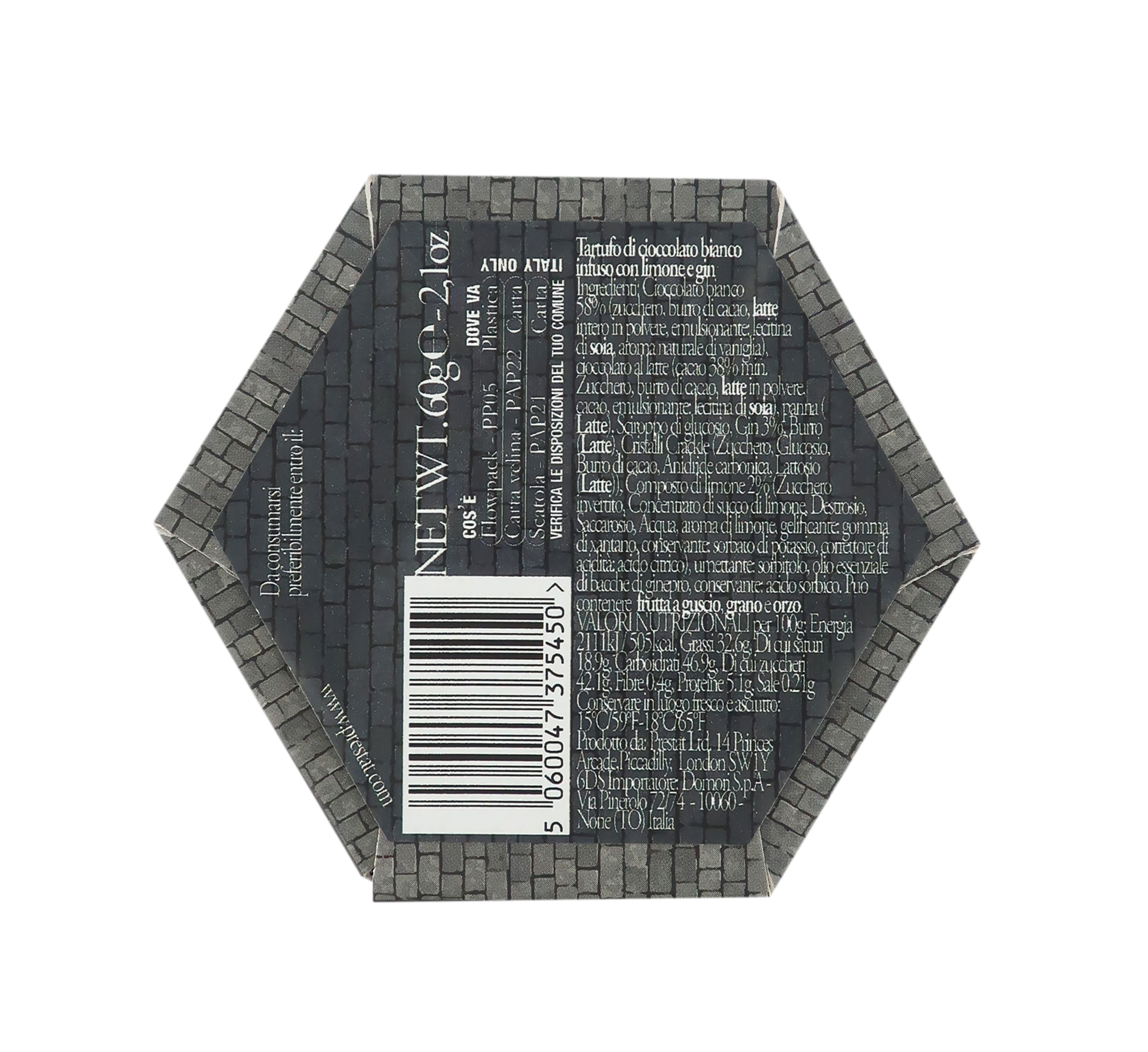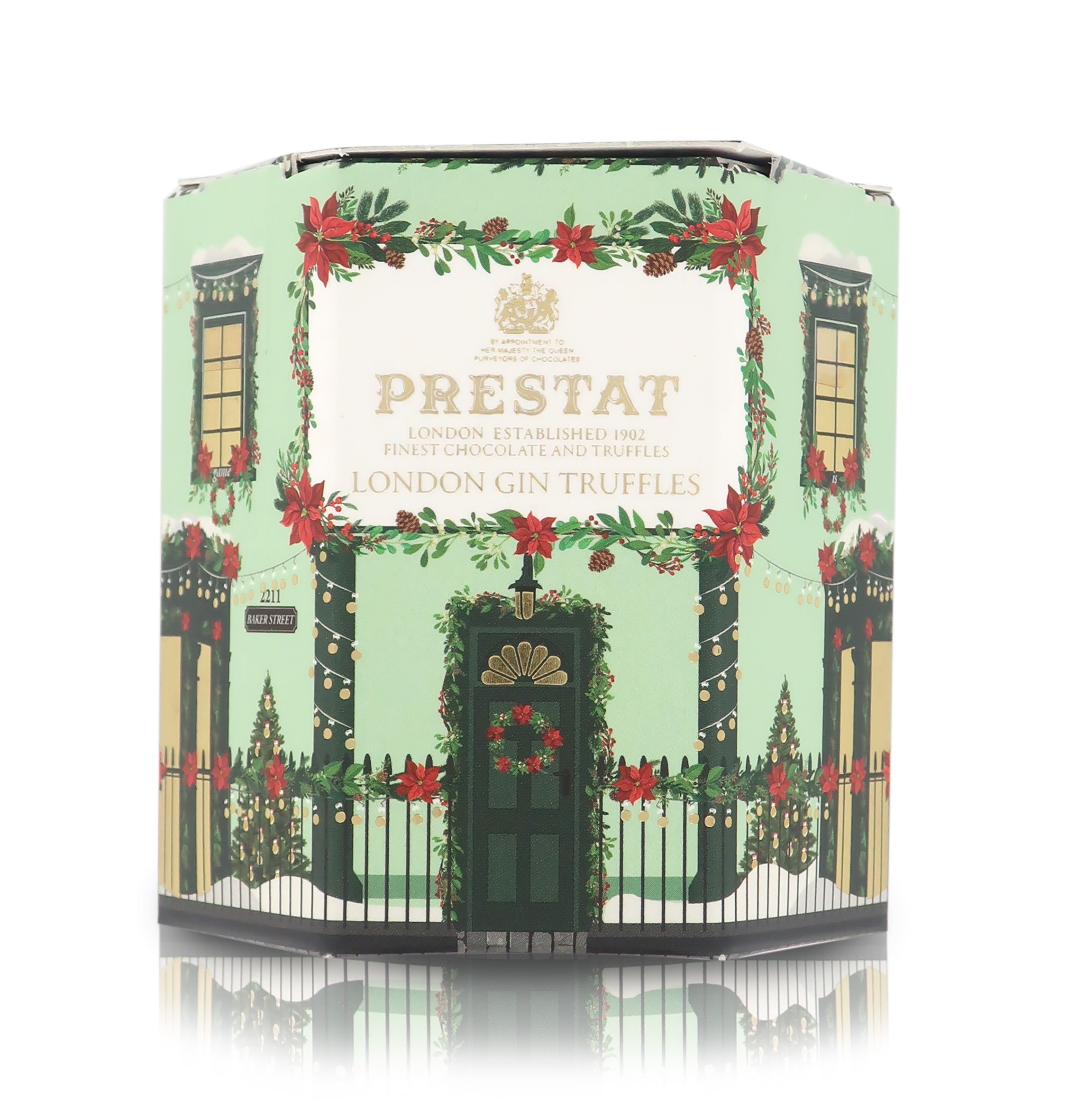 Iconici tartufi di cioccolato Prestat al London Gin e limone, in una graziosa scatoletta regalo illustrata che rende omaggio alle caratteristiche case londinesi addobbate a festa per il periodo natalizio. La piccola confezione regalo, di cartoncino leggero e dalla forma esagonale, vanta un piccolo manico sul tetto e contiene 60g di tartufi realizzati con una copertura di cioccolato bianco Domori e un cuore cremoso aromatizzato tramite infusione con limone e gin.