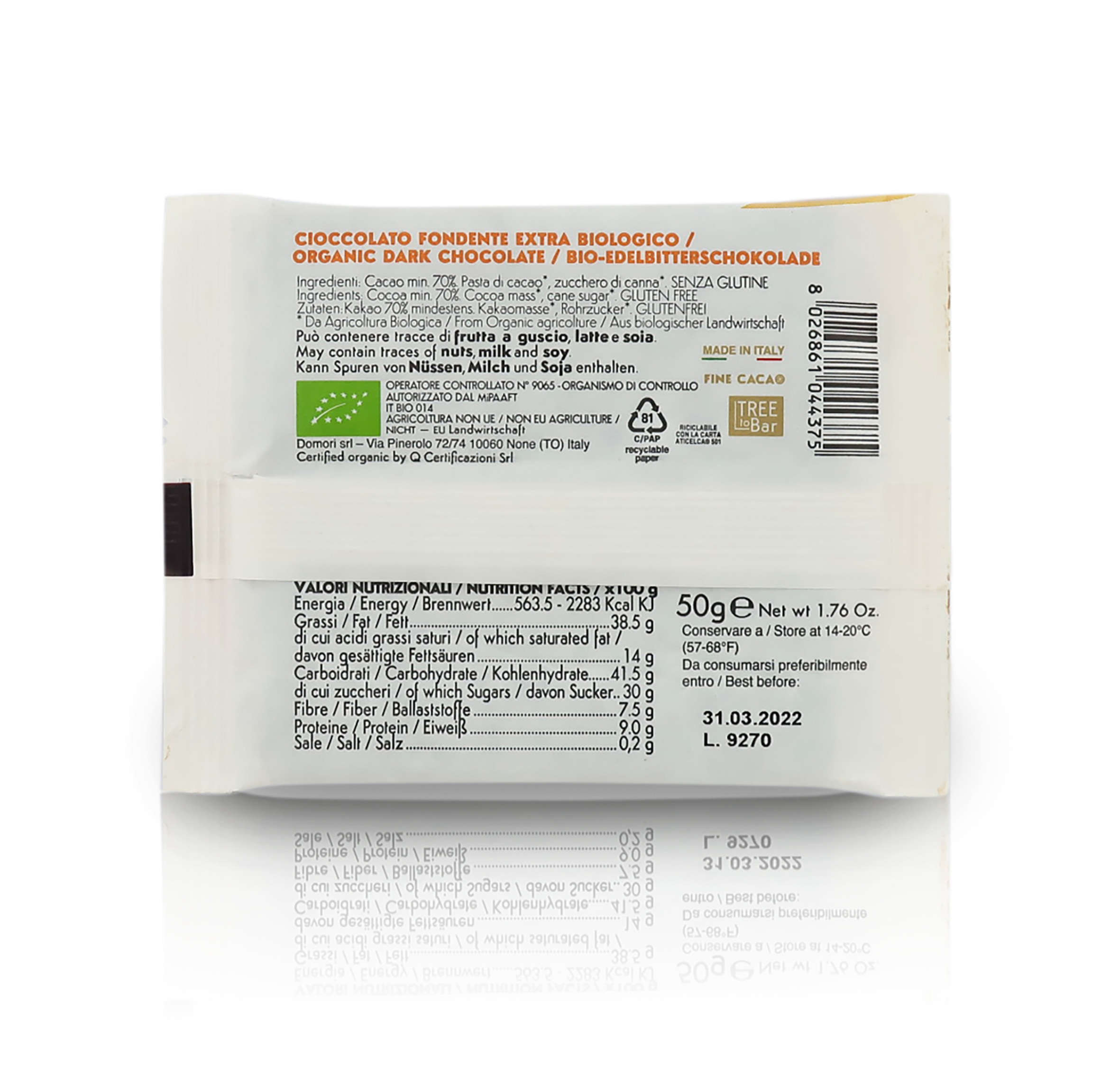 Ingredienti: Cacao min. 70%, Pasta di cacao*, zucchero di canna. Può contenere tracce di FRUTTA A GUSCIO, LATTE e SOIA. SENZA GLUTINE. (*da agricoltura biologica).