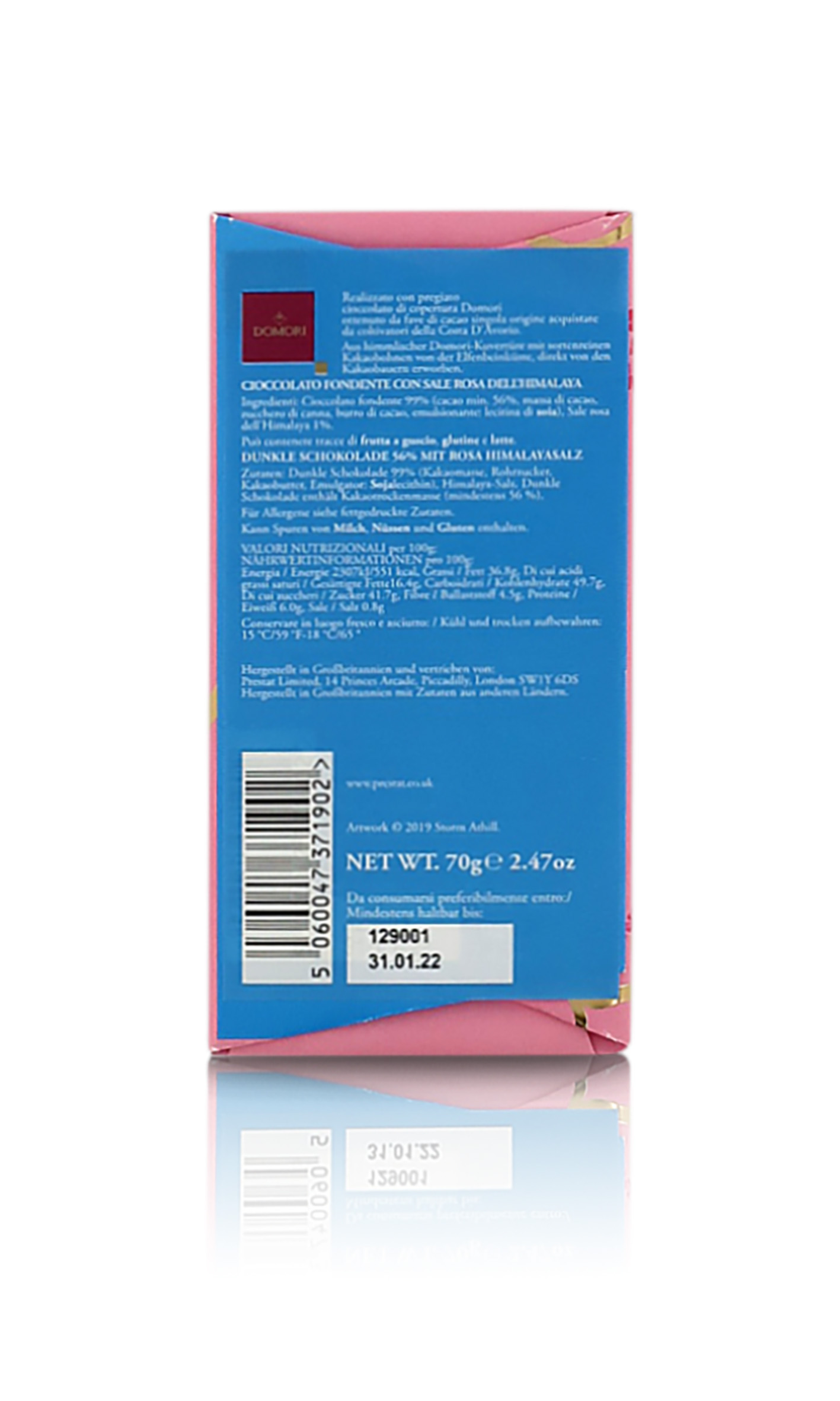 15 tavolette di pregiato cioccolato fondente 56% arricchite con autentico sale rosa dell'Himalaya (15 x 70g = 1,05 kg).