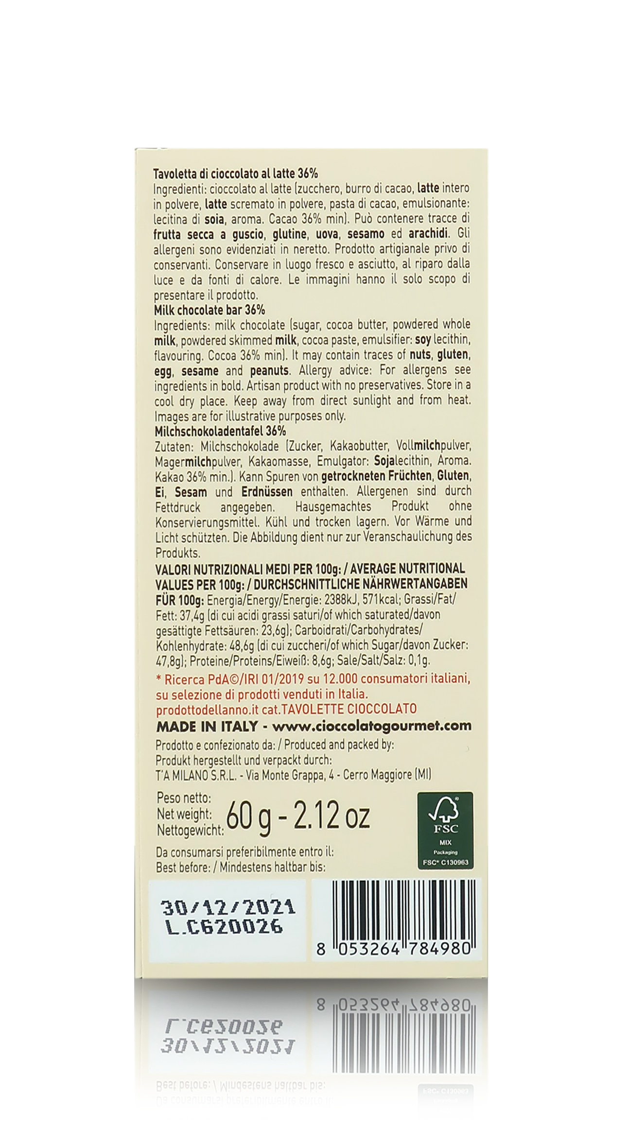 La classicità del cioccolato al latte 36% in formato tavoletta da 60g.