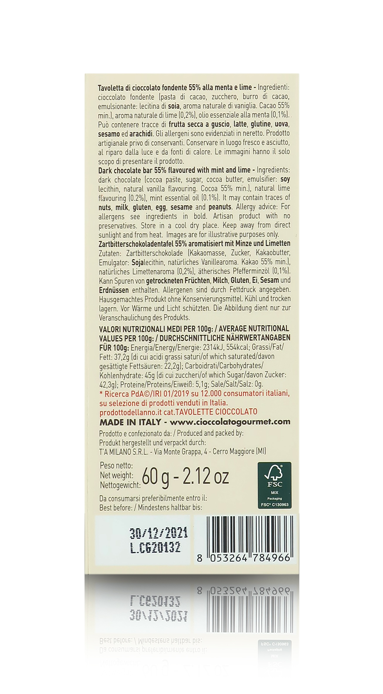 Ingredienti: Cioccolato fondente (pasta di cacao, zucchero, burro di cacao, emulsionante: lecitina di SOIA, aroma naturale di vaniglia. Cacao 55% min.), aroma naturale di lime (0,2%), olio essenziale alla menta (0,1%). Può contenere tracce di FRUTTA SECCA A GUSCIO, LATTE, GLUTINE, UOVA, SESAMO e ARACHIDI. Valori nutrizionali medi per 100g: 2314kJ, 554kcal; Grassi: 37,2g (di cui acidi grassi saturi: 22,2g); Carboidrati: 45g (di cui zuccheri: 42,3g); Proteine: 5,1g; Sale: 0g.