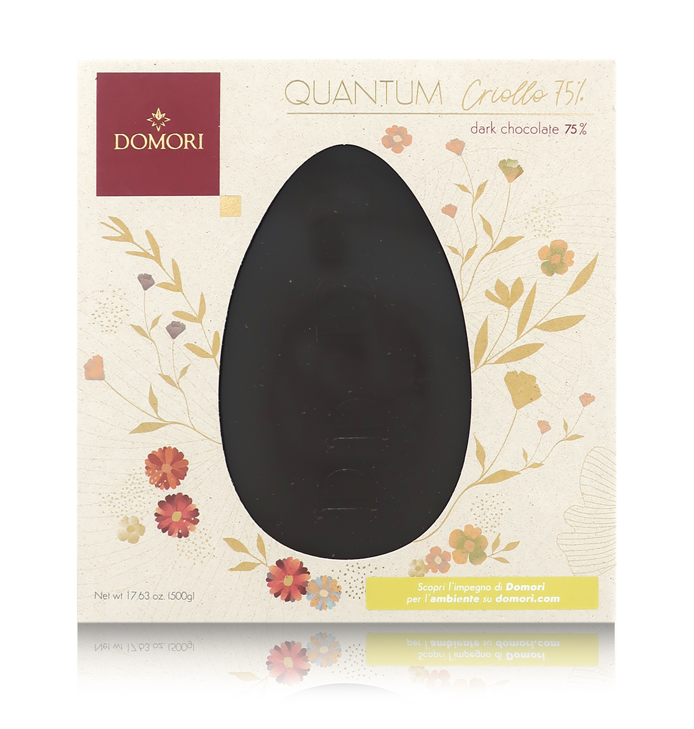 Tavoletta di cioccolato fondente extra realizzato con pregiato Cacao Criollo 75%, 500 grammi. L'incarto con finestra intagliata a forma di uovo rende questa tavoletta di cioccolato gourmet ideale per essere regalata a Pasqua.