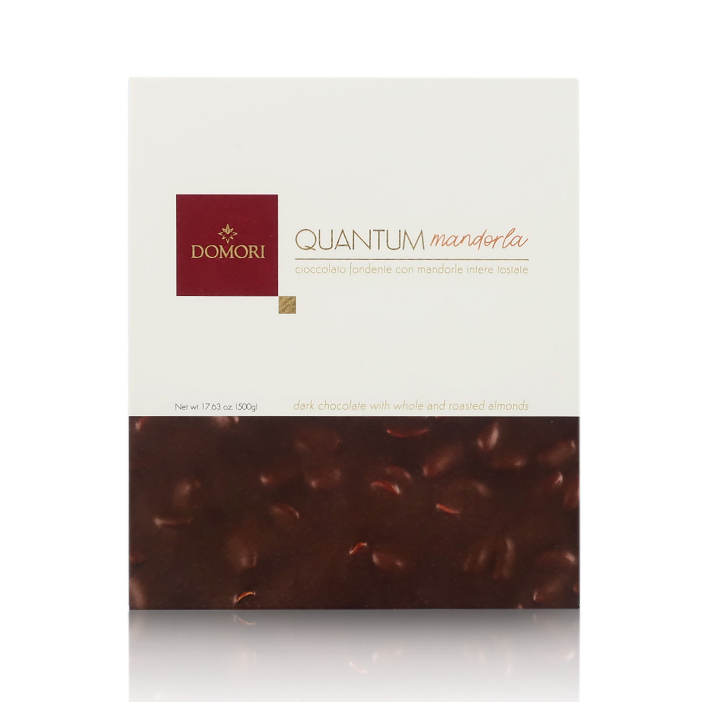 Quantum Mandorla è realizzata con finissimo cacao aromatico di varietà Trinitario della Tanzania e MANDORLE intere tostate. L’inconfondibile aroma di sempre, tipico del cioccolato fondente Domori, ma in formato più grande del solito!