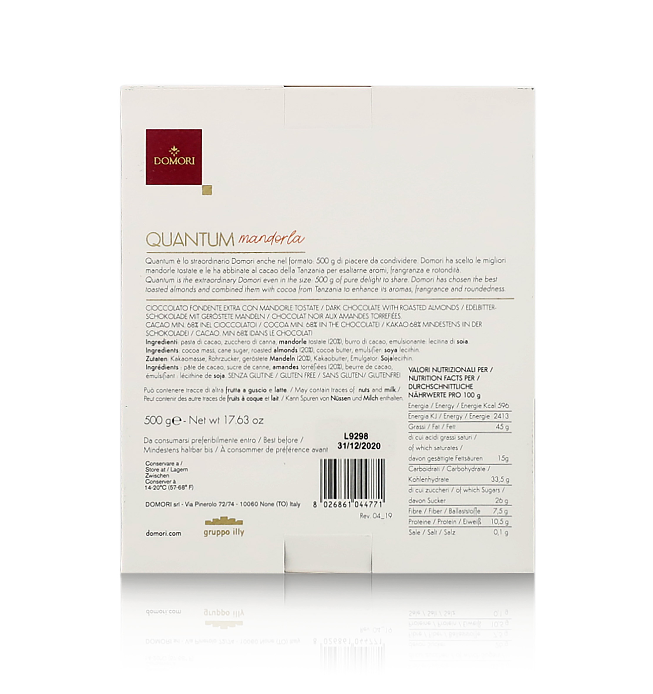 Quantum Mandorla è realizzata con finissimo cioccolato fondente Domori (cacao: 68%) e pregiate MANDORLE intere tostate varietà "Avola". L’incontro di due sapori inconfondibili, in un formato da condividere o da apprezzare più e più volte.