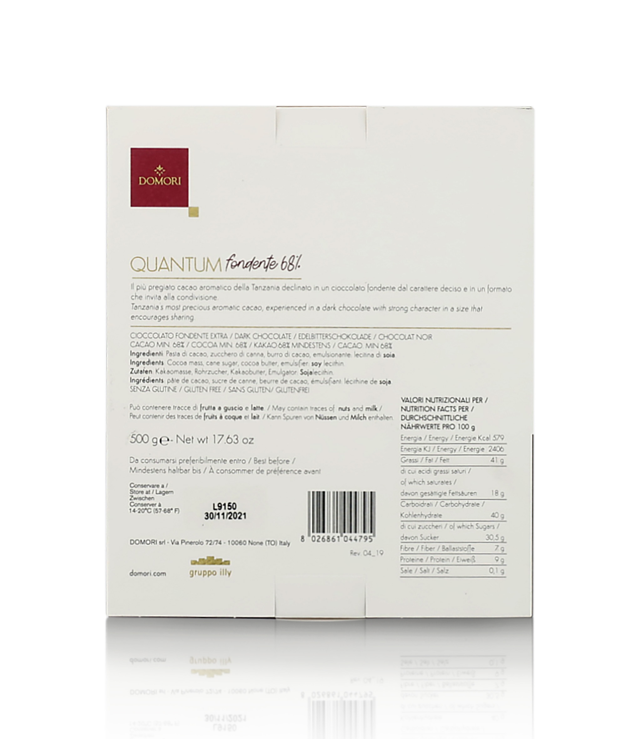 Quantum Fondente 68% è realizzata con finissimo cacao aromatico di varietà Trinitario della Tanzania. L’inconfondibile aroma di sempre, tipico del cioccolato Domori, ma in formato più grande del solito!