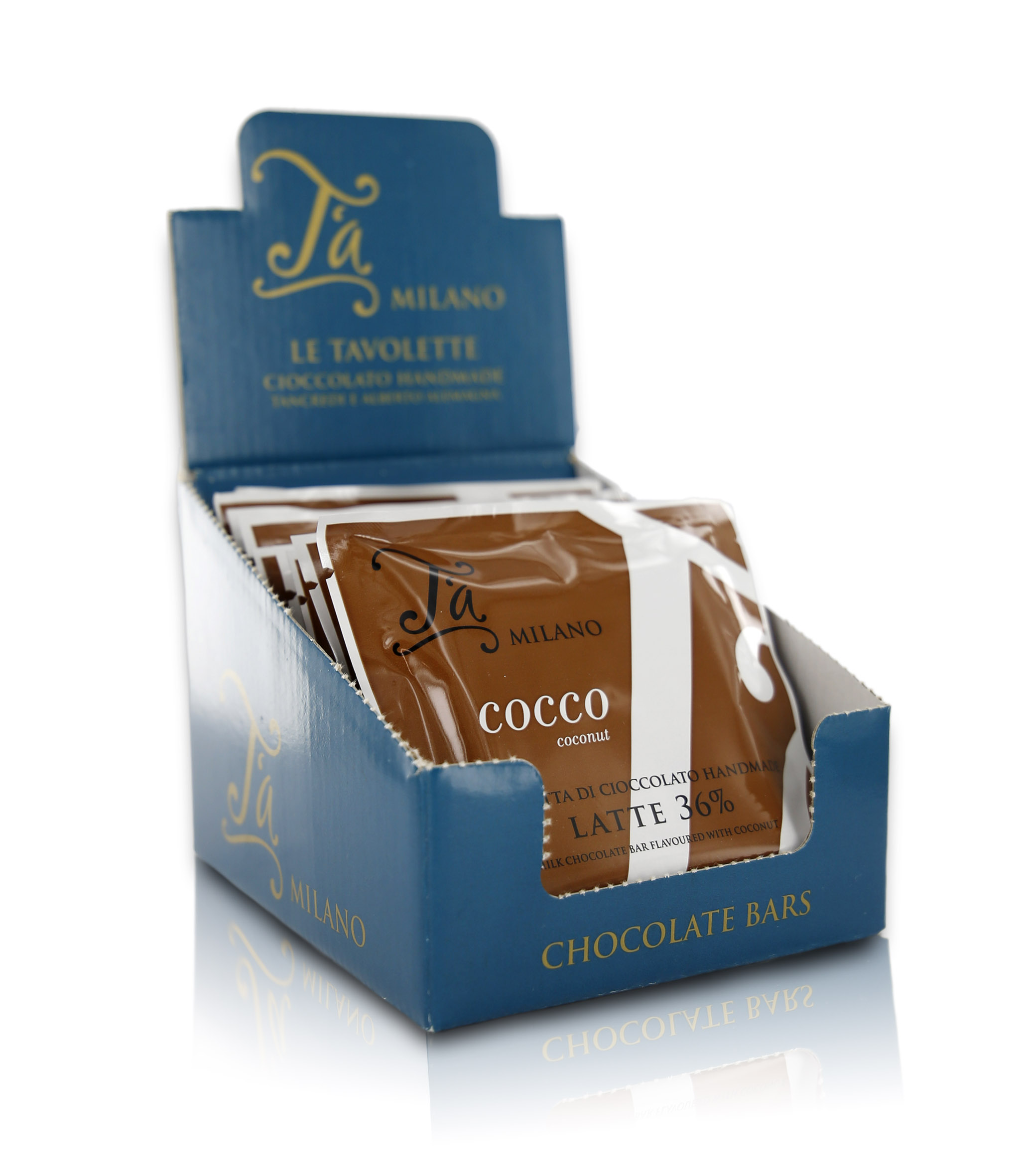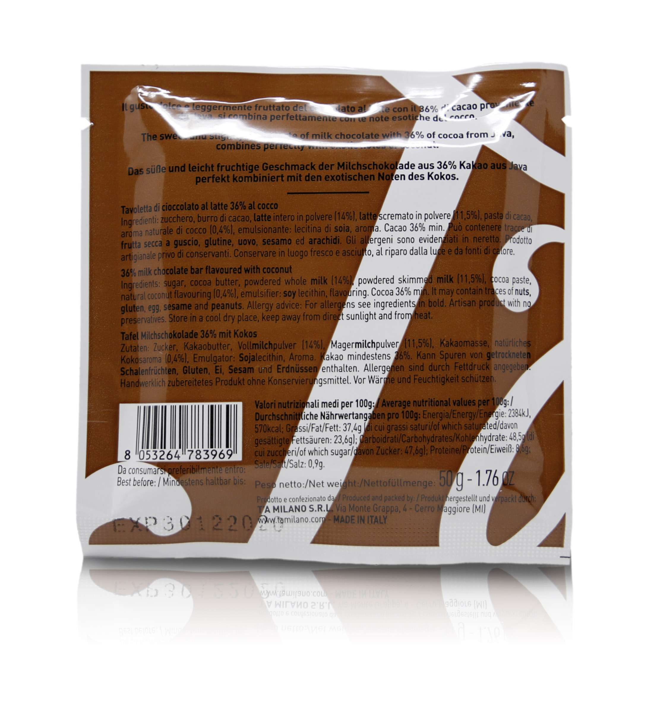 Tavoletta di cioccolato al latte da 50g, aromatizzata al cocco, con min. 36% di cacao. Contenuta in un pratico e colorato incarto dal formato insolito, questa gustosa, piccola tavoletta di cioccolato al latte artigianale piacerà sicuramente agli amanti dei gusti dolci e tropicali. Infatti, la pienezza e la "rotondità" del gusto del cocco ben si sposano con la dolcezza del cioccolato al latte. Ottima tavoletta di cioccolato per una pausa ricca di gusto e di stile.