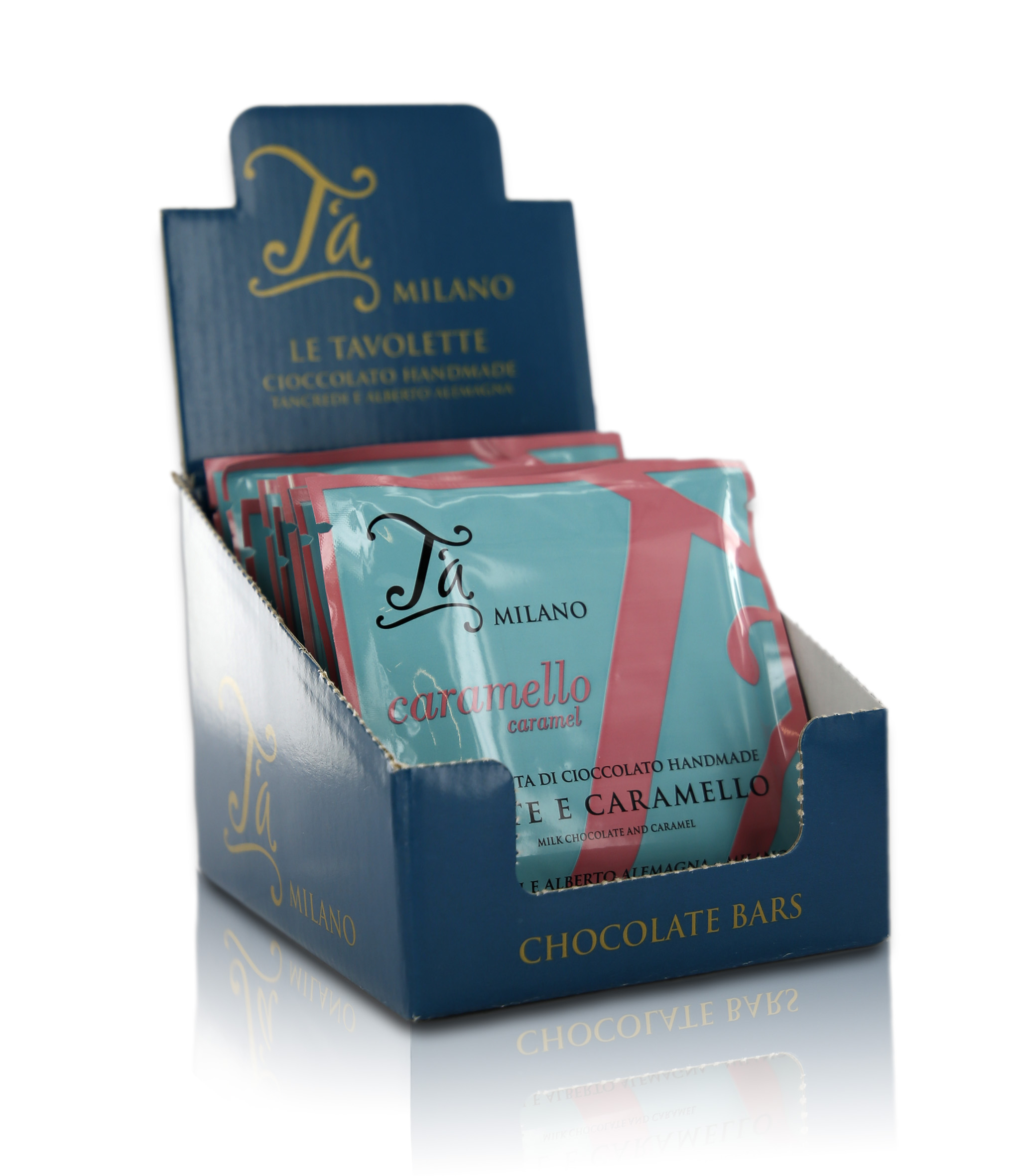 Tavoletta di cioccolato al latte da 50g al caramello. Contenuta in un pratico e colorato incarto dal formato insolito, questa gustosa, piccola tavoletta di cioccolato al latte artigianale piacerà sicuramente agli amanti della dolcezza. Ottima per una pausa ricca di gusto e di stile.