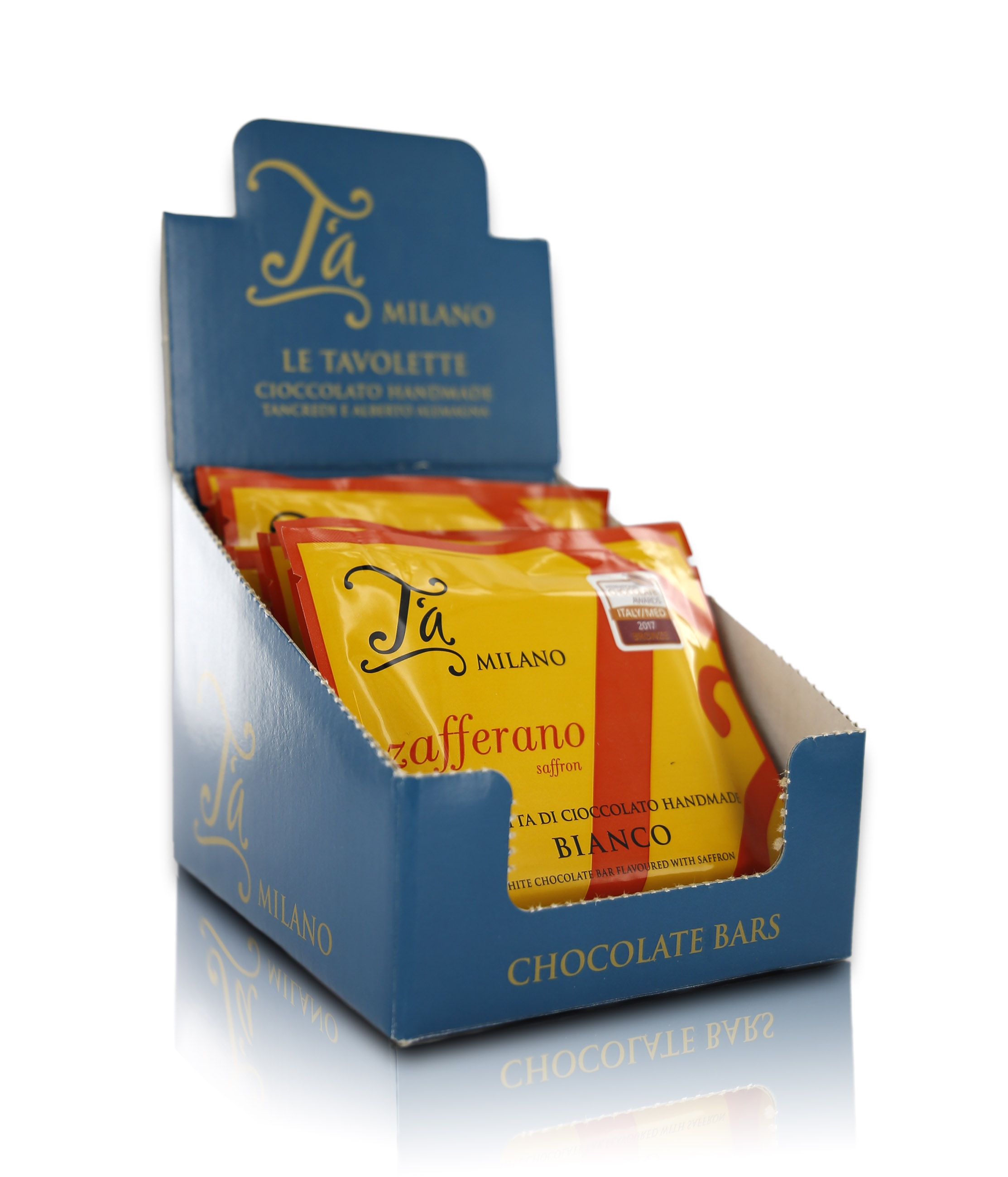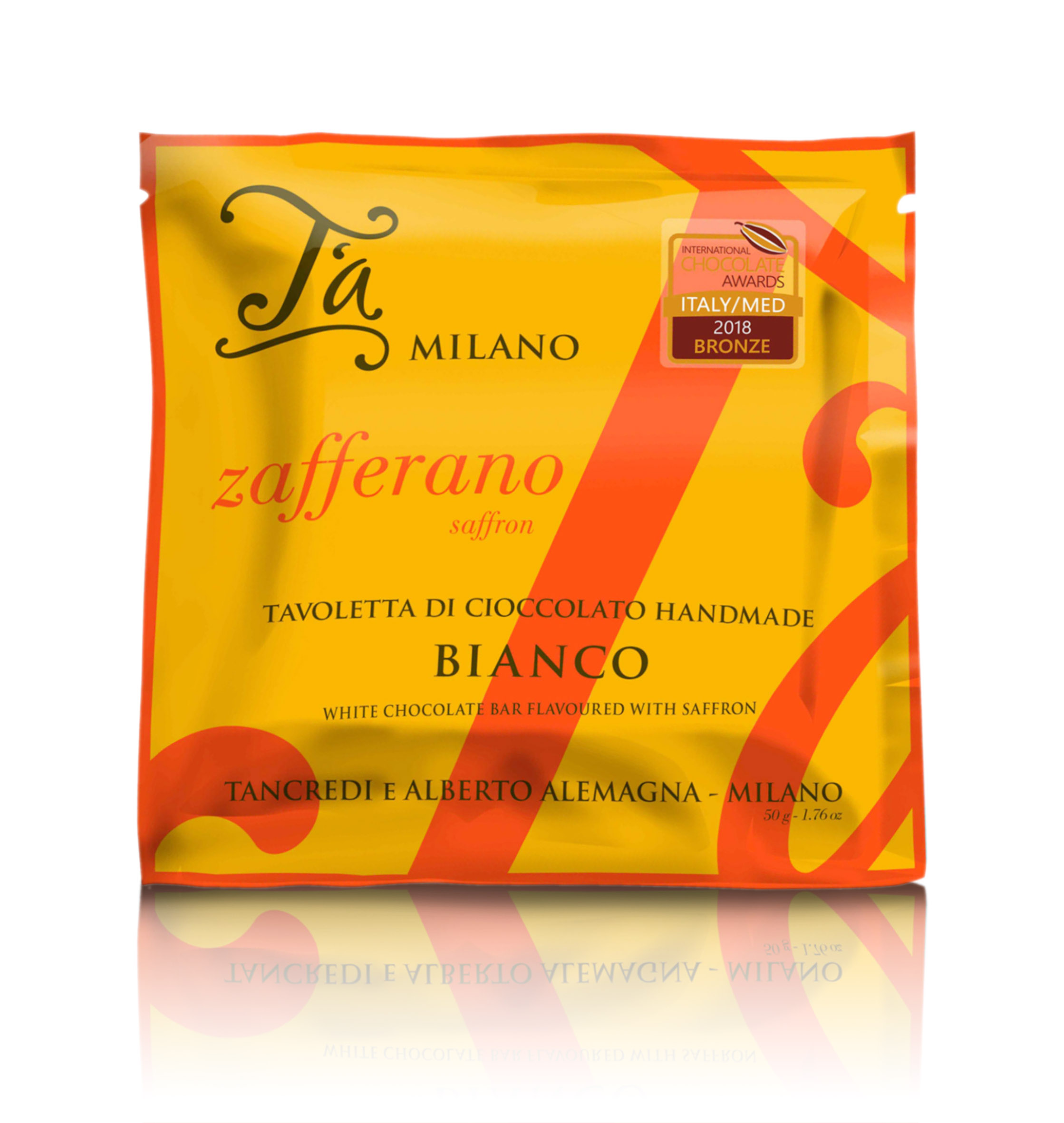 Tavoletta di cioccolato bianco da 50g aromatizzata allo zafferano. Rappresenta un prodotto di sperimentazione per T'a Milano, che vuole ricreare il "cioccolato milanese" (essendo lo zafferano l'ingrediente per il risotto tipico del capoluogo lombardo). Contenuta in un pratico e colorato incarto dal formato insolito, questa gustosa, piccola tavoletta di cioccolato bianco artigianale piacerà sicuramente agli amanti dei gusti un po' insoliti. Infatti, l'abbinamento del cioccolato bianco con la nota speziata e aromatica tipica del prezioso zafferano crea un sapore assolutamente da provare!