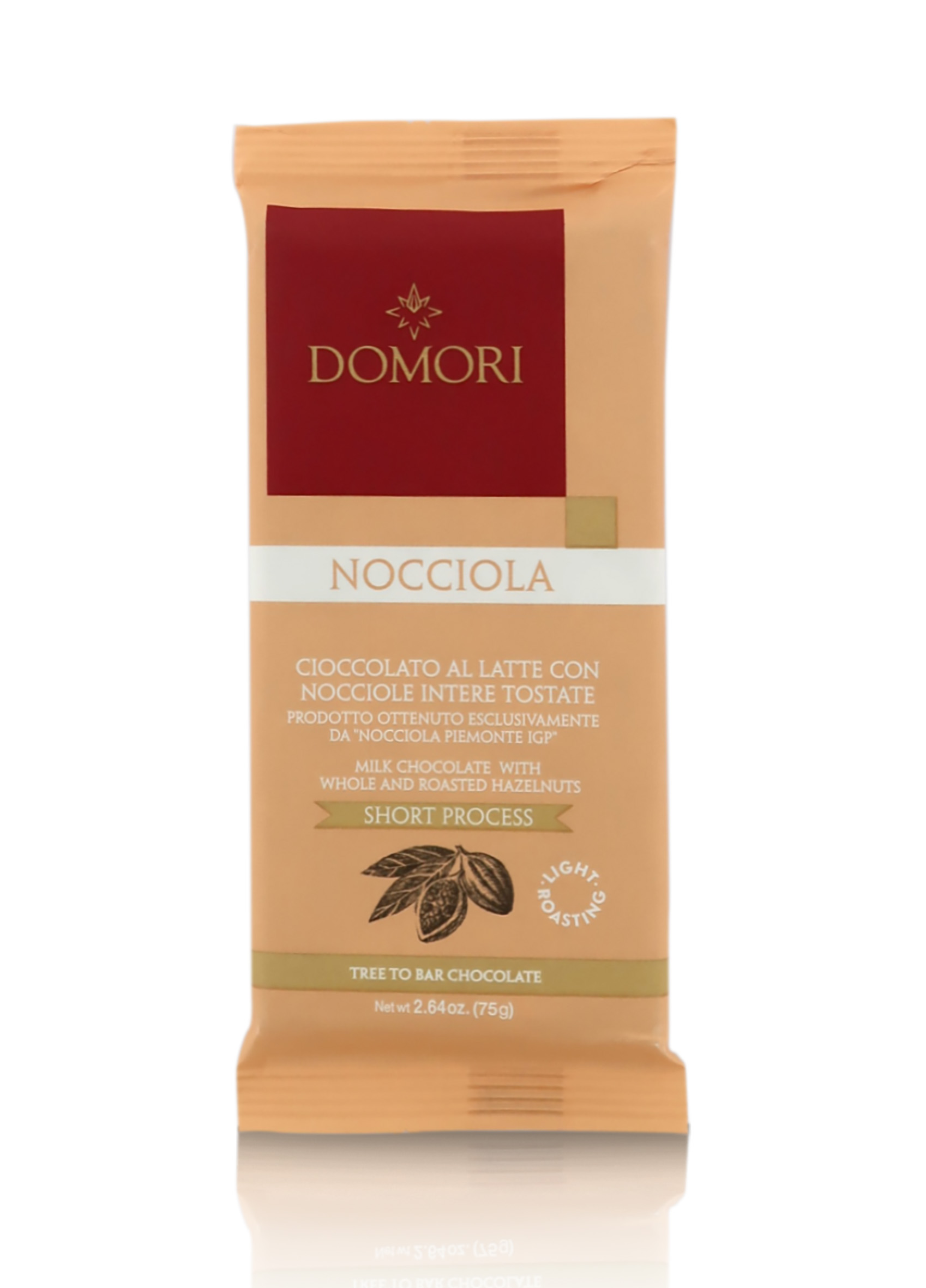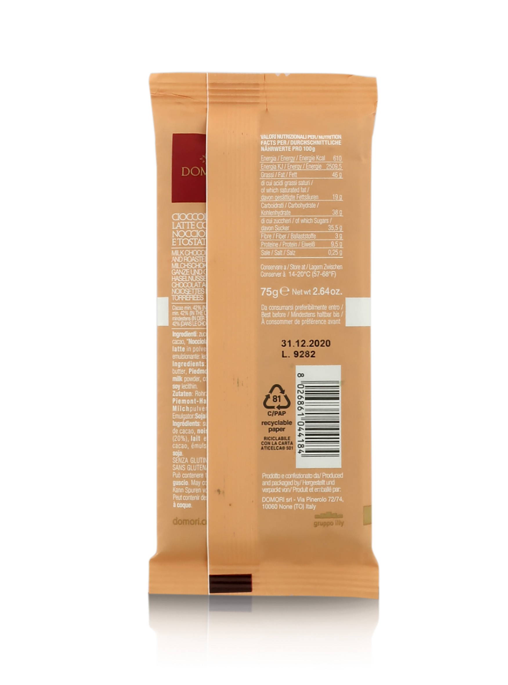 Ingredienti: Zucchero di canna, burro di cacao, “NOCCIOLA Piemonte IGP” (20%), LATTE in polvere, pasta di cacao, emulsionante: lecitina di SOIA.