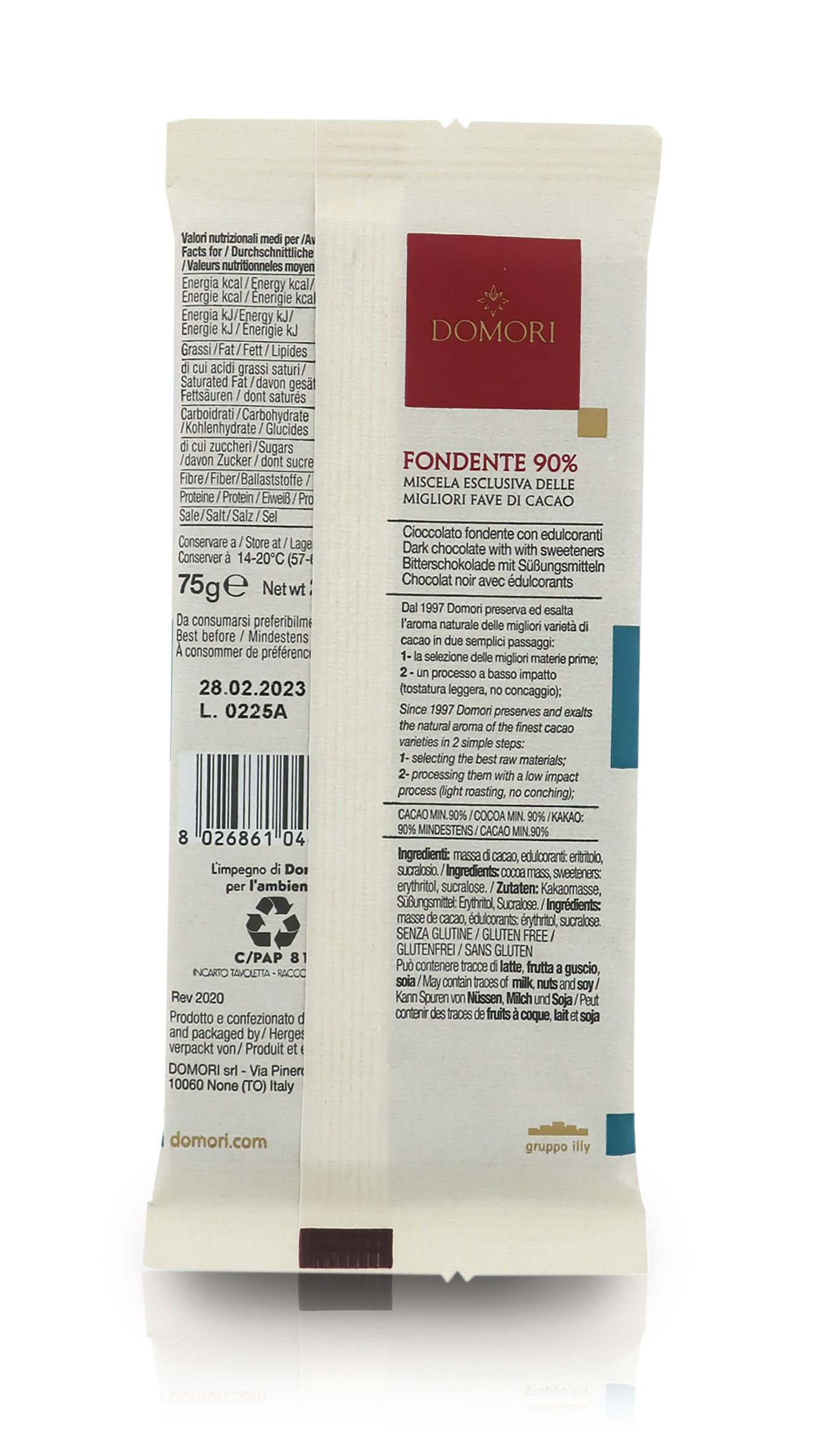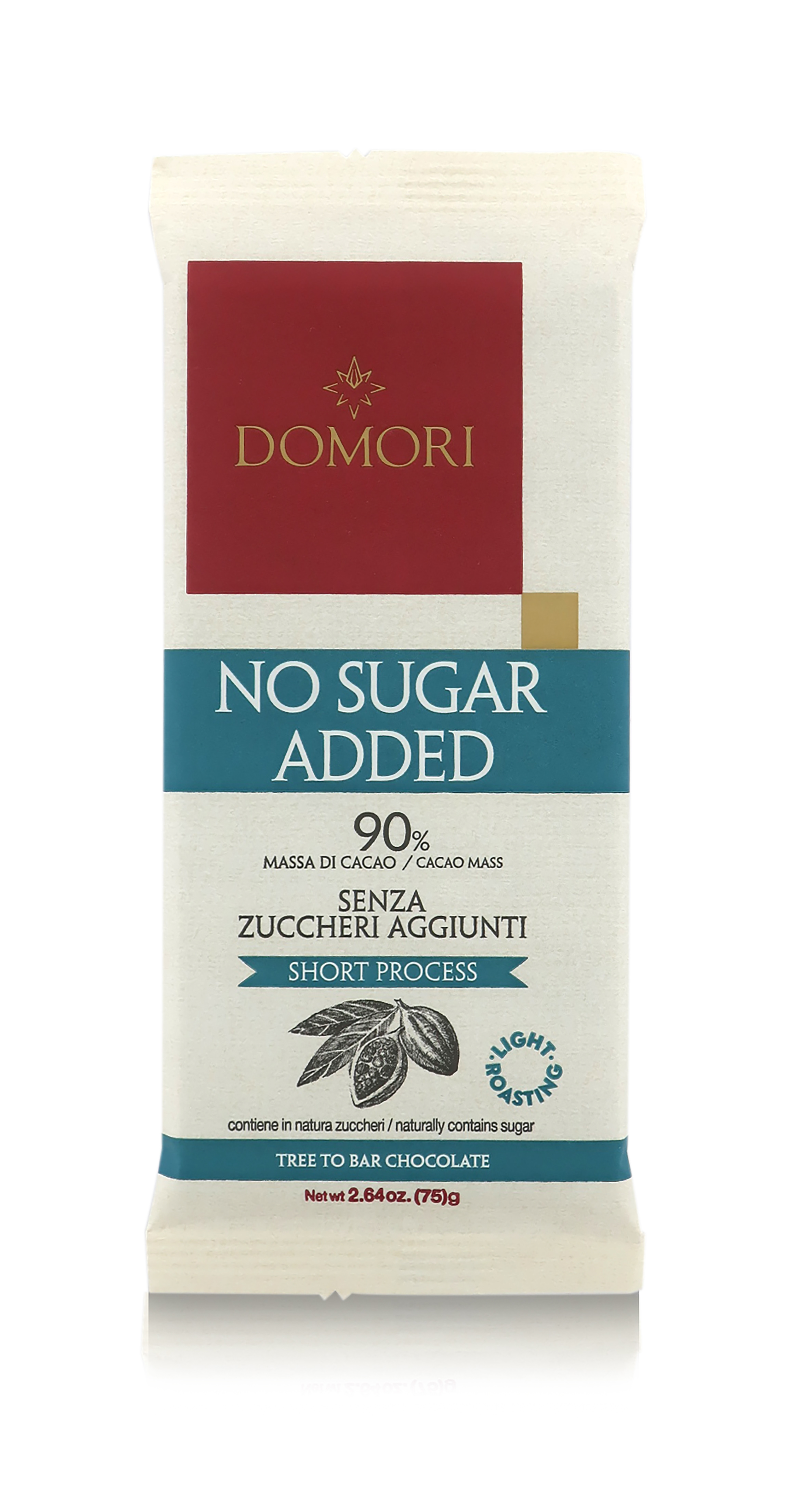 Tavoletta di cioccolato fondente 90% senza zucchero. Questa tavoletta di cioccolato sugar-free è una novità 2020 Domori. È realizzata con cioccolato fondente ottenuto da cacao aromatico della Tanzania al 90%, addolcito con dolcificanti a basso indice glicemico (eritritolo e sucralosio), caratterizzati da un ridotto apporto calorico. Ideale anche per persone soggette a diete ipocaloriche.