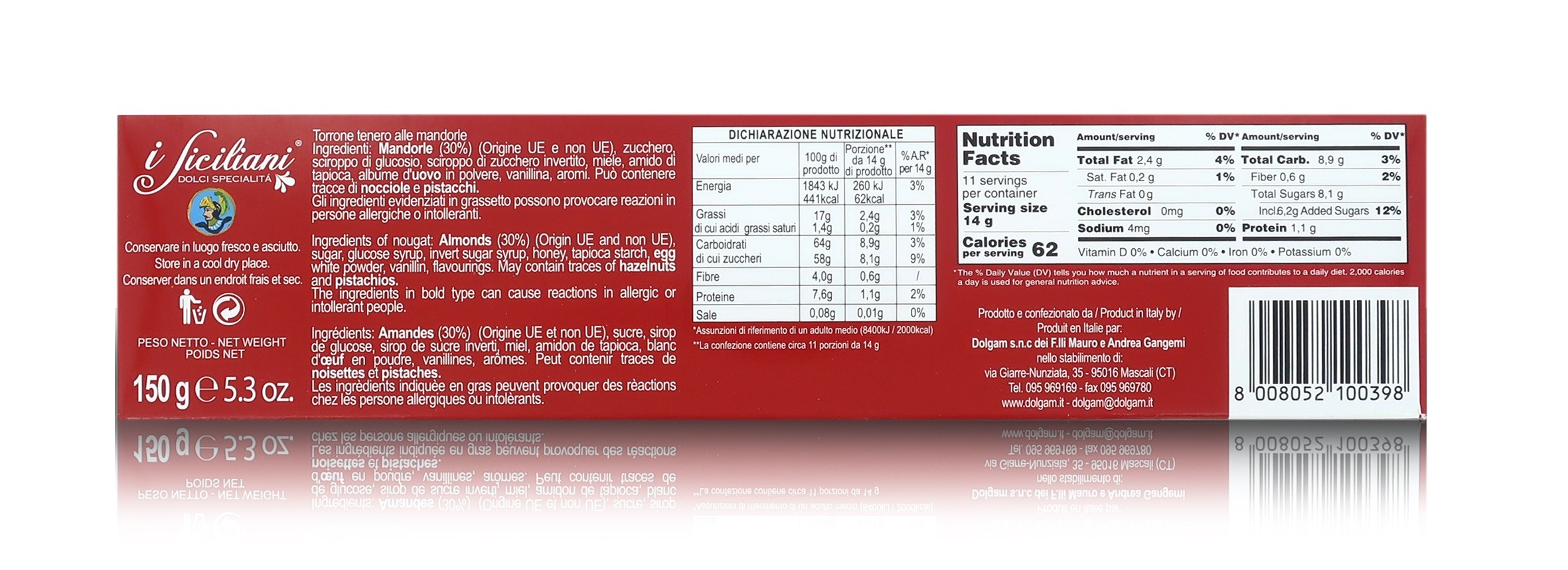 Ingredienti: MANDORLE (30%) (origine UE e non UE), zucchero, sciroppo di glucosio, sciroppo di zucchero invertito, miele, amido di tapioca, albume d'UOVO in polvere, vanillina, aromi. Può contenere tracce di NOCCIOLE e PISTACCHI. Gli ingredienti in maiuscolo possono provocare reazioni in persone allergiche o intolleranti.