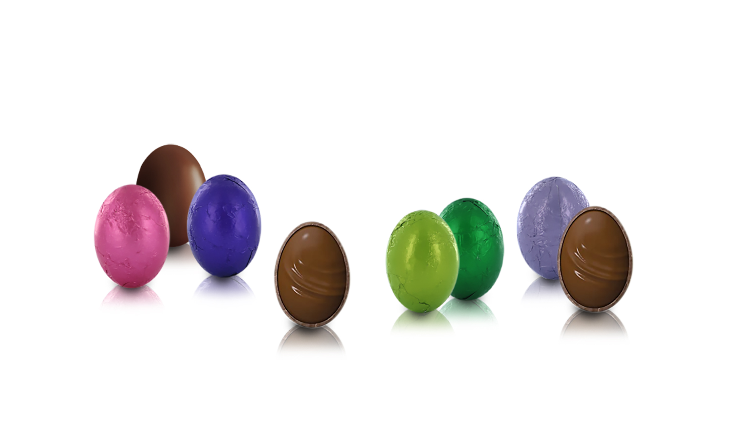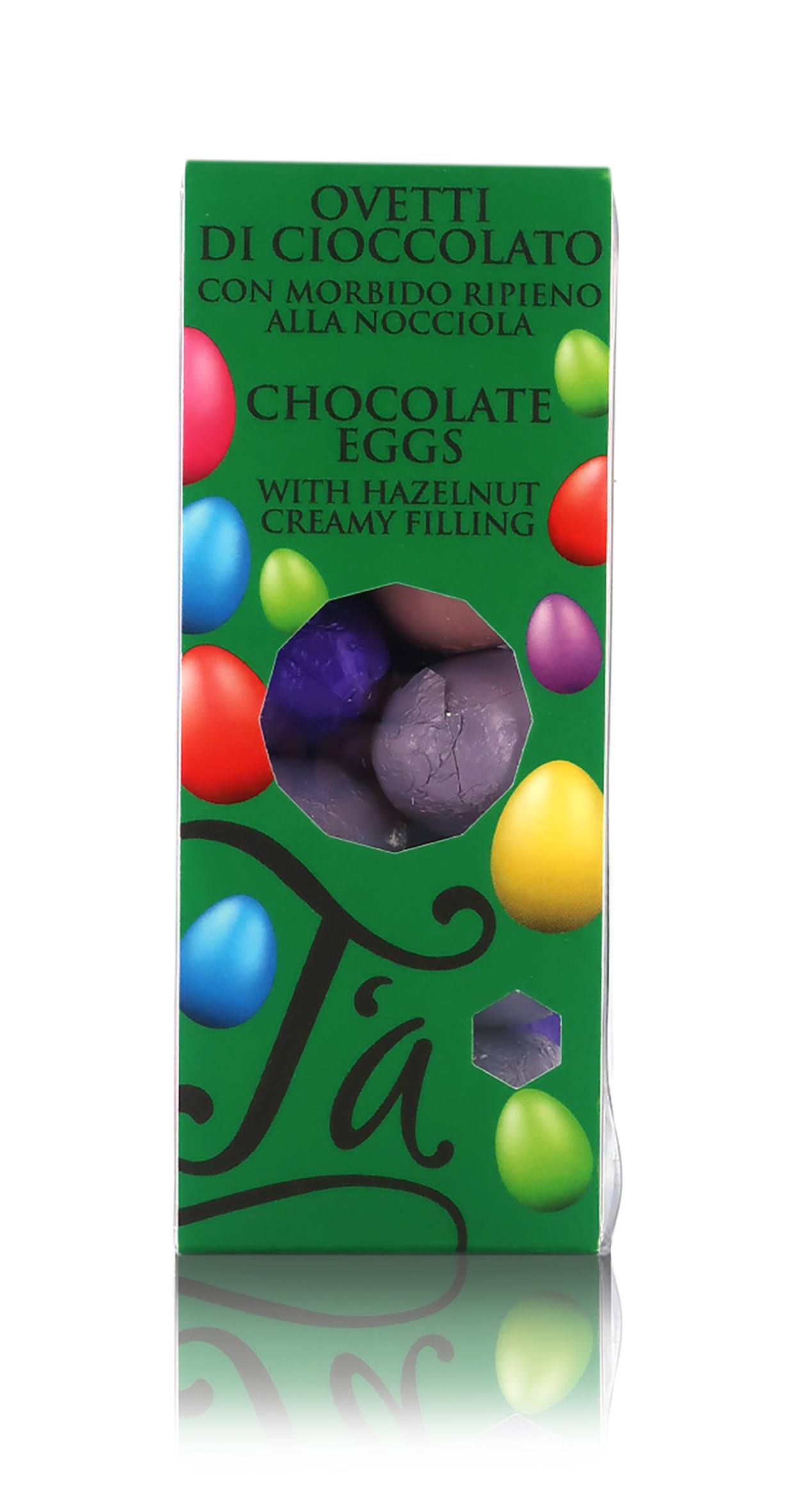 Gli ovetti sono incartati in carta stagnola colorata, nelle nuance del rosa, viola e verde, e contenuti in una scatola di plastica trasparente che mette in bella mostra i colorati ovetti di cioccolato.