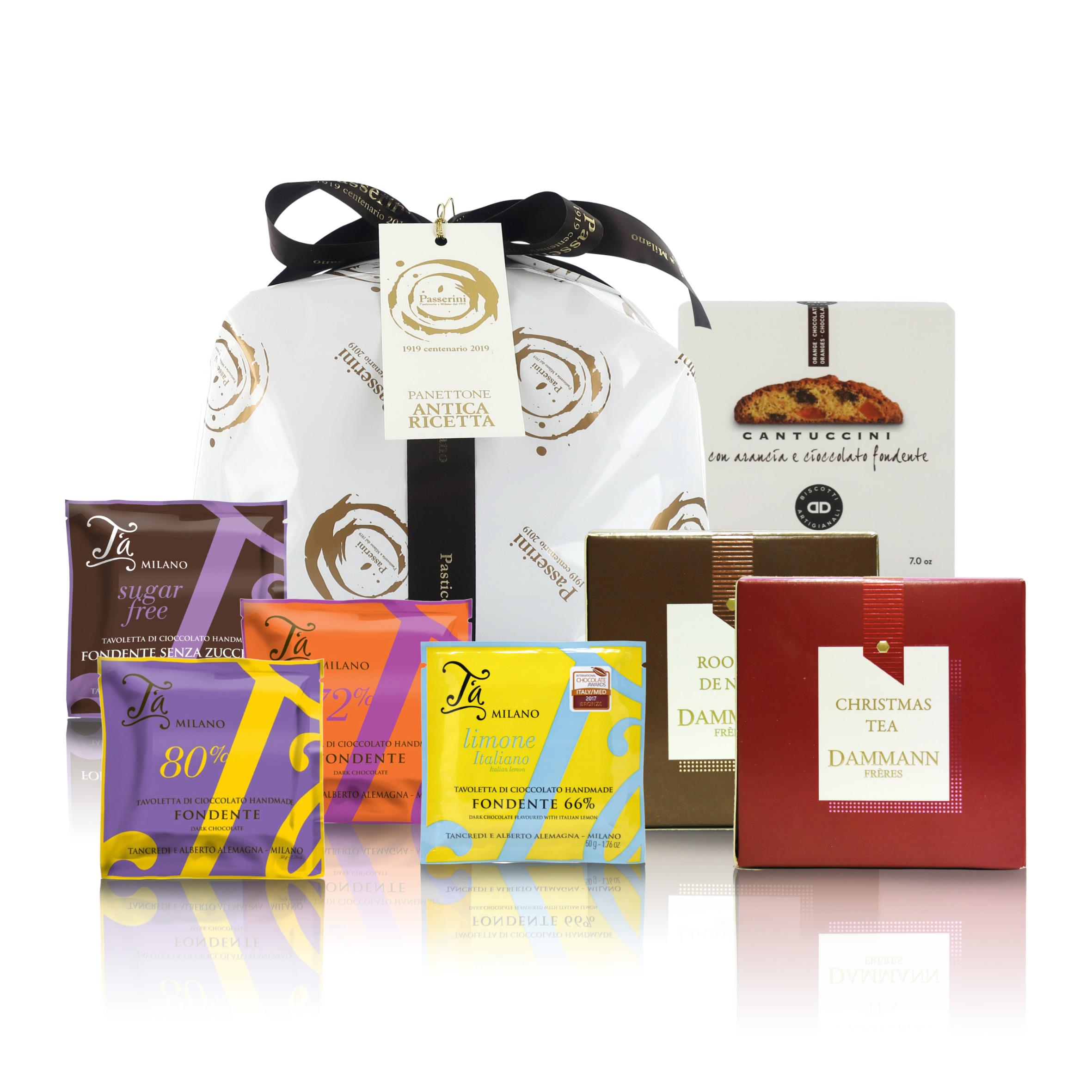 1 PANETTONE Passerini da 1kg, 4 TAVOLETTE DI CIOCCOLATO fondente T'a Milano (50g l'una, in 4 versioni: 72% / 80% / senza zucchero / 66% aromatizzato al limone italiano); 2 CONFEZIONI DI TÈ Dammann Frères [varianti: tè nero natalizio, 25 bustine (50g); rooibos natalizio, 25 bustine (50g)]; 1 confezione di CANTUCCI Deseo con arancia e cioccolato fondente (200g).