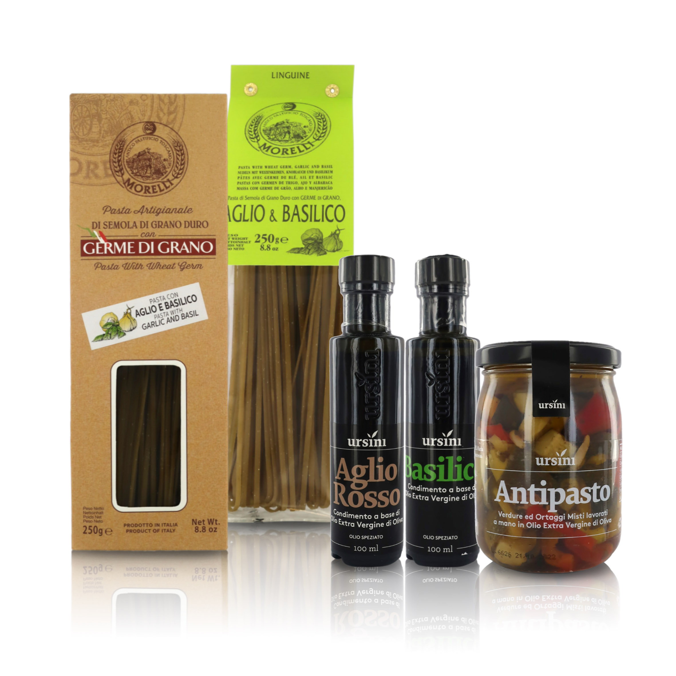 2 confezioni di PASTA Morelli all'aglio e basilico (250g per conf.); OLIO extra vergine d'oliva Ursini AROMATIZZATO al basilico (100 ml); OLIO e.v.o. Ursini AROMATIZZATO all'aglio rosso (100g); ANTIPASTO di verdure miste sott'olio Ursini (260g).