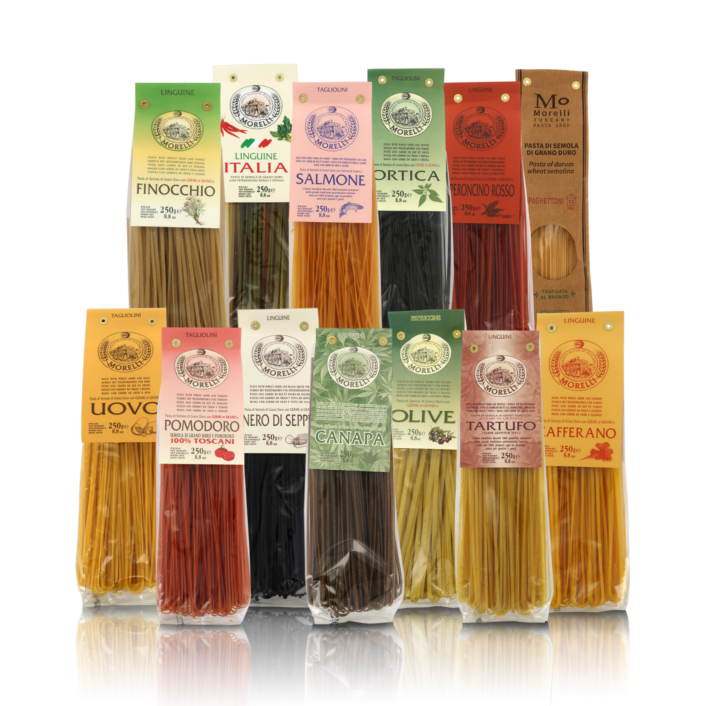 Linguine al Tartufo 250g / Linguine al Finocchio 250g / Linguine allo Zafferano 250g / Linguine Italia 250g / Tagliolini al Salmone 250g / Tagliolini alle Ortiche 250g / Linguine al Peperoncino Rosso 250g / Fettuccine alle Olive 250g / Tagliolini all'Uovo 250g / Pasta di Semola di Grano Duro, Spaghettoni 500g / Tagliolini al Pomodoro 250g / Linguine al Nero di Seppia 250g / Linguine alla Canapa 250g.