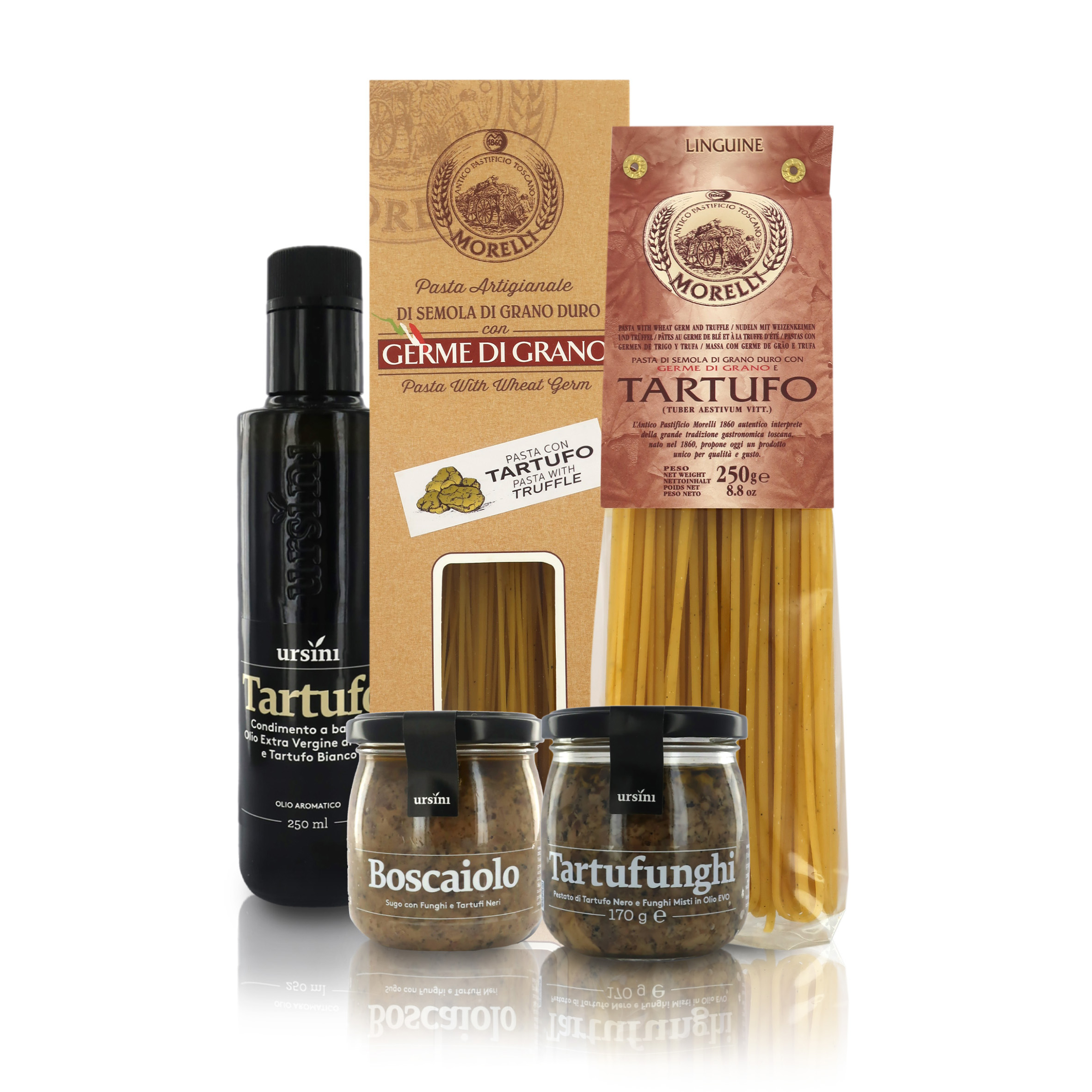 2 confezioni di Pasta Morelli al tartufo (250g per conf.); olio extra vergine d'oliva Ursini aromatizzato al tartufo bianco (250 ml); Pestato Tartufunghi Ursini - pâté di funghi e tartufo con olio extra vergine d'oliva (170 g); Sugo Boscaiolo - condimento ai funghi (170 g).