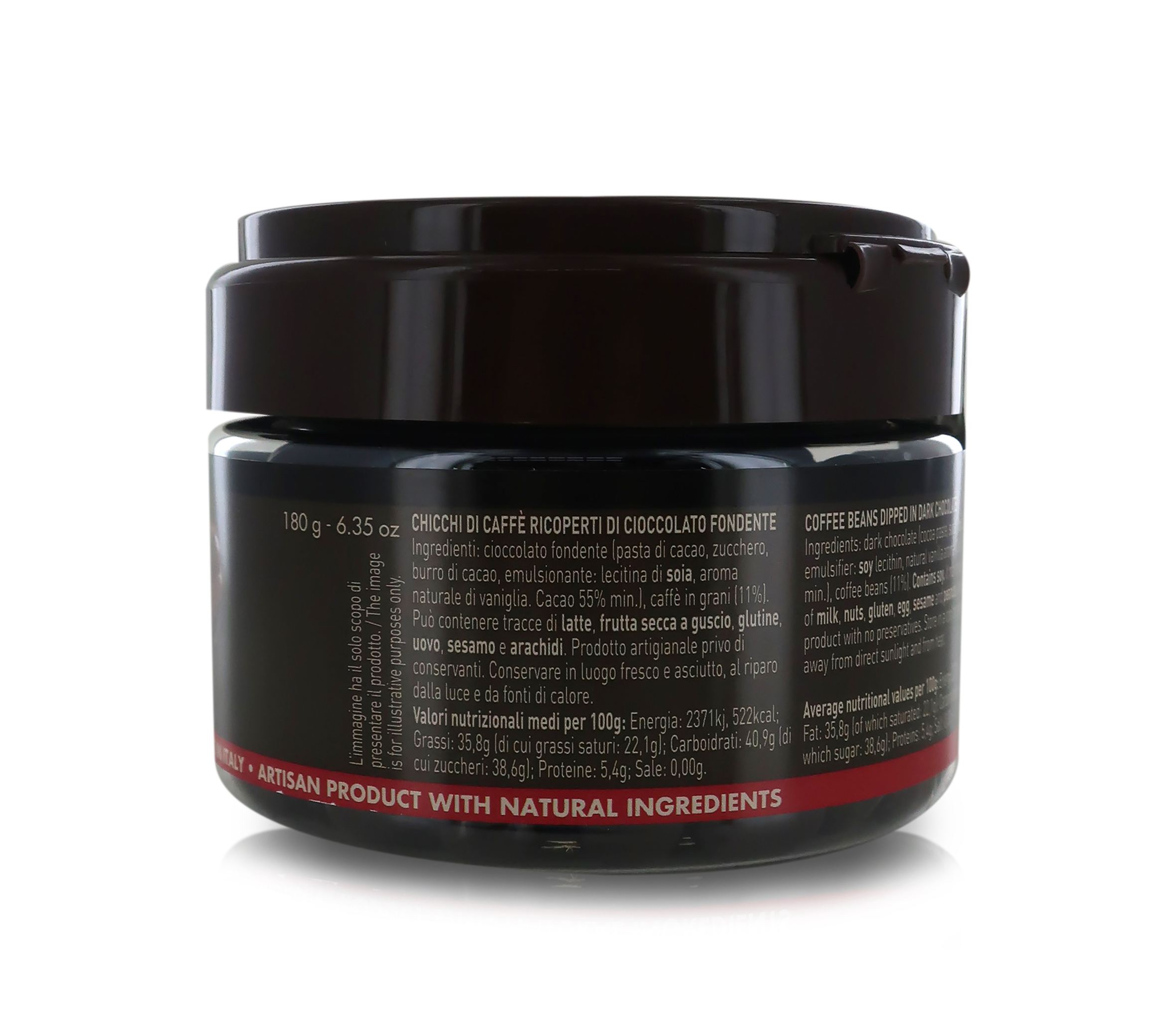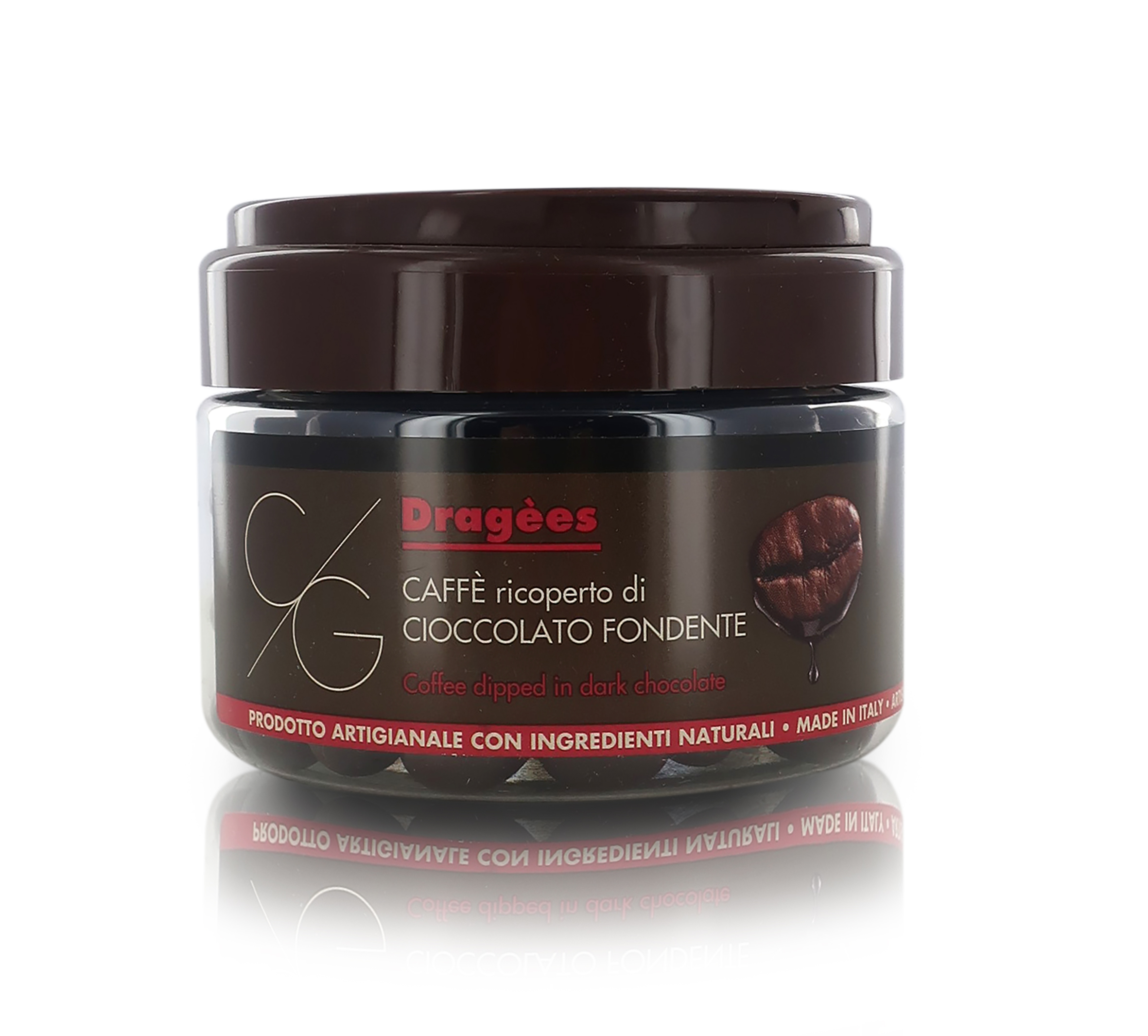 Dragées realizzati con chicchi di caffè e una copertura di cioccolato fondente, in barattolo da 180g.