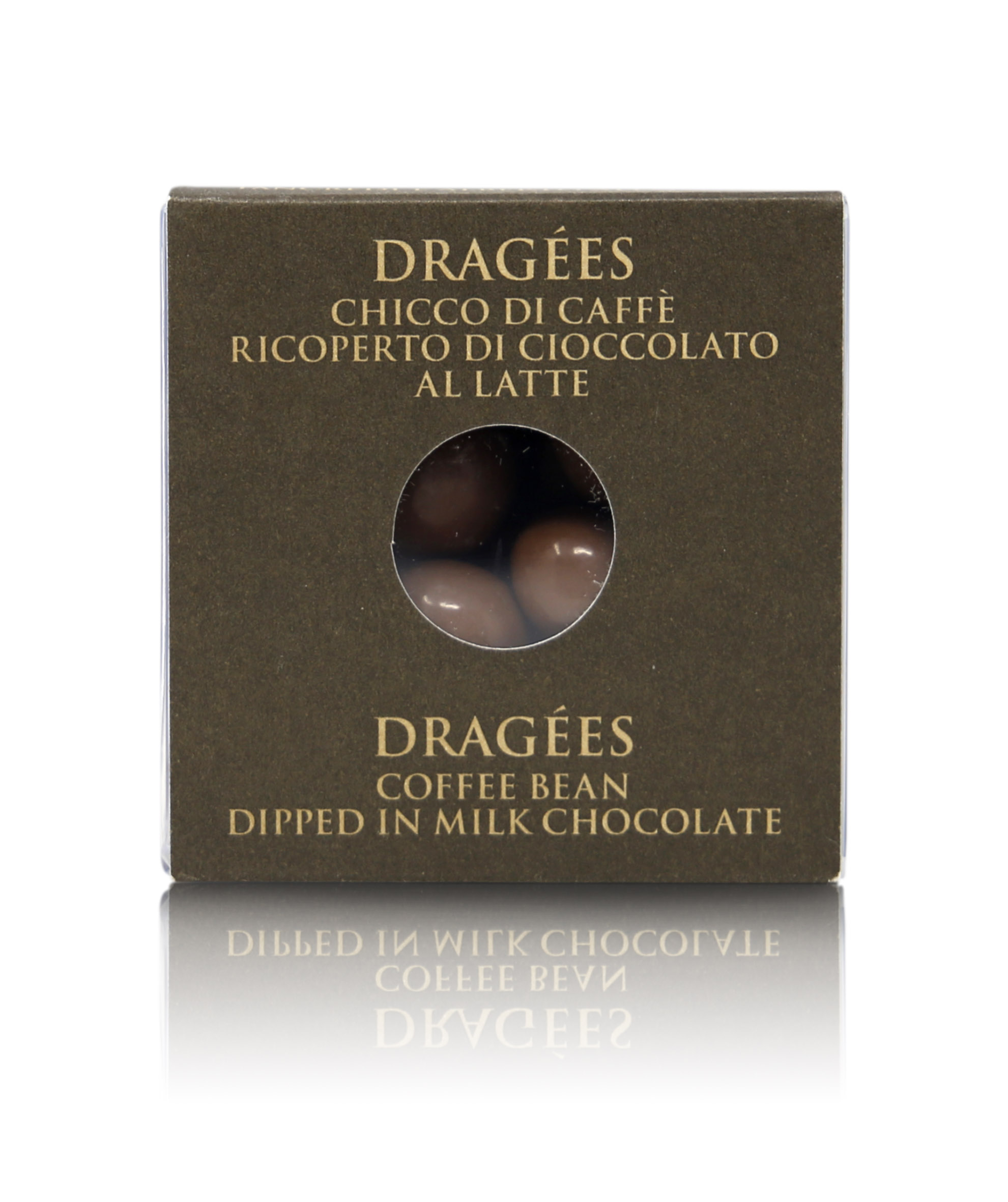 Una moderna confezione a forma di cubo, grazie ad alcuni lati trasparenti, lascia intravedere questi deliziosi chicchi di caffè ricoperti di cioccolato al latte (cacao: 36% minimo). I Dragées di T'a Milano sono perfetti da offrire ai vostri ospiti insieme al caffè o come piccolo regalo per gli amanti della piccola pasticceria. Se ne consiglia anche l'inserimento in cesti gastronomici gourmet magari contenenti esclusivamente prodotti d'eccellenza italiani; la piccola scatolina farà un figurone sia in cesti prettamente dolci, ma anche in cesti misti con specialità salate. La linea Dragées di T'a Milano fa incontrare cioccolato bianco, al latte o fondente di altissima qualità con frutta secca, con l'obiettivo di soddisfare qualsiasi gusto in fatto di dolcezza! "T'a Milano" è la firma della giovane ma tradizionale azienda di pasticceria e cioccolateria artigianale milanese che tutt'ora crea orgogliosamente le proprie delizie nei territori della provincia della Madunina. È un marchio che incorpora tanto la storia quanto la voglia d'innovazione, offrendo prodotti di altissimo livello che rientrano a pieno titolo in quel Made in Italy culinario che diventa eccellenza. Il motto di Tancredi e Alberto Alemagna, non a caso, è "italianità, qualità e design". Il loro è un cioccolato pluripremiato, che ha ottenuto diversi riconoscimenti di settore tra cui vari International Chocolate Award e premi Tavoletta d'Oro.