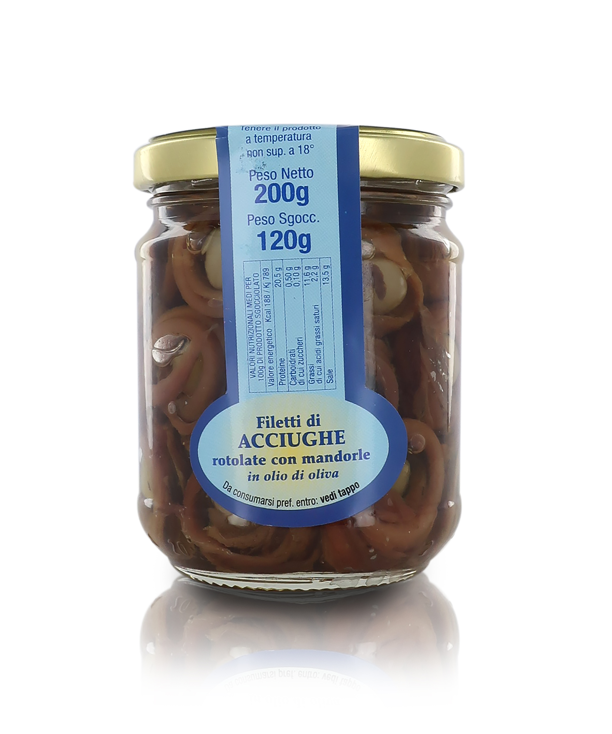 Filetti Di Acciughe Arrotolati Con Mandorla, In Olio D'Oliva, Vasetto Di Vetro, 200 Grammi