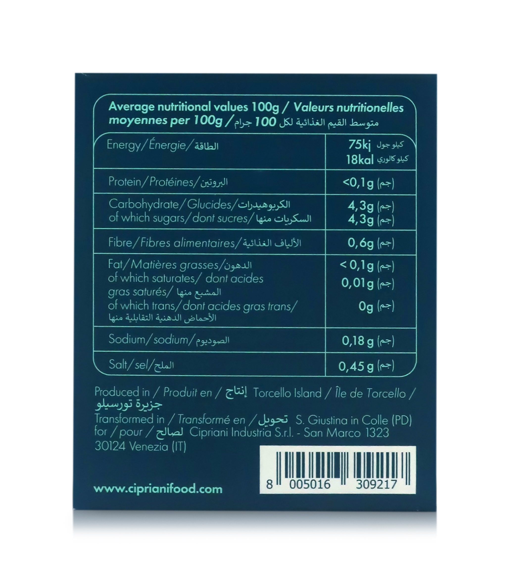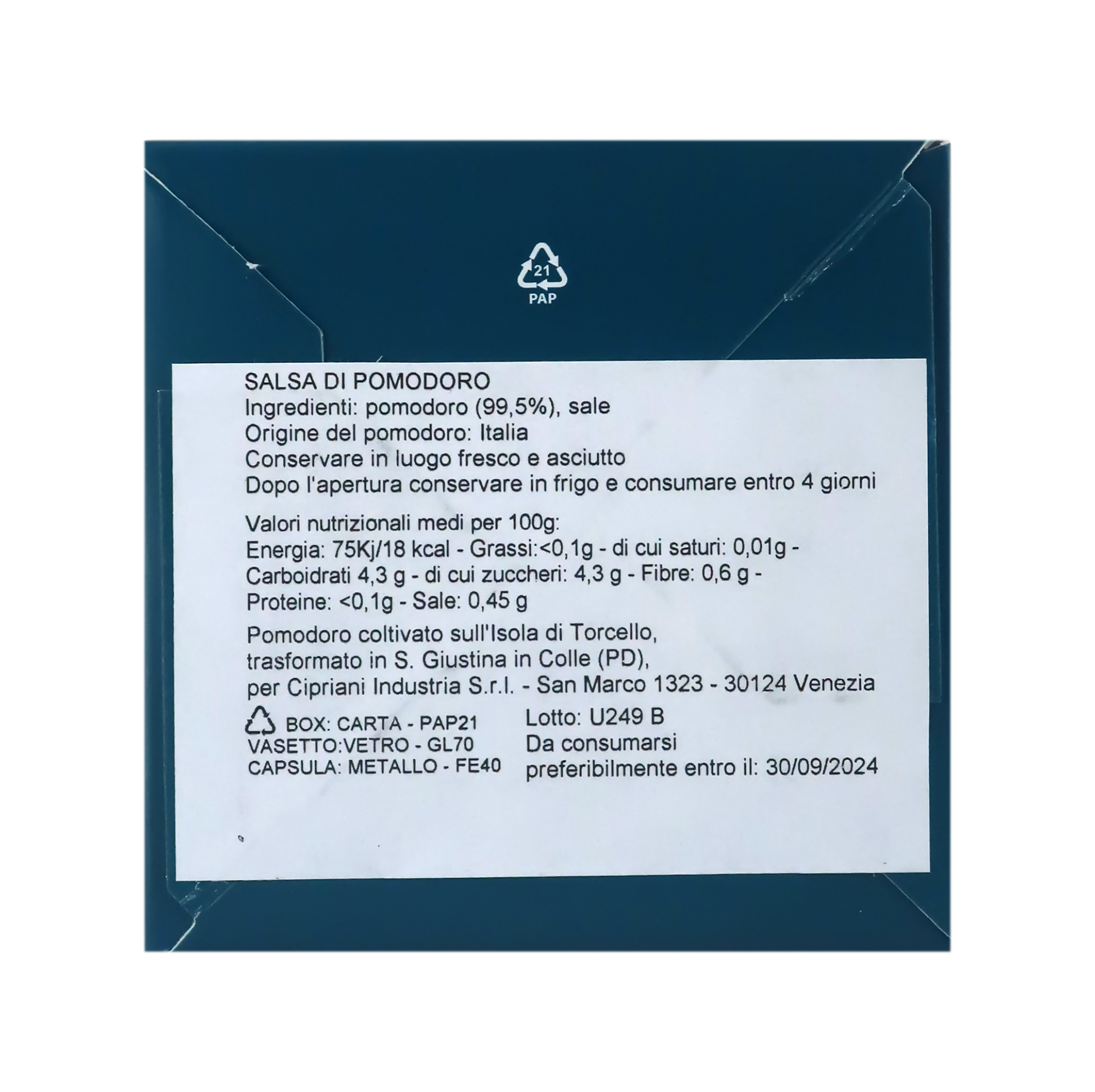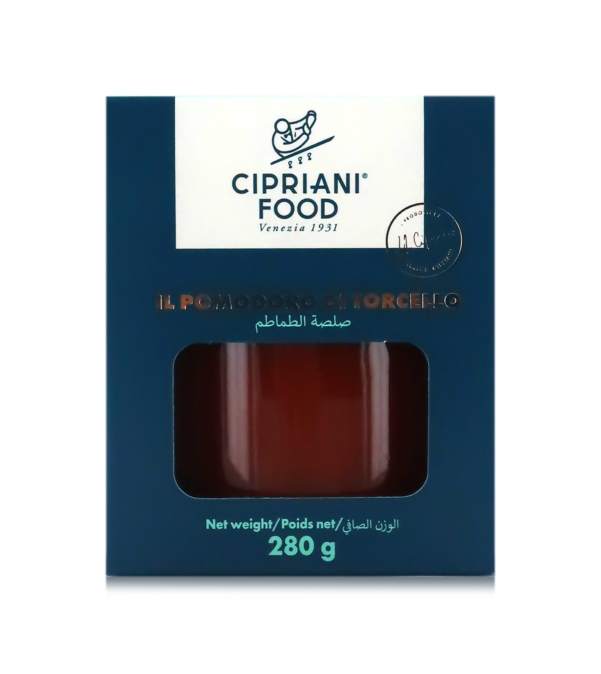 Il Pomodoro di Torcello nasce nell’isola più affascinante e selvaggia della Laguna di Venezia, la quale vanta due eccellenze: il carciofo violetto ed il pomodoro, dei prodotti unici, dal sapore audace e inaspettato. Questa passata è ottenuta da pomodoro italiano lavorato con cura ed è perfetta per condire la pasta in modo sano o come base per preparare una salsa genuina. Vengono selezionati i migliori pomodori direttamente dai campi dell’isola di Torcello. I pomodori di Cipriani, coltivati in laguna, assimilano dal terreno una spiccata sapidità che la rapida lavorazione trasferisce direttamente nel vasetto di questa eccellente passata di pomodoro e nei vostri piatti preferiti. Questa passata di pomodoro di Torcello in comodo barattolo da 280g è accompagnata da una confezione ad astuccio, che la rende perfetta anche come articolo gastronomico da inserire in cesti gastronomici personalizzati.