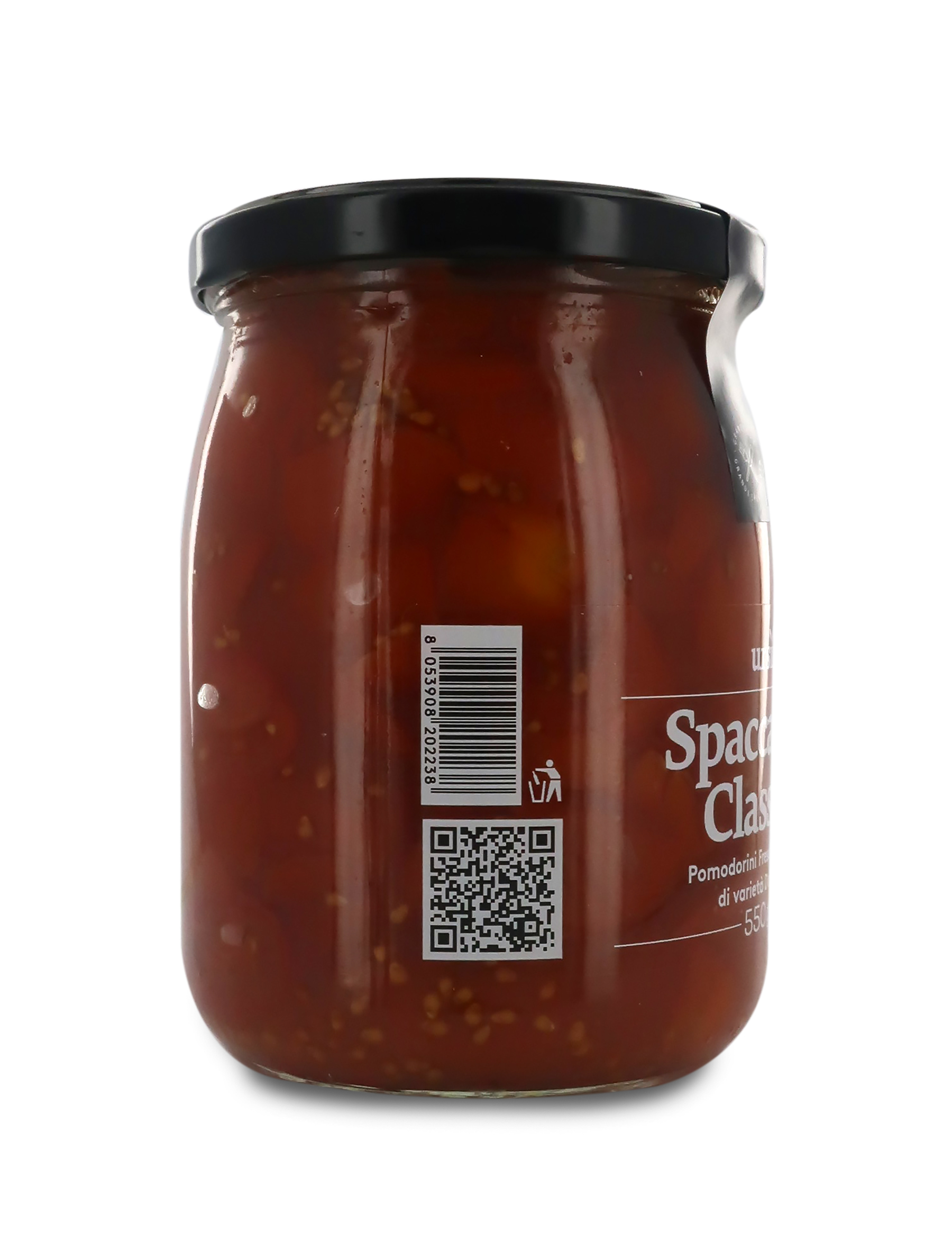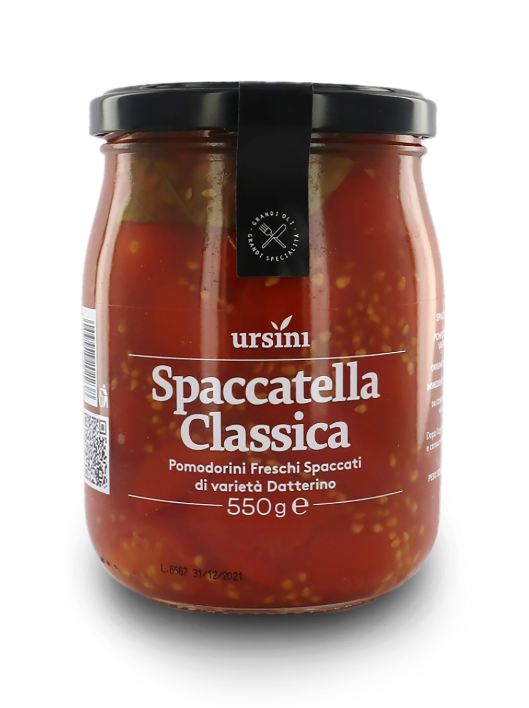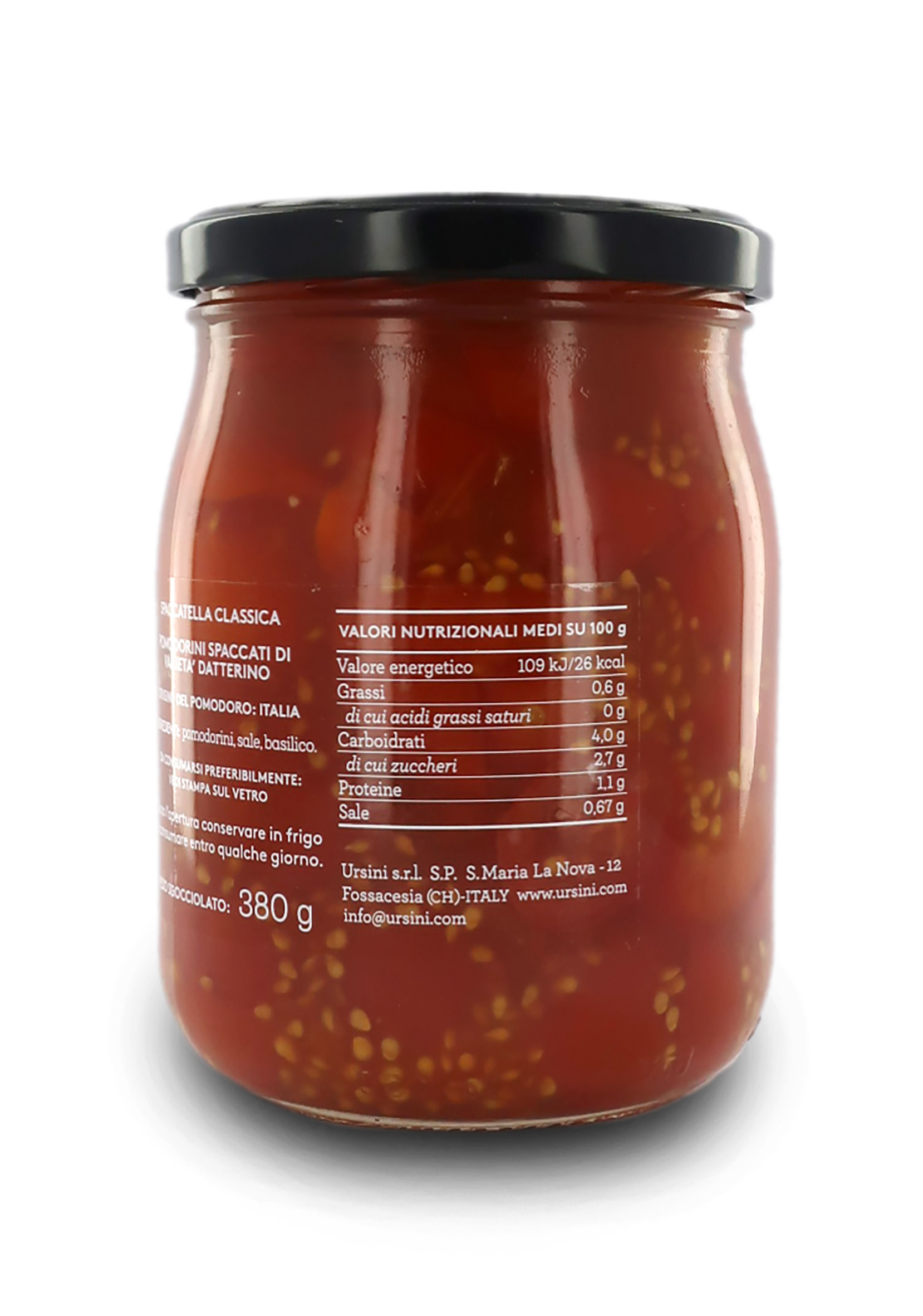 La Spaccatella Classica di Ursini contiene pomodorini tondi piccoli della varietà Datterino raccolti in Italia, opportunamente lavati, "spaccati" a metà e conservati in succo di pomodoro aromatizzato con basilico.