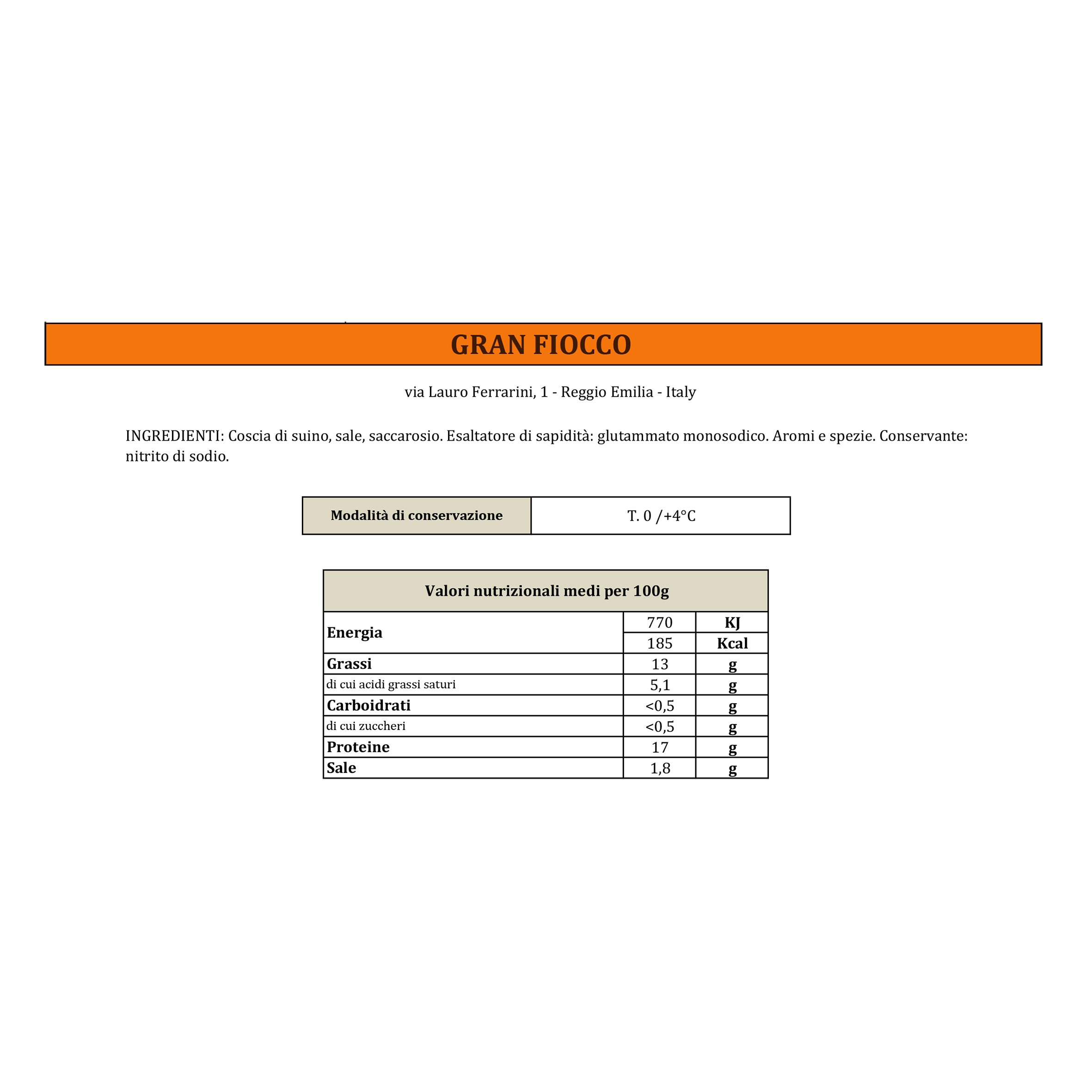 Il prodotto cotto Gran Fiocco Ferrarini è un prodotto di alta qualità e dal sapore eccezionale, realizzato esclusivamente con la parte nobile della coscia di suino, la stessa che si utilizza per produrre il culatello. Questo prodotto cotto è realizzato con carne suina selezionata. La sua stagionatura avviene in modo naturale e lento, seguendo le tradizionali tecniche di produzione italiane. La carne è morbida e succosa, di colore rosa chiaro con una leggera sfumatura dorata sulla superficie. Il profumo delicato e la consistenza morbida lo rendono un prodotto versatile e apprezzato in cucina. Il Gran Fiocco Ferrarini si presta perfettamente per la preparazione di antipasti, tramezzini, insalate e piatti caldi. Grazie alla sua consistenza morbida, si presta anche per la preparazione di gustosi panini, arricchiti da salse e verdure fresche. Il prodotto cotto Gran Fiocco Ferrarini è prodotto con ingredienti di alta qualità e rispettando i più alti standard di sicurezza alimentare. Inoltre, la confezione sottovuoto garantisce la conservazione del prodotto, mantenendo inalterati il suo aroma e il suo sapore. Il Gran Fiocco Ferrarini è un prodotto cotto di grande prestigio, apprezzato in tutto il mondo per la sua qualità e bontà. Un prodotto che esalta il gusto della tradizione italiana e che non può mancare sulla tavola degli amanti della buona cucina.